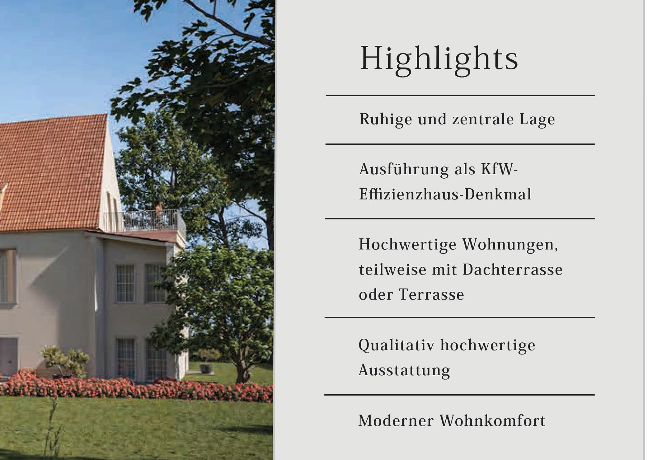 Inicio de obra: 2.º trimestre de 2026. Finalización: diciembre de 2027. Desarrollo conforme al estándar de eficiencia energética KfW para edificios históricos protegidos.