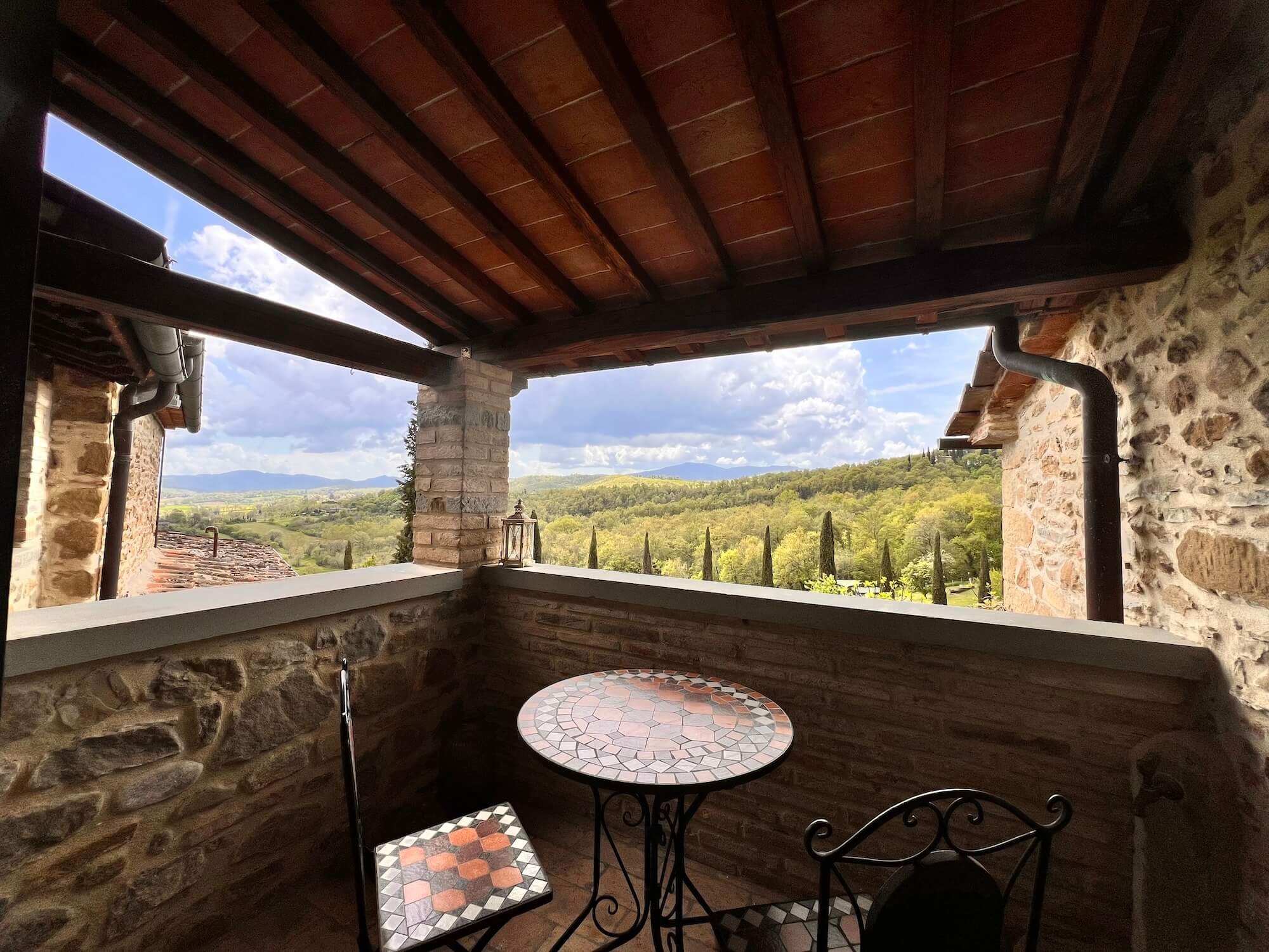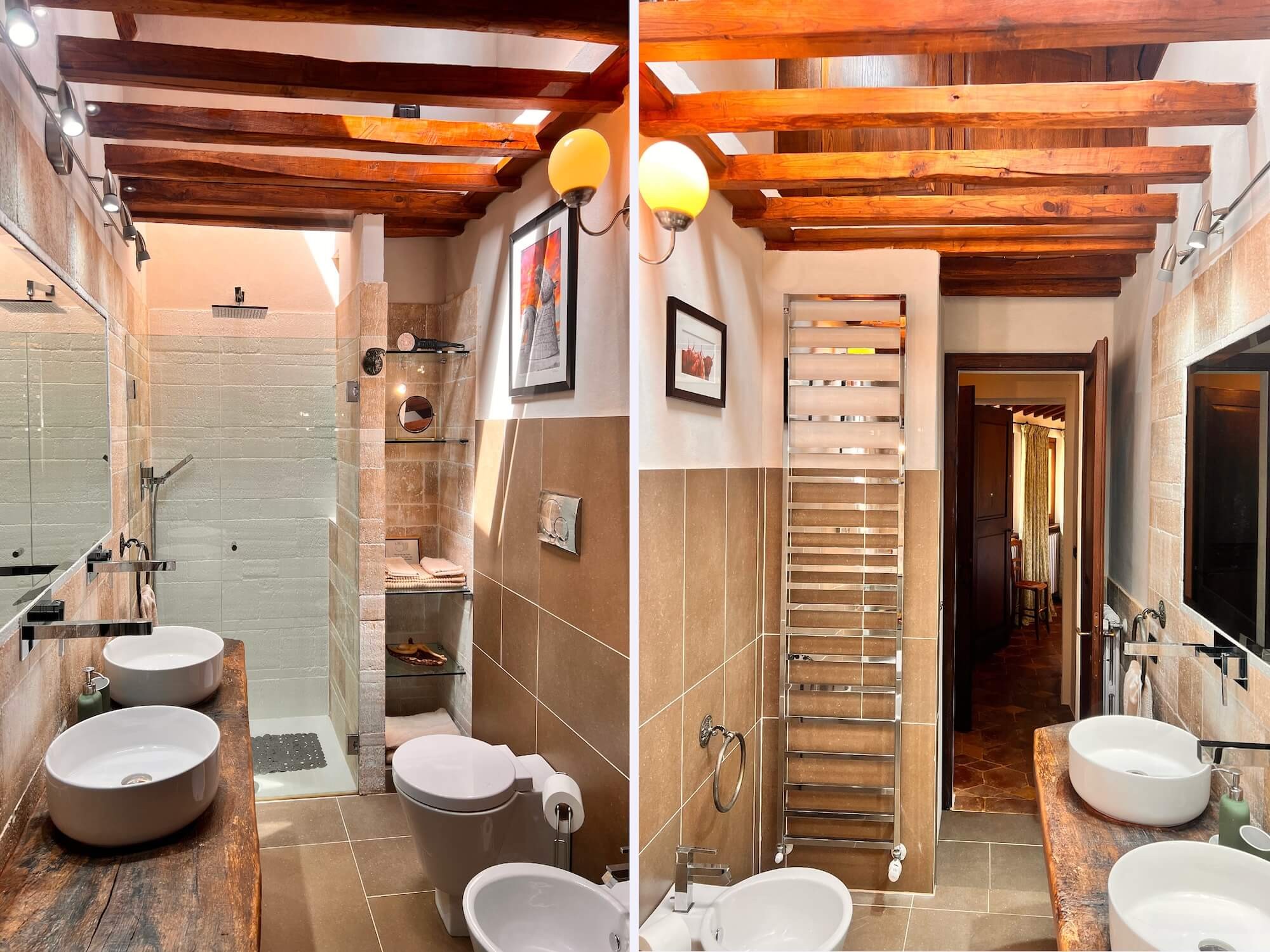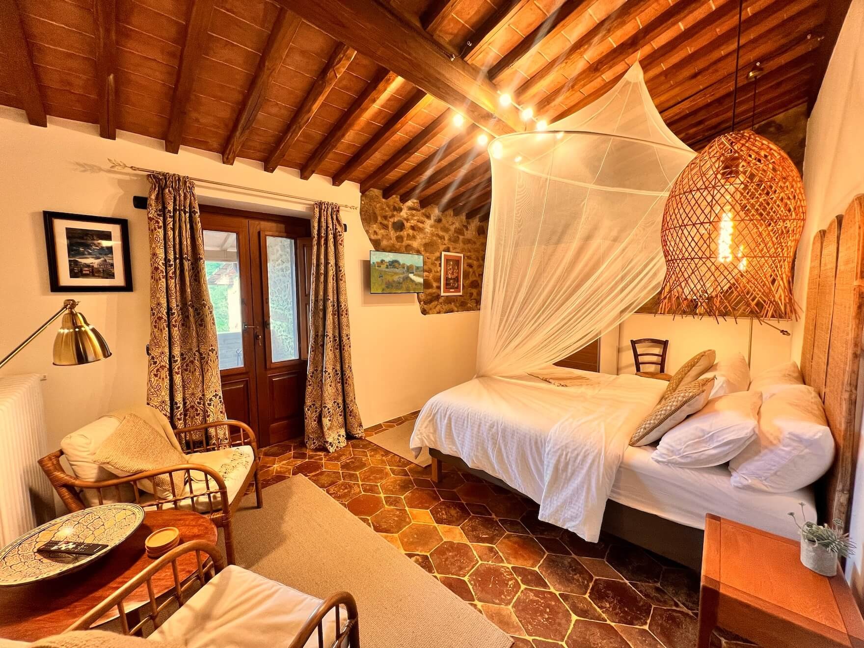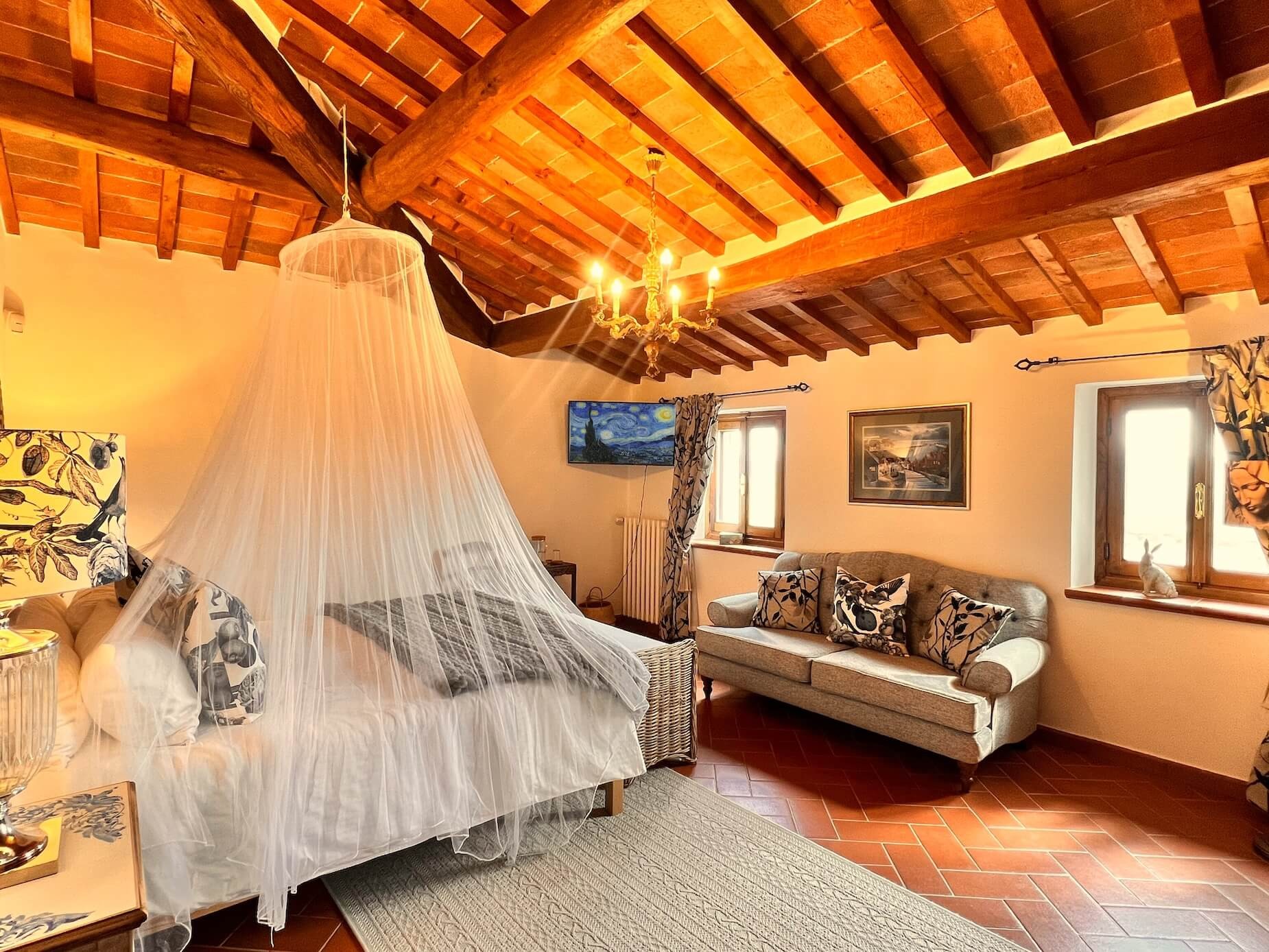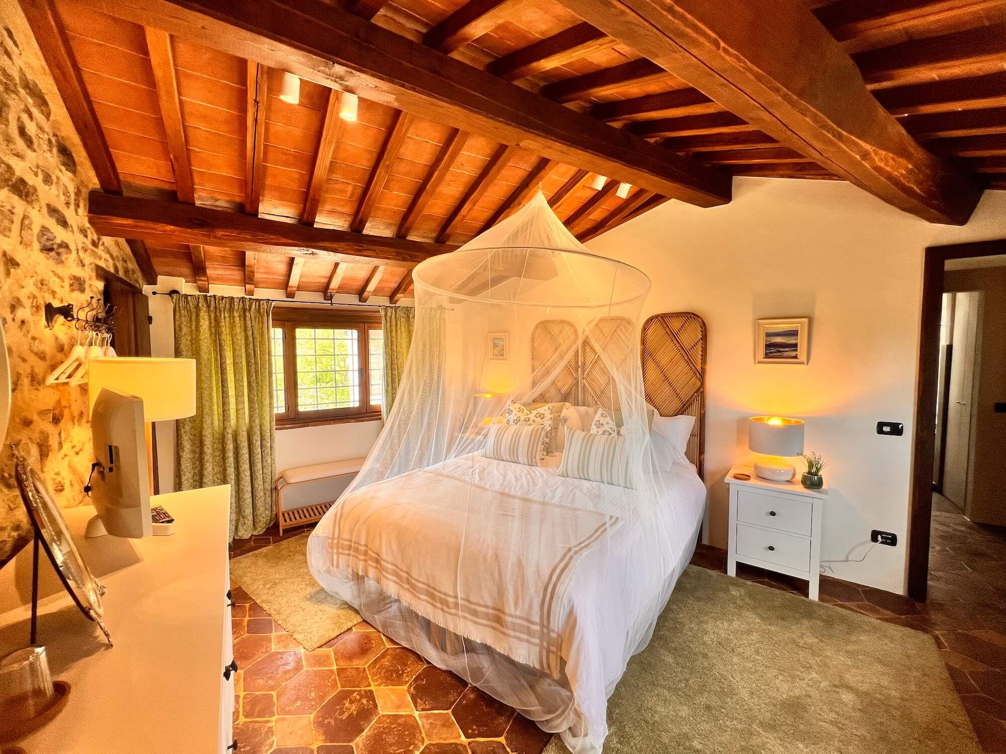 Ristrutturata con cura e arredata con gusto, la casa principale combina fascino tradizionale e comfort moderno. Una cucina a doppia altezza con grande finestra affacciata sul giardino e sulle colline, completa di più forni, doppio piano cottura e due lavastoviglie, si apre su un soggiorno con camino, sala da pranzo e un ulteriore salotto utilizzabile come terza camera. Ai piani superiori, un secondo soggiorno con balcone accompagna la suite padronale con travi a vista e vista panoramica, mentre una camera ospiti al piano superiore dispone di bagno privato.
