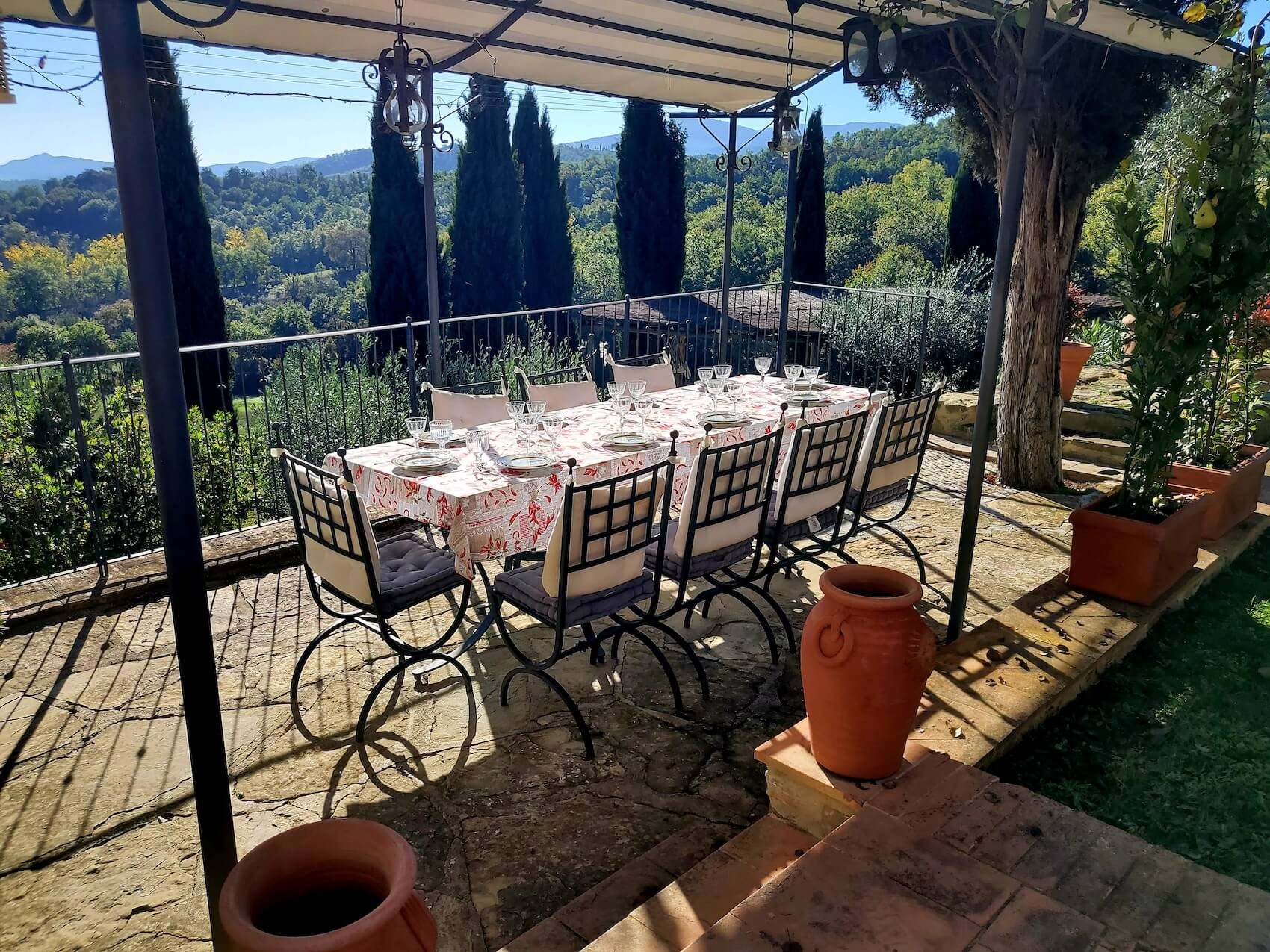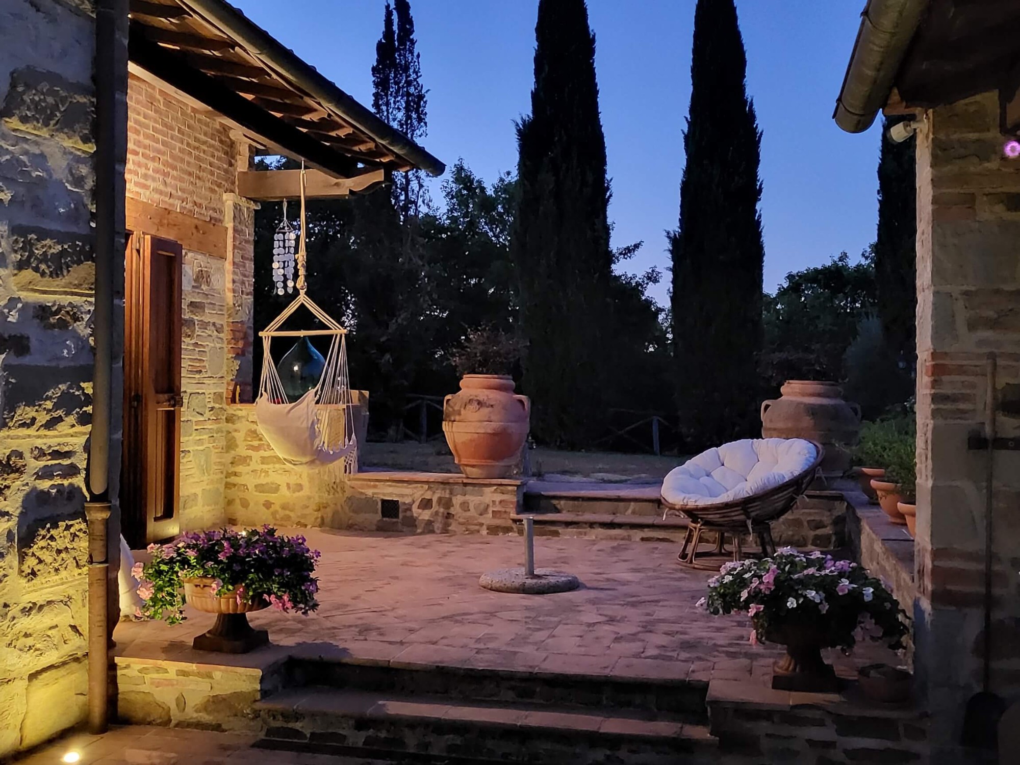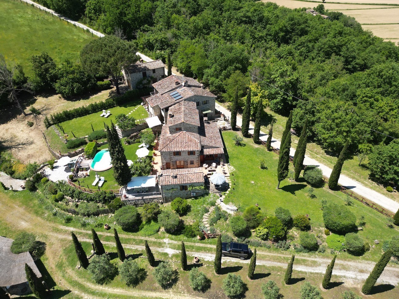 La proprietà trasmette un’atmosfera di lusso discreto. Otto terrazze offrono molteplici possibilità per pranzi e cene all’aperto, molte con accesso diretto alla cucina. Il terreno, incorniciato da filari di cipressi, comprende alberi da frutto, flora tipica toscana, due piccoli vigneti e oltre cento ulivi. I boschi forniscono funghi, tartufi e legna a sufficienza per l’inverno. Completano gli spazi ricreativi un edificio in pietra trasformato in palestra e sauna climatizzata.