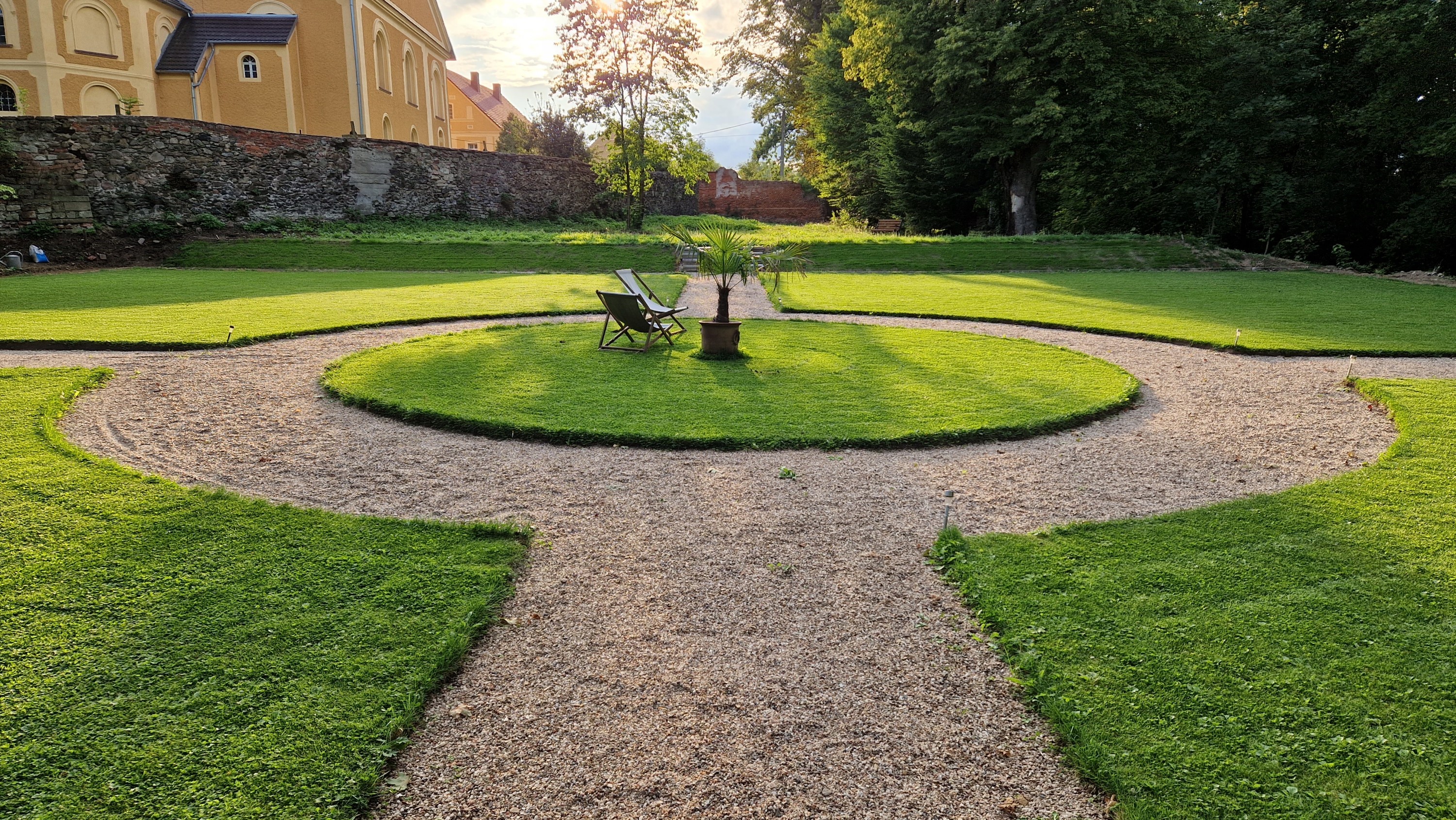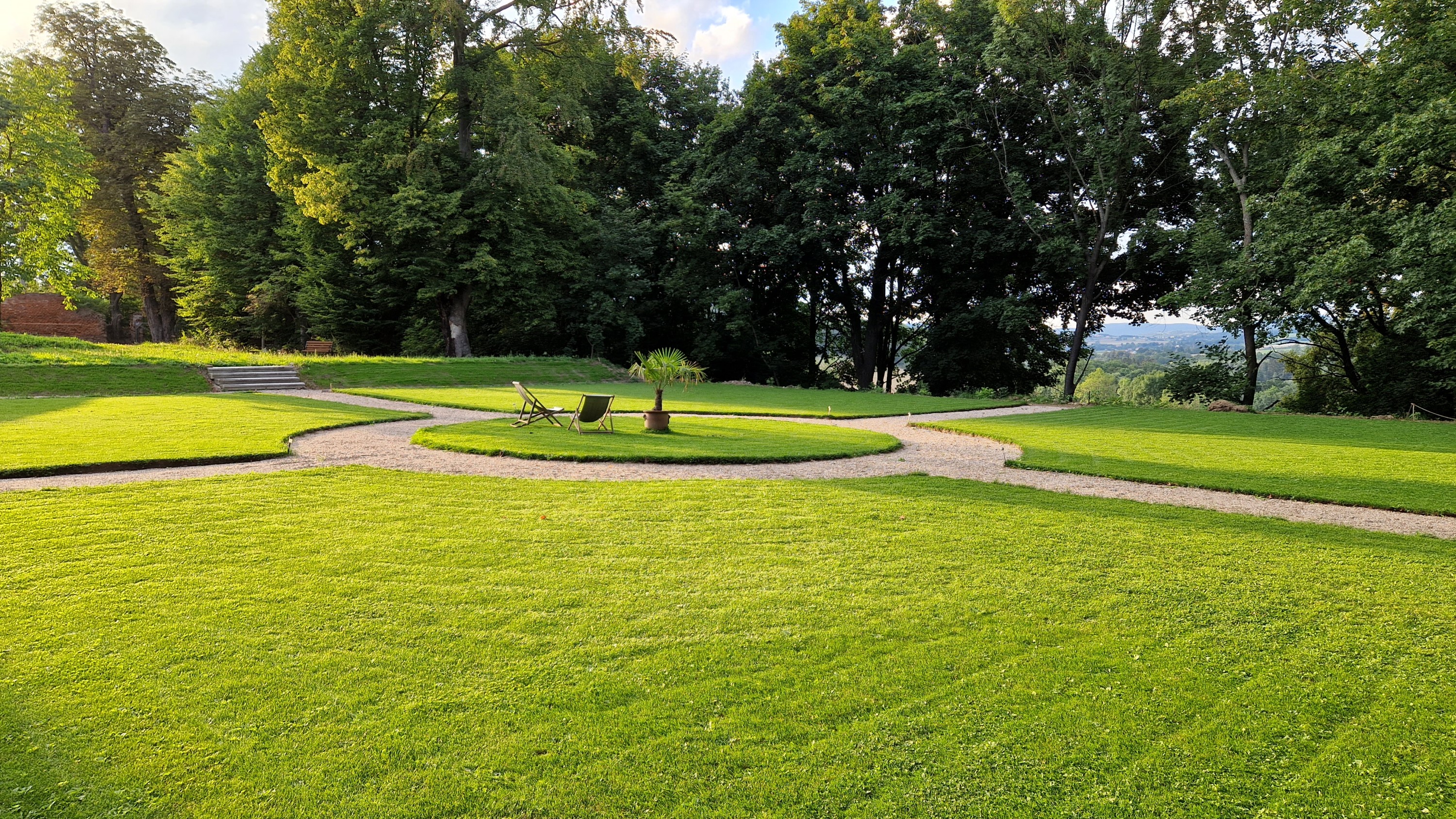 El complejo de jardines barrocos en terrazas con pabellón de jardín rococó desciende abruptamente hacia el río y recuerda a los magníficos jardines del castillo de Fürstenstein (Książ), prueba del alto estatus del edificio desde el Renacimiento.