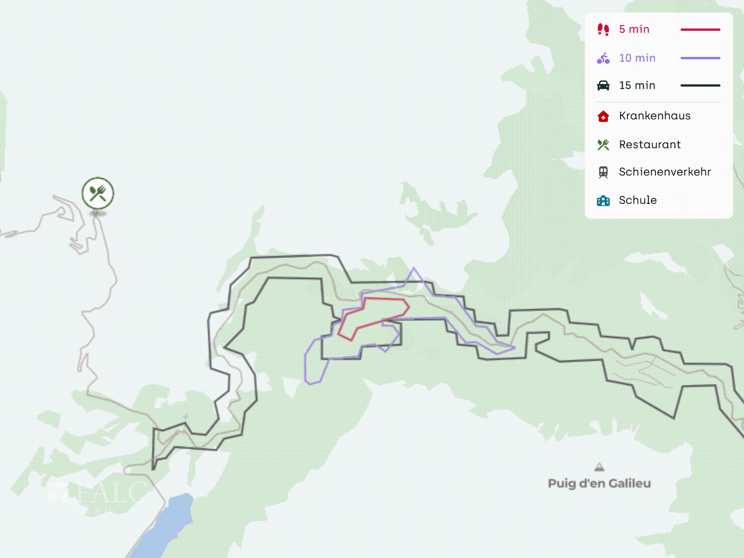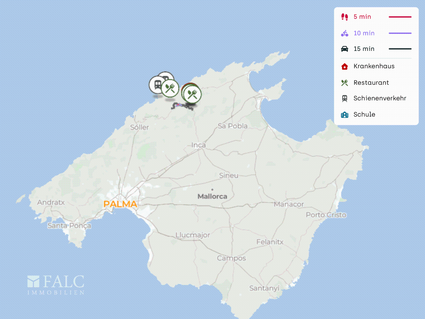 El pueblo más cercano se encuentra a unos 10 minutos en coche. En las proximidades de Lluc hay una farmacia, una clínica y la Escolania de Lluc como oferta educativa. Las playas naturales Cala Tuent y Platja del Torrent de Pareis están a pocos kilómetros y se cuentan entre los tramos costeros más espectaculares de la isla. El aeropuerto de Palma de Mallorca se encuentra a aproximadamente una hora, según la ruta.