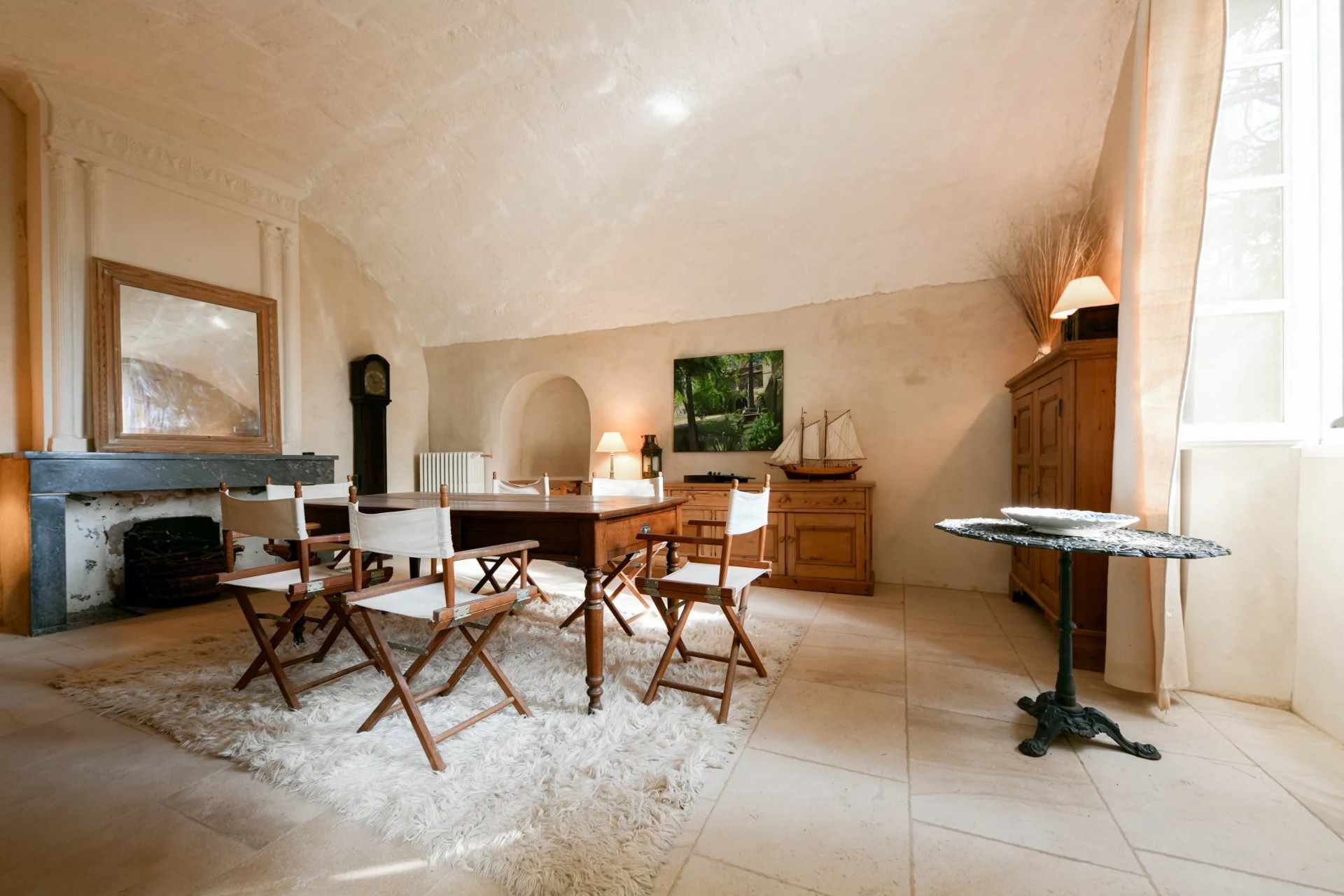 El majestuoso vestíbulo ofrece una hermosa vista del jardín. Desde allí, se accede de forma fluida a un salón privado con hermosos arcos de piedra y a un pasillo con aseo de cortesía. En el lado del jardín, se encuentra un espacioso comedor de 26 m² con una bonita chimenea decorativa, además de una cocina de verano, una estancia con techo abovedado y chimenea histórica.