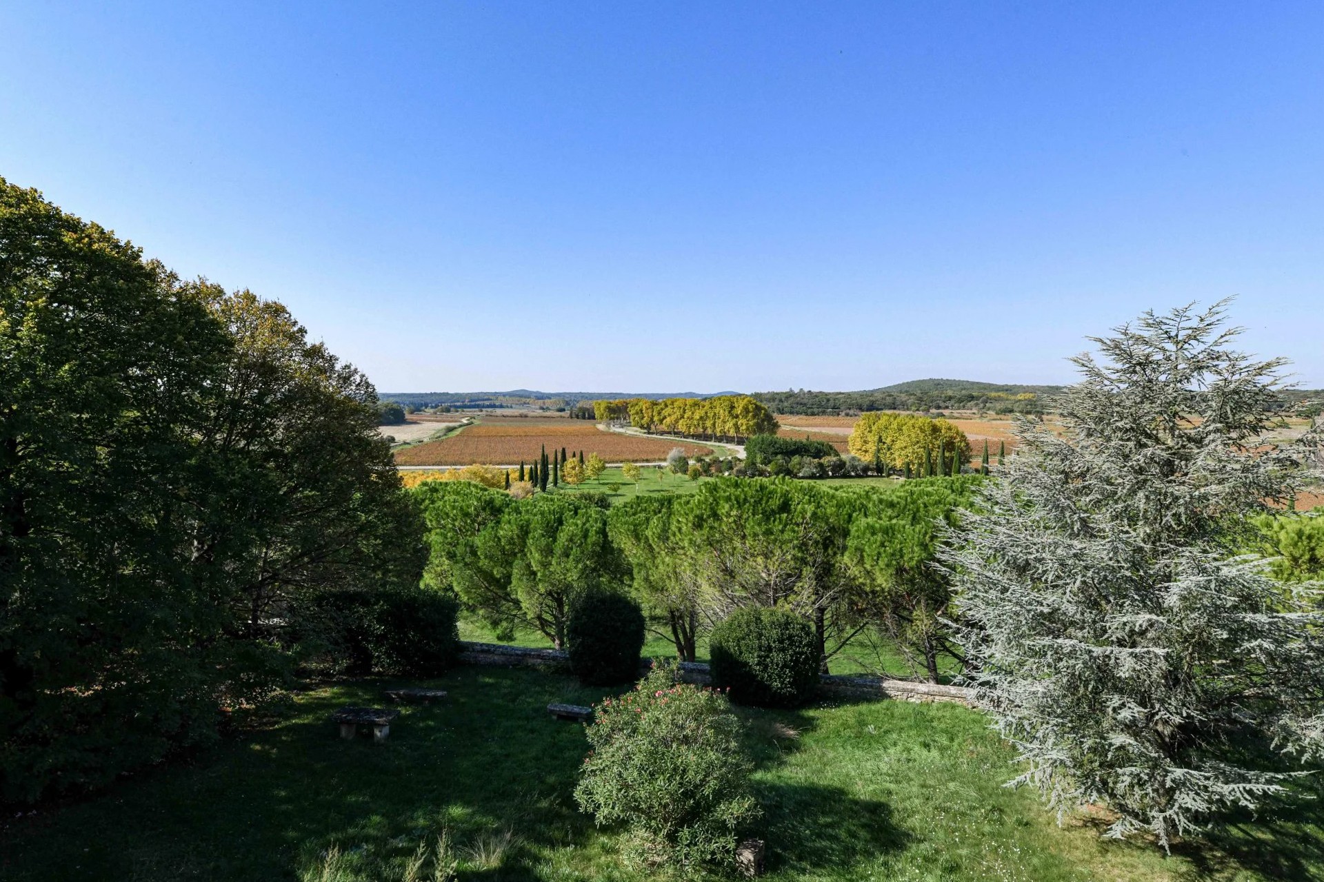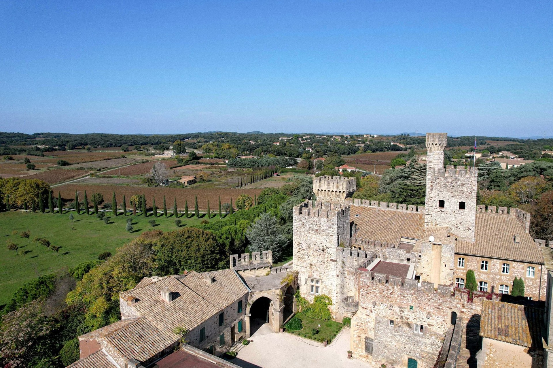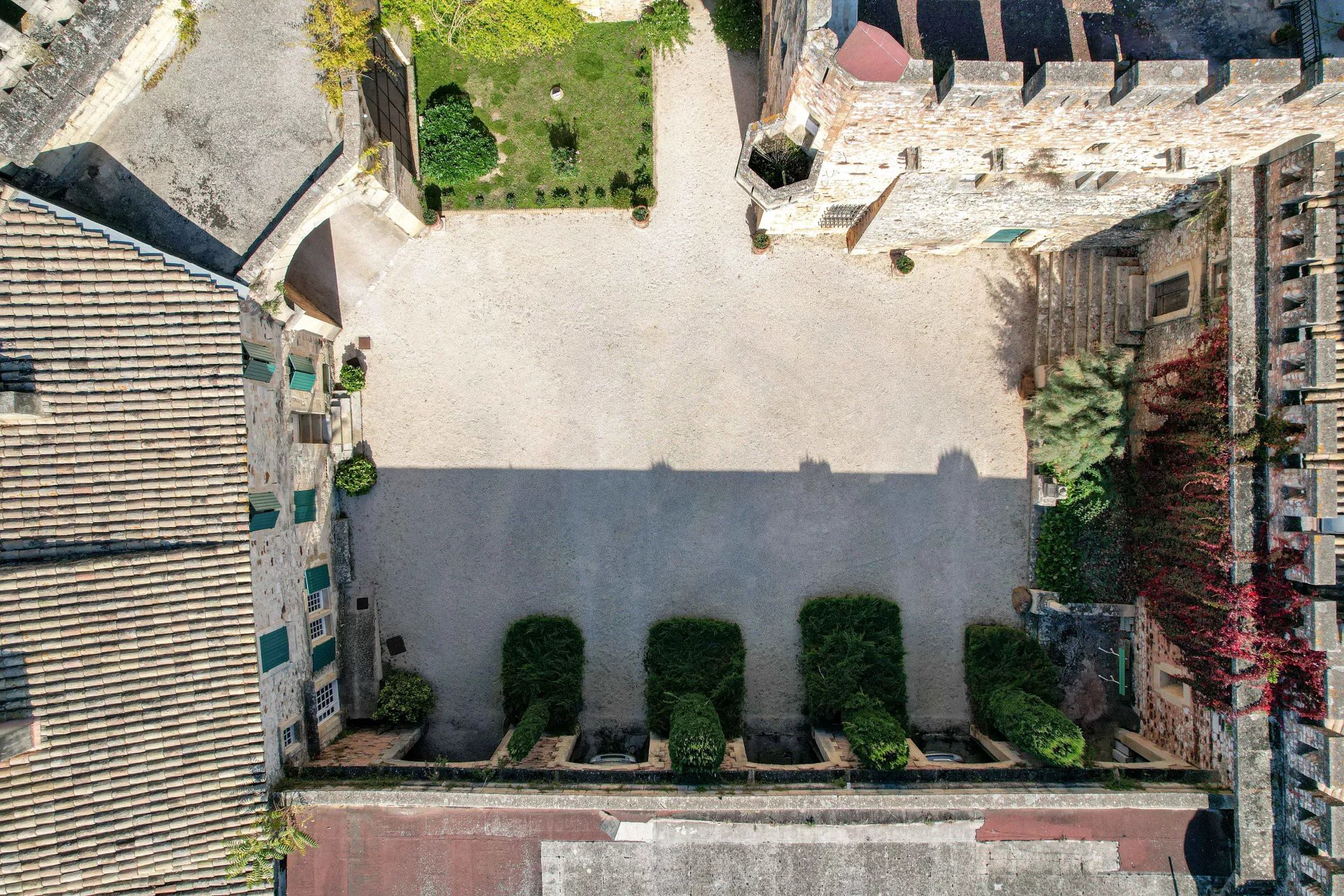 El parque amurallado se extiende sobre 1,17 hectáreas, ofreciendo la privacidad característica de estas propiedades. Desde las terrazas y las torres se disfruta de una amplia vista de la tranquila campiña entre Uzès y Avignon.