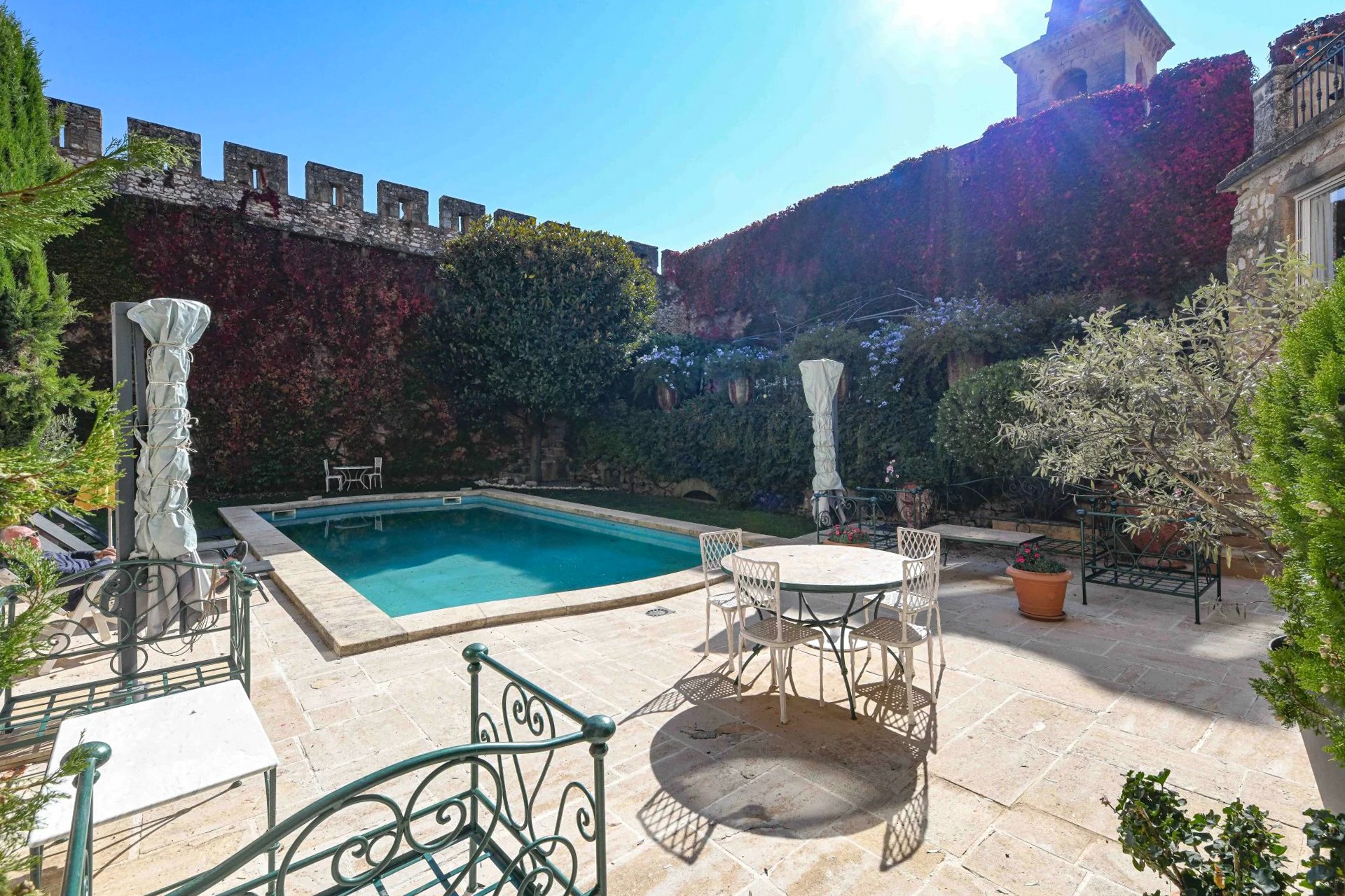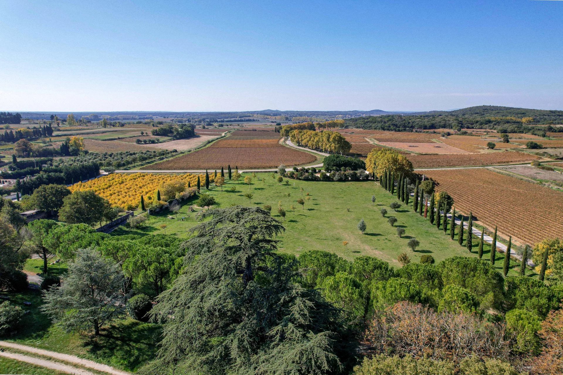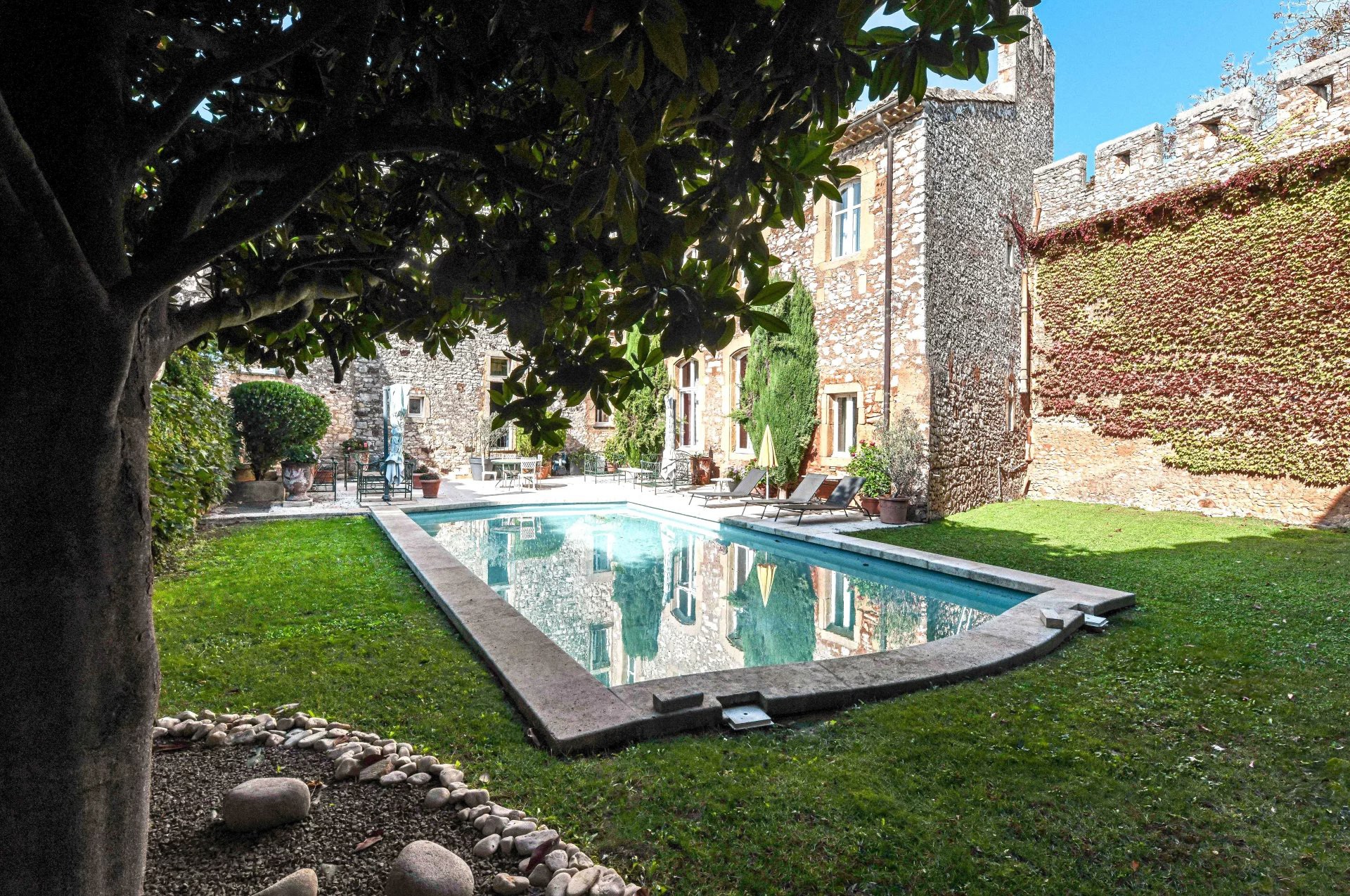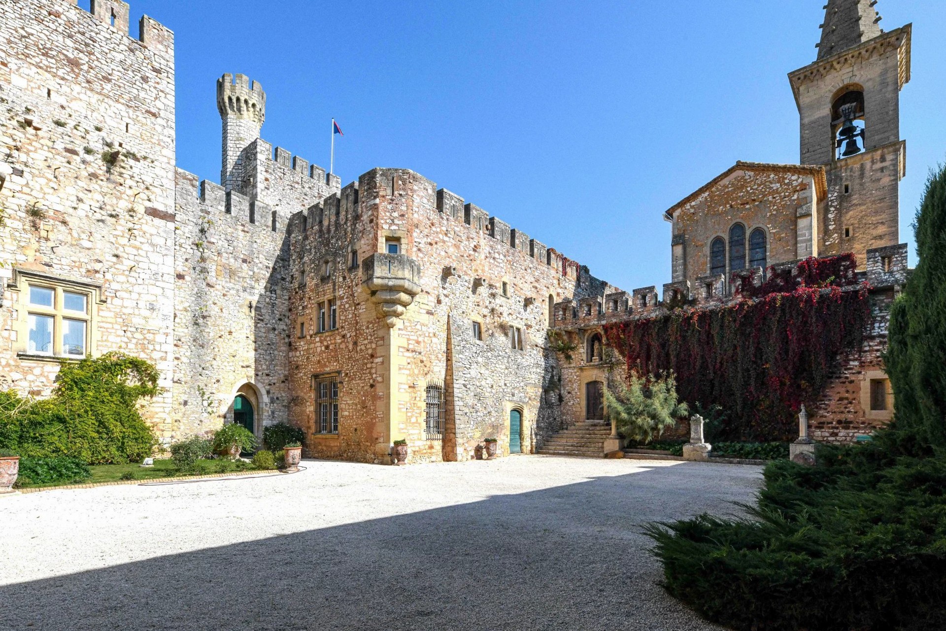 El parque amurallado se extiende sobre 1,17 hectáreas, ofreciendo la privacidad característica de estas propiedades. Desde las terrazas y las torres se disfruta de una amplia vista de la tranquila campiña entre Uzès y Avignon.