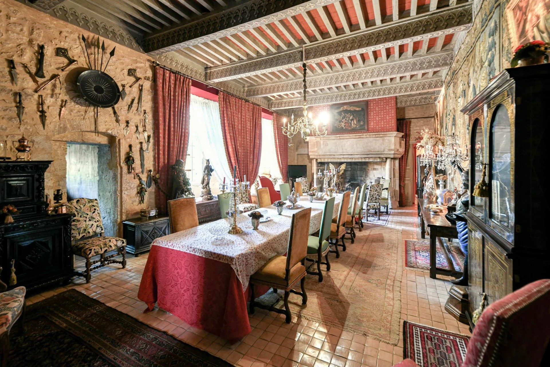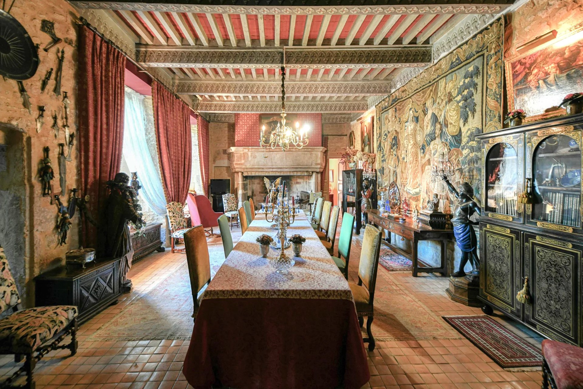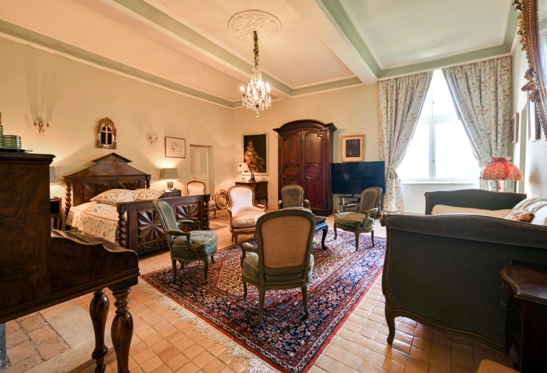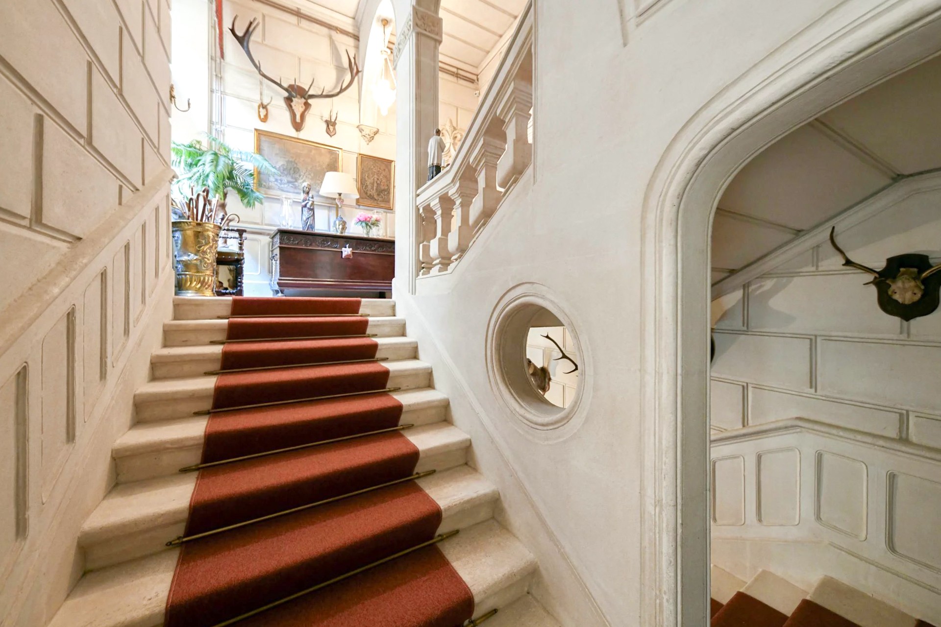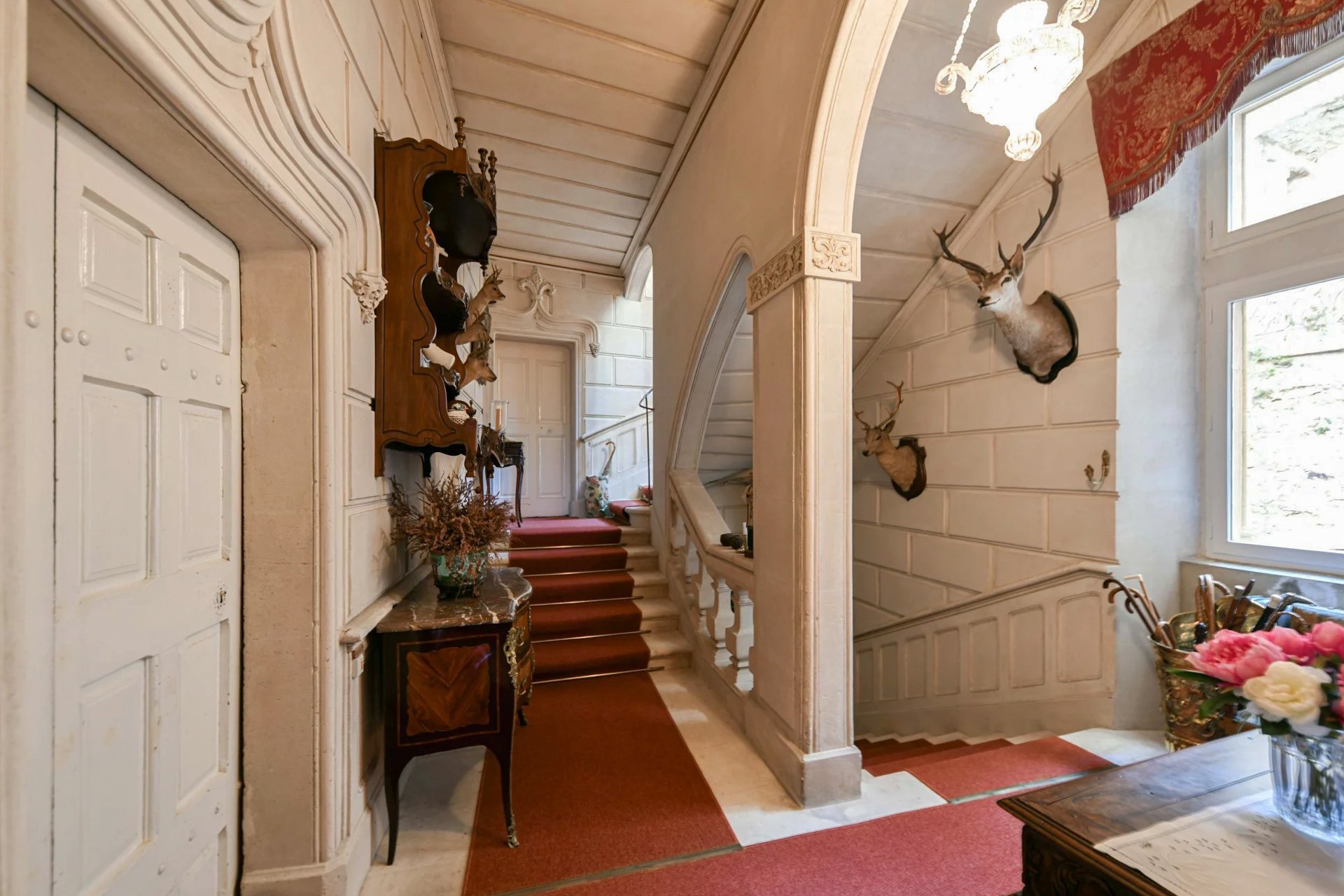 El edificio principal se desarrolla en tres niveles. En la planta baja, un amplio salón abovedado recibe con su techo original del siglo XVII. Una elegante escalera conduce al primer piso, donde se alinean los espacios de representación: dos salones con ventanas altas, un comedor con chimenea y una biblioteca. Desde un largo pasillo se accede a la suite principal de 100 m² con vistas al parque.