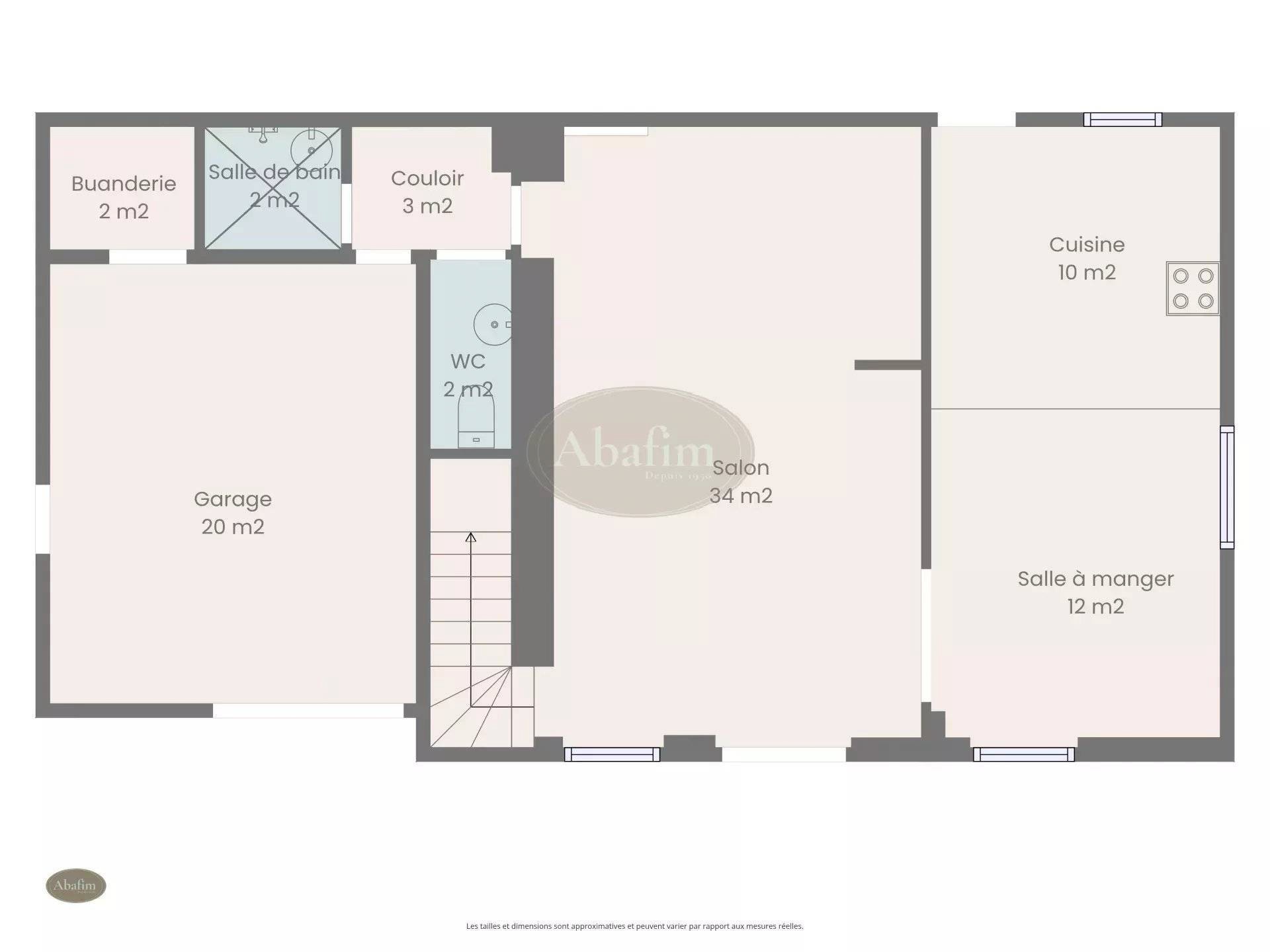 La cocina y el comedor se abren directamente a la terraza de la planta baja. El salón de 34 m² cuenta con chimenea y puertas dobles que dan al jardín. Un pequeño pasillo conduce al baño con ducha y al aseo independiente, además de conectar internamente con la casa principal.