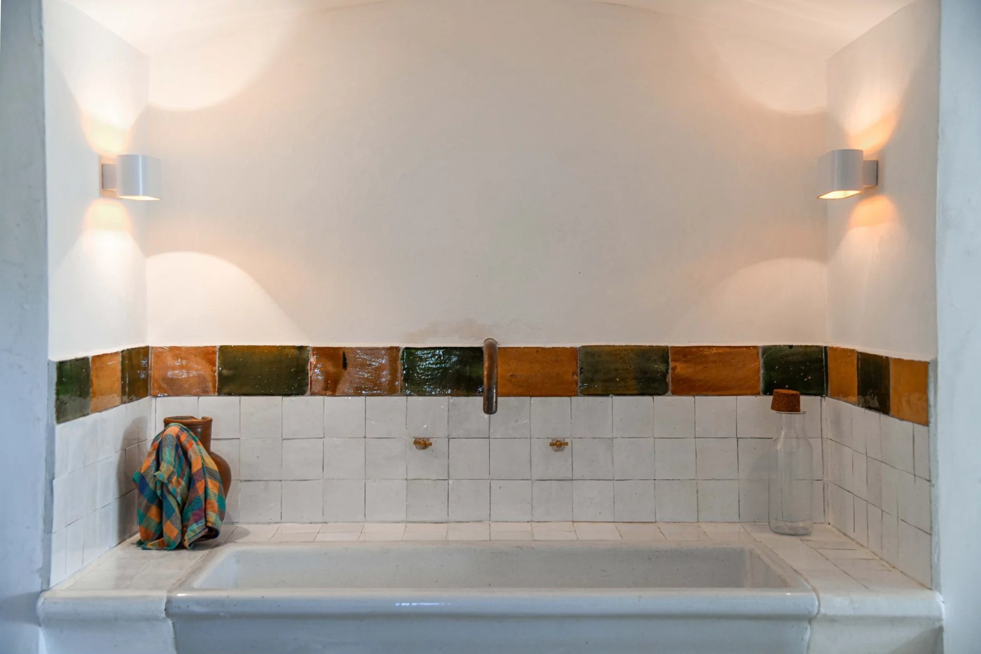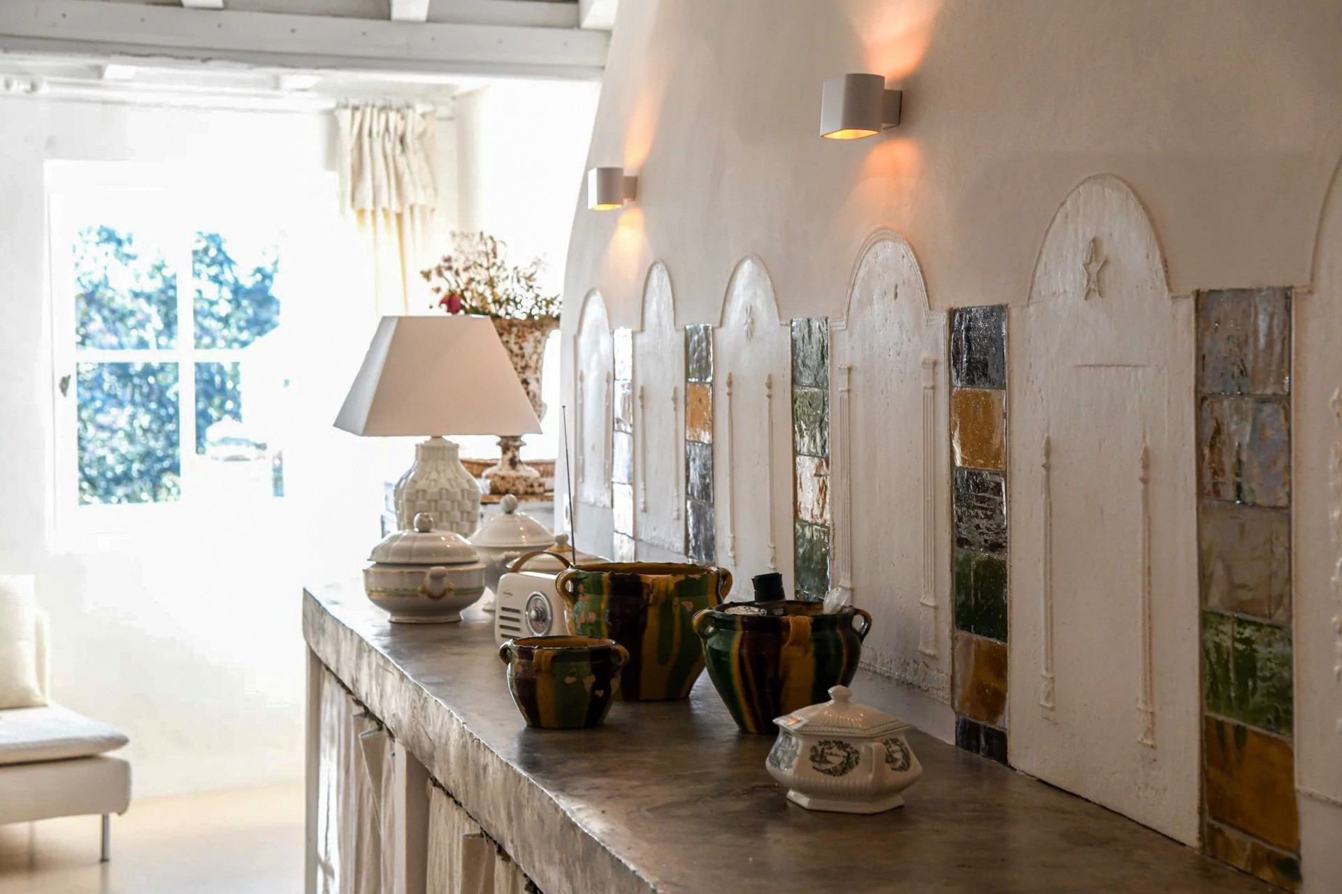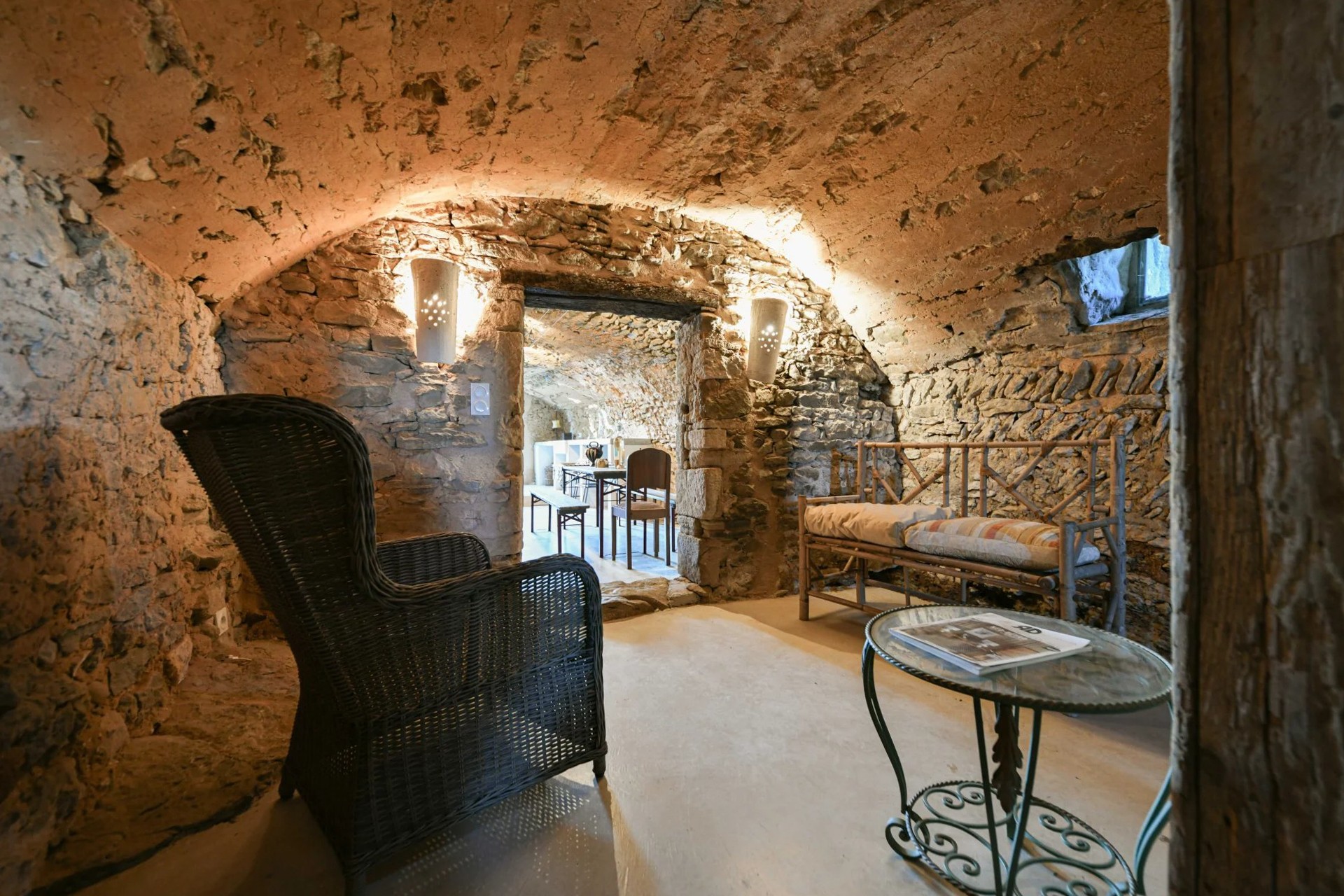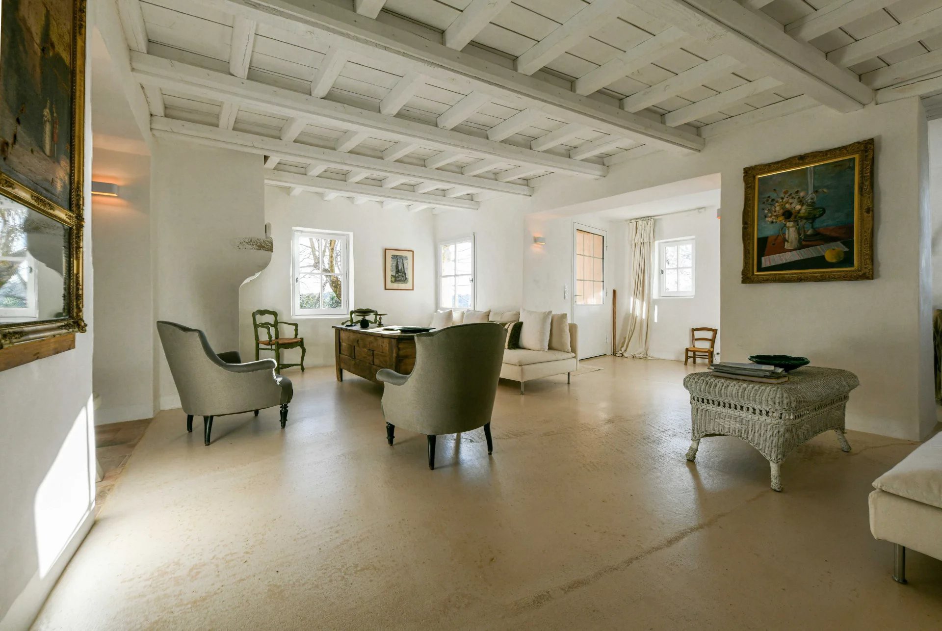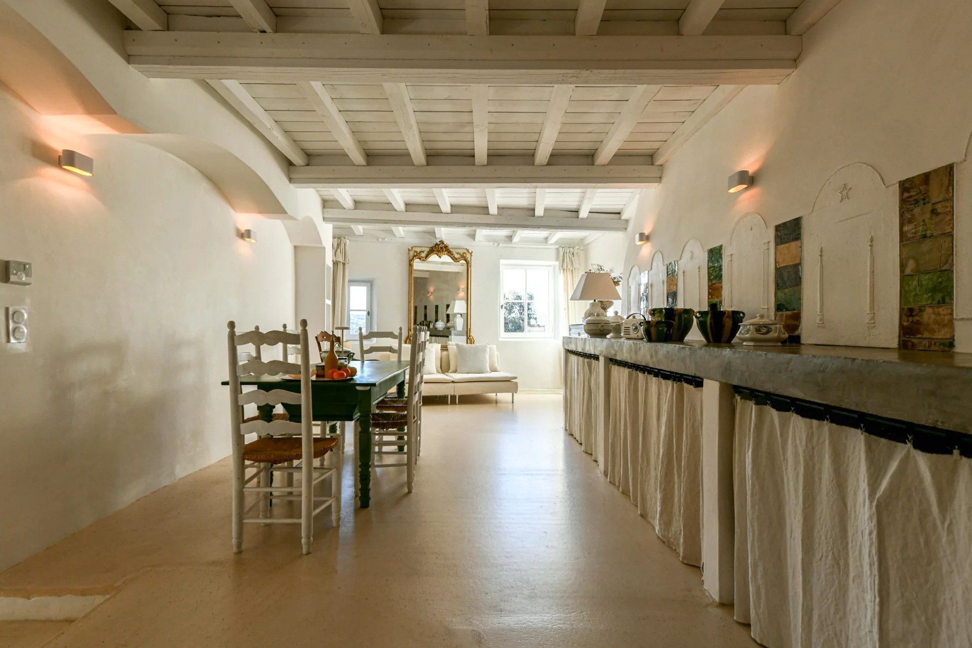 La planta baja es accesible tanto mediante una escalera interior como directamente desde el jardín a través de accesos independientes. Además de un dormitorio adicional con baño, esta planta cuenta con estancias de recepción abovedadas originales, un comedor y una cocina de verano con acceso directo al parque y a la piscina.