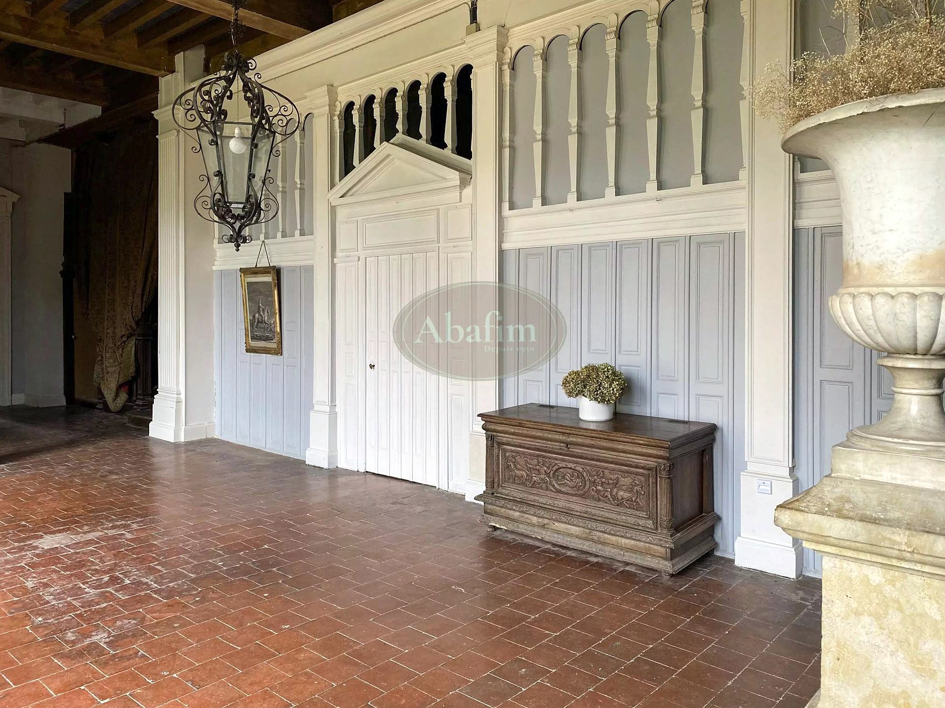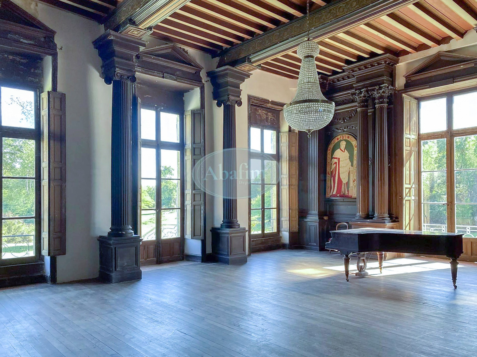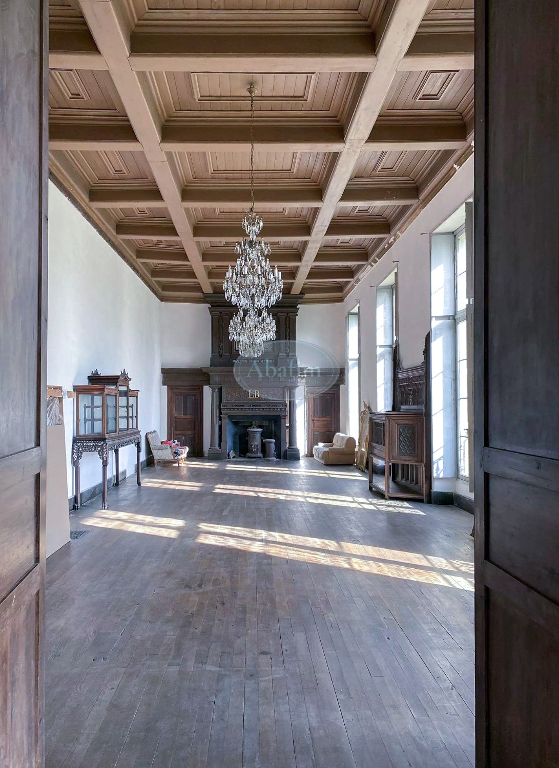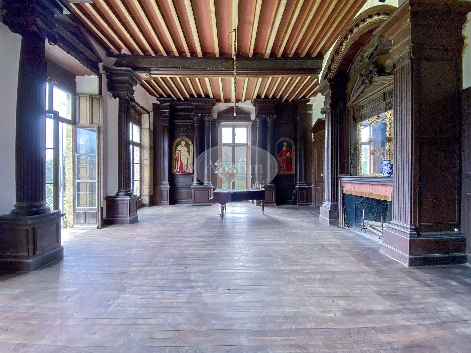 El edificio principal ofrece más de 2.000 metros cuadrados de superficie. Un vestíbulo central con suelos de terracota y revestimientos de madera da acceso a las estancias representativas. Dos salones de gala de aproximadamente 90 metros cuadrados cada uno estructuran la planta baja: el primero con una chimenea monumental suelos de parquet de roble y techo artesonado y el segundo con columnas talladas paneles de madera y tapices de las familias fundadoras. Este último se abre al parque mediante una gran escalinata. Los techos de más de cinco metros de altura y las numerosas ventanas generan espacios luminosos y equilibrados. Un salón completamente revestido en madera de 45 metros cuadrados cierra la enfilada.