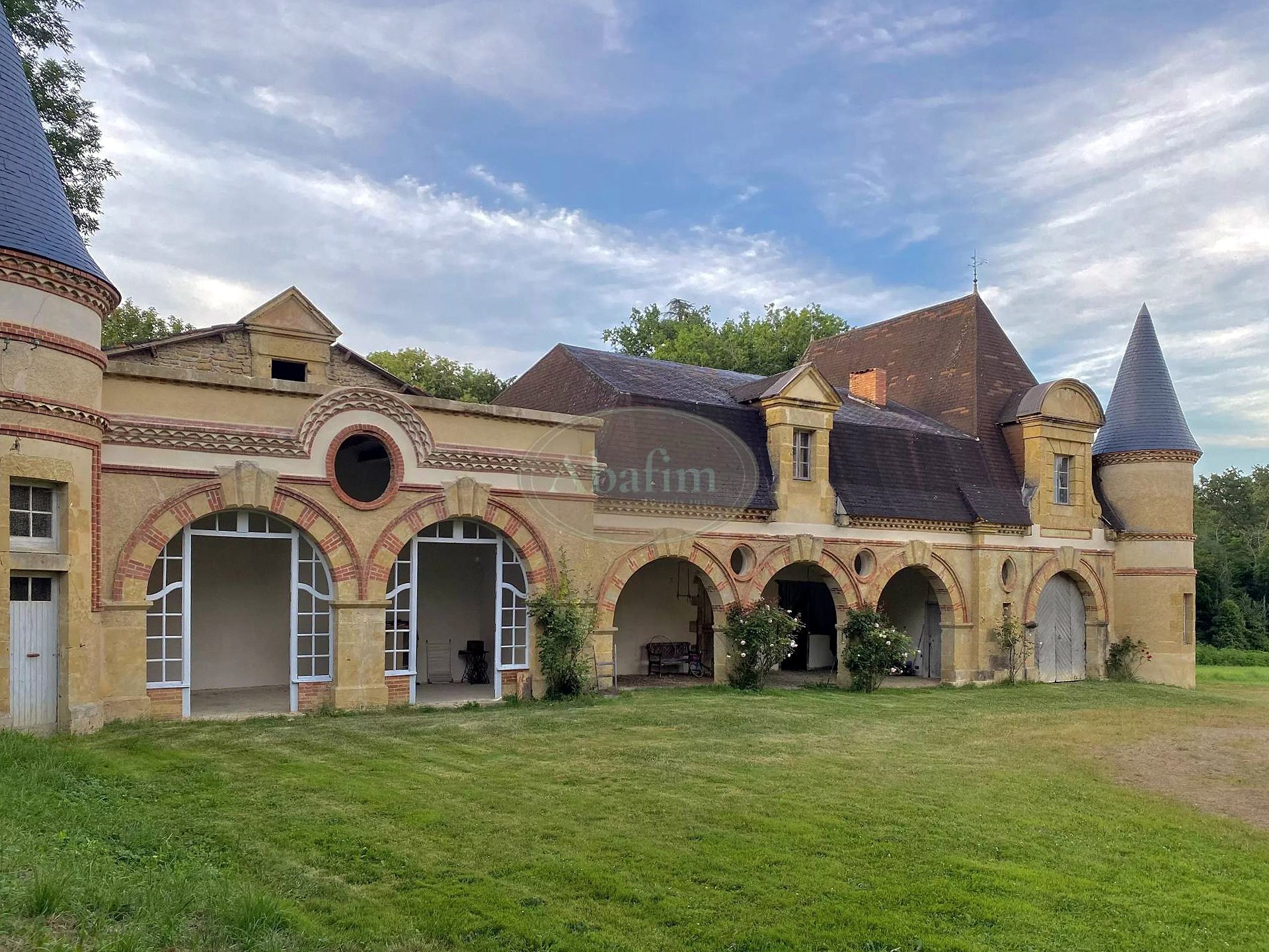 Los edificios anexos con sus torres circulares forman un conjunto arquitectónico coherente con el palacio principal e incluyen una antigua orangerie una casa de campo antiguas cocheras bodegas y espacios de uso flexible.