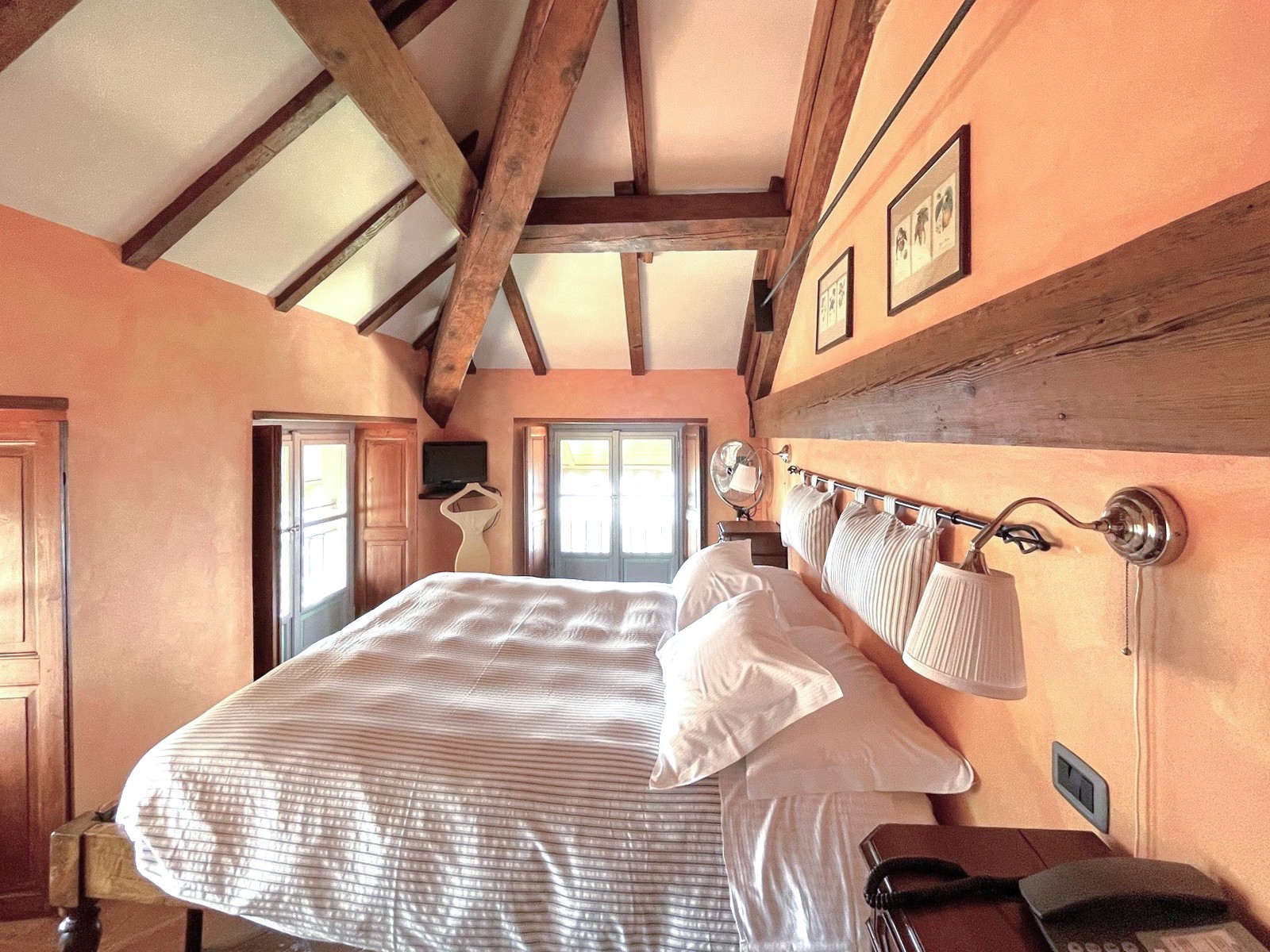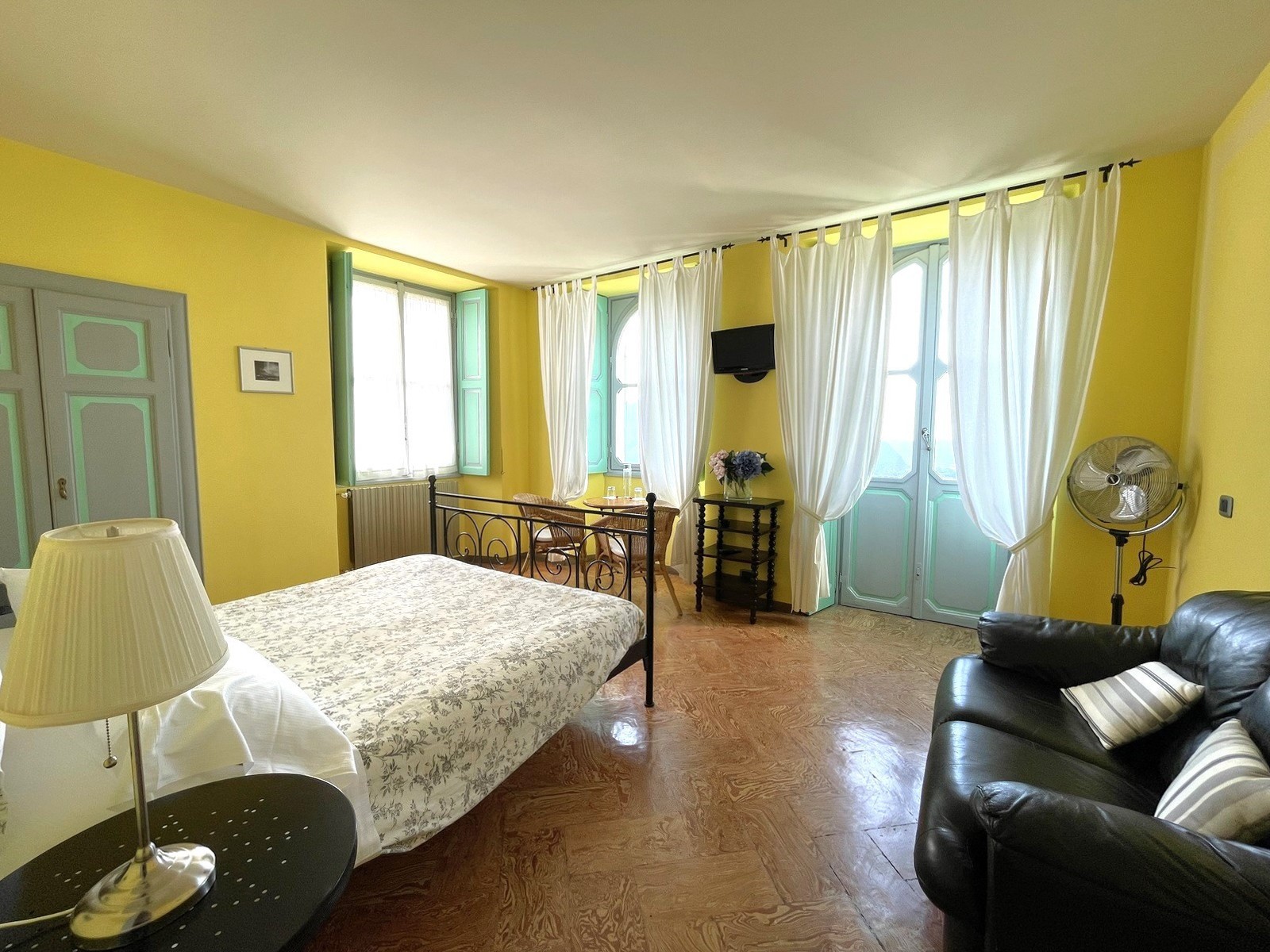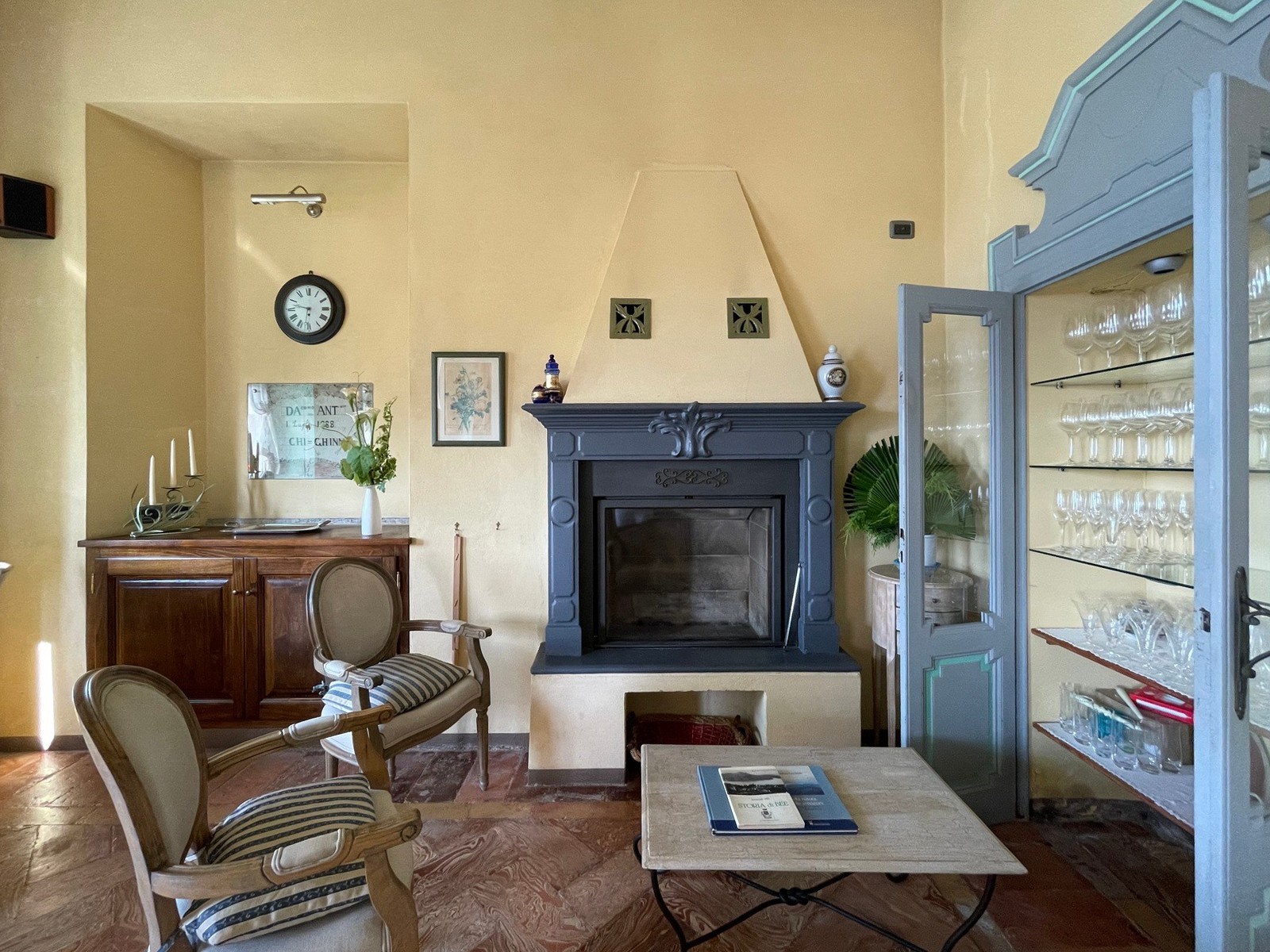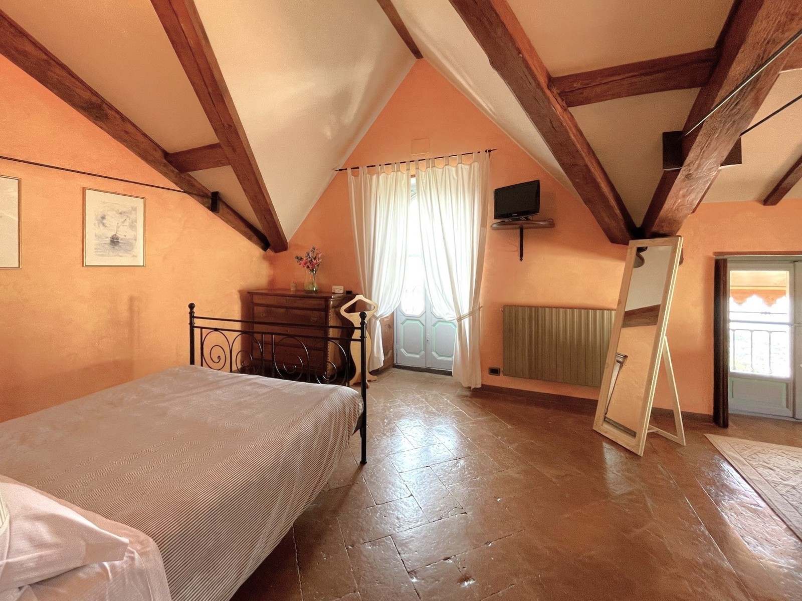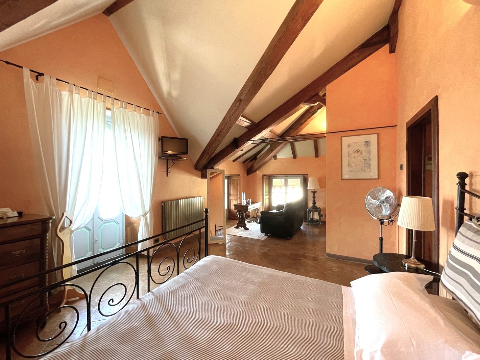 En la planta baja del edificio principal, hay un hall de entrada, un gran salón con chimenea y hermosos frescos originales, dos baños y un cuarto de servicio. En el primer y segundo piso, hay dos amplios dormitorios, cada uno con baño en-suite. El ático tiene otros dos dormitorios con balcón y también baño en-suite. El sótano cuenta con una gran bodega y ofrece acceso al jardín.
