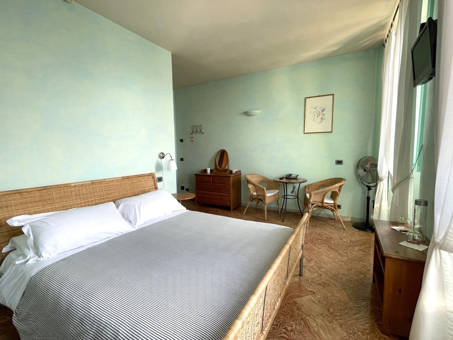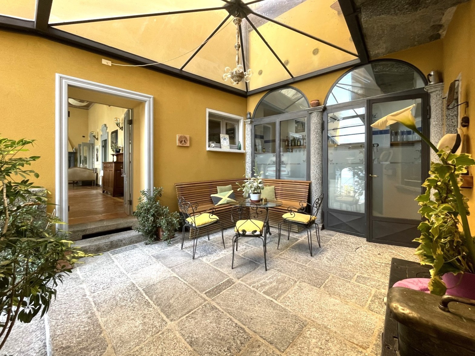 La villa auténticamente renovada del año 1823 consta de dos edificios separados conectados por un patio cubierto.