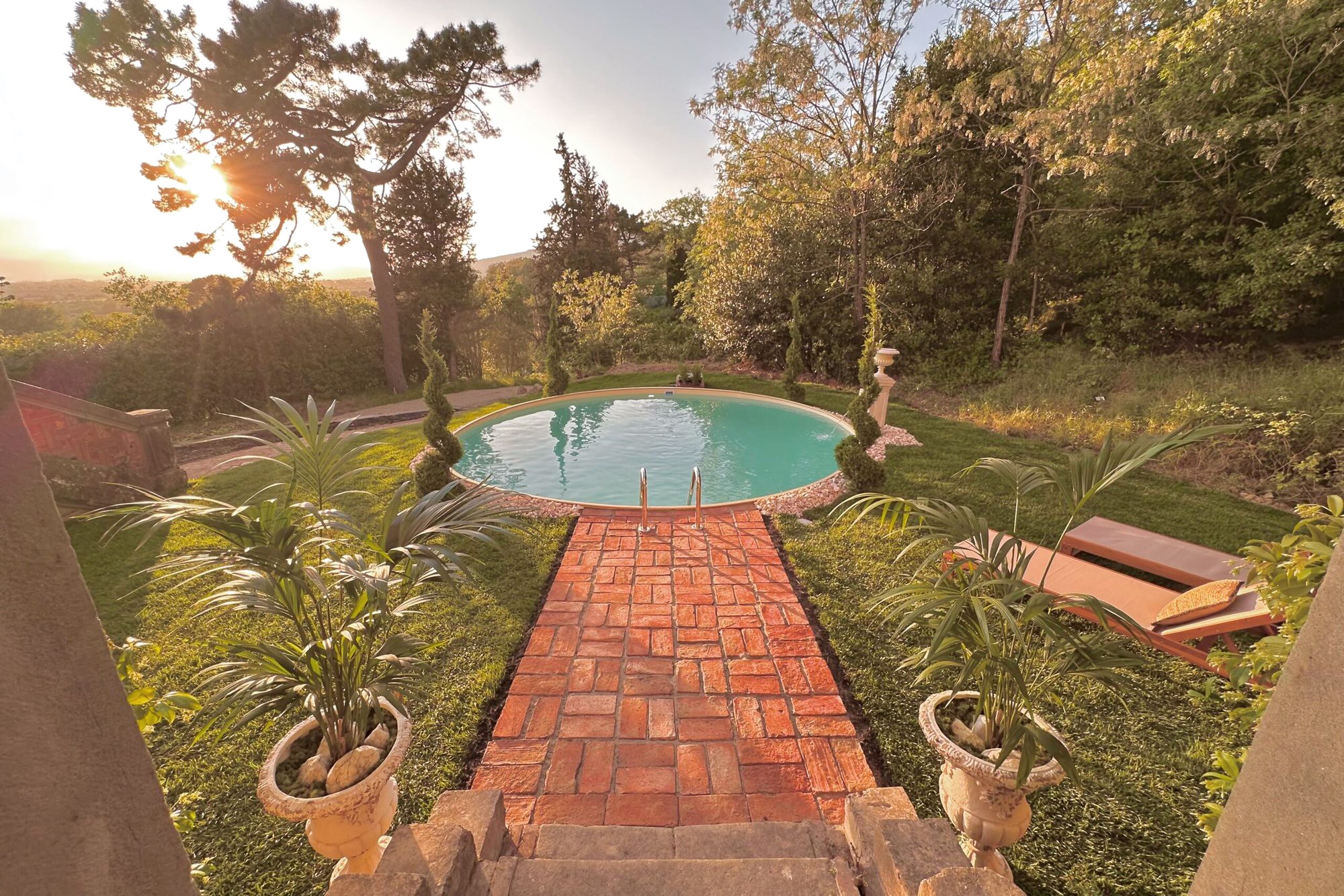 El parque de 7.550 m² incluye una ubicación prevista para piscina en altura. Un olivar con 120 árboles permite una pequeña producción de aceite de oliva. El acceso es por carretera asfaltada y la autopista A1 se encuentra a 10 km.