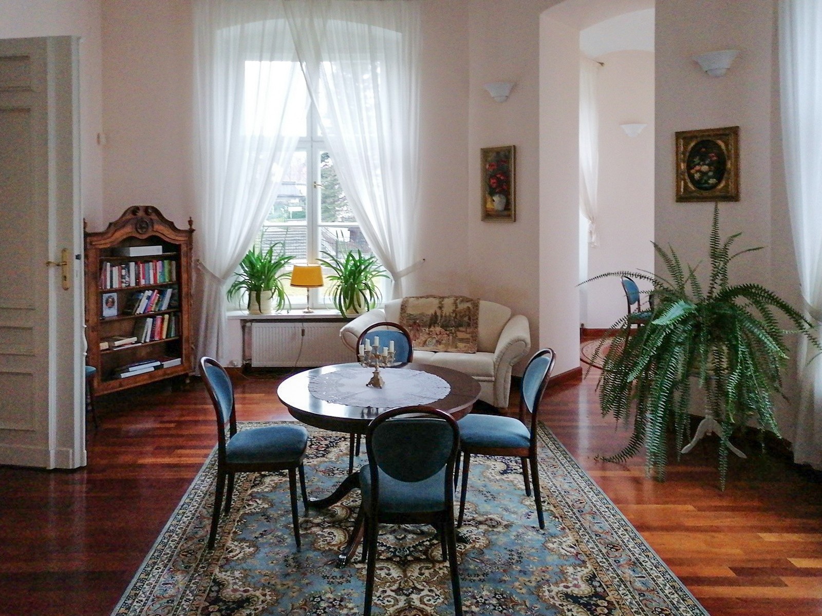 La mansión histórica "Villa Victoria", construida en estilo neogótico en 1860, fue objeto de una restauración integral entre 2007 y 2010 y se presenta con un amueblamiento cuidado y coherente con su carácter. La propiedad se sitúa en un entorno de parque, directamente junto a un río, en una de las localidades balnearias más antiguas del sur de Polonia.