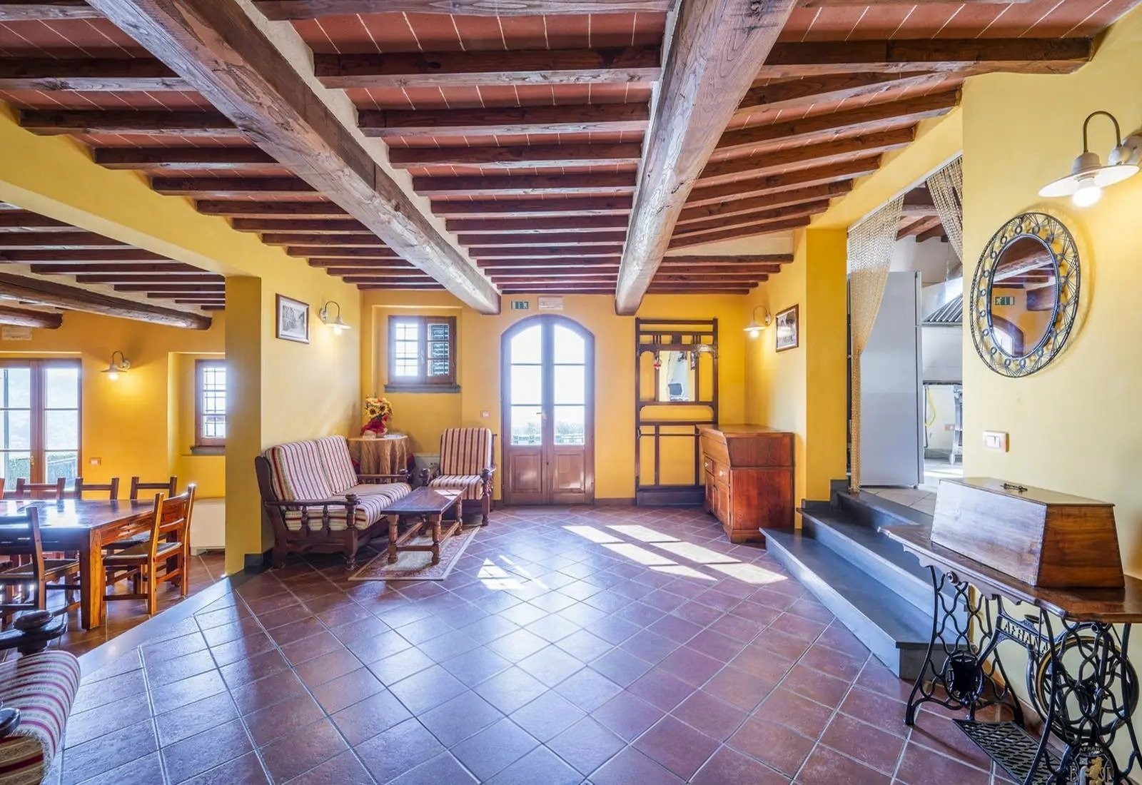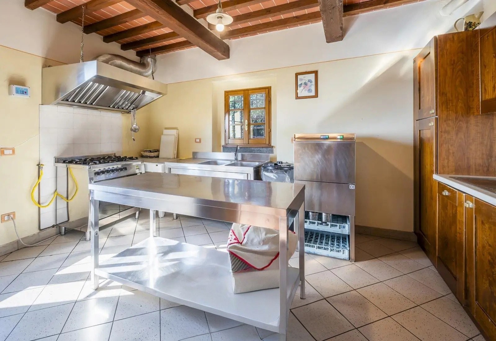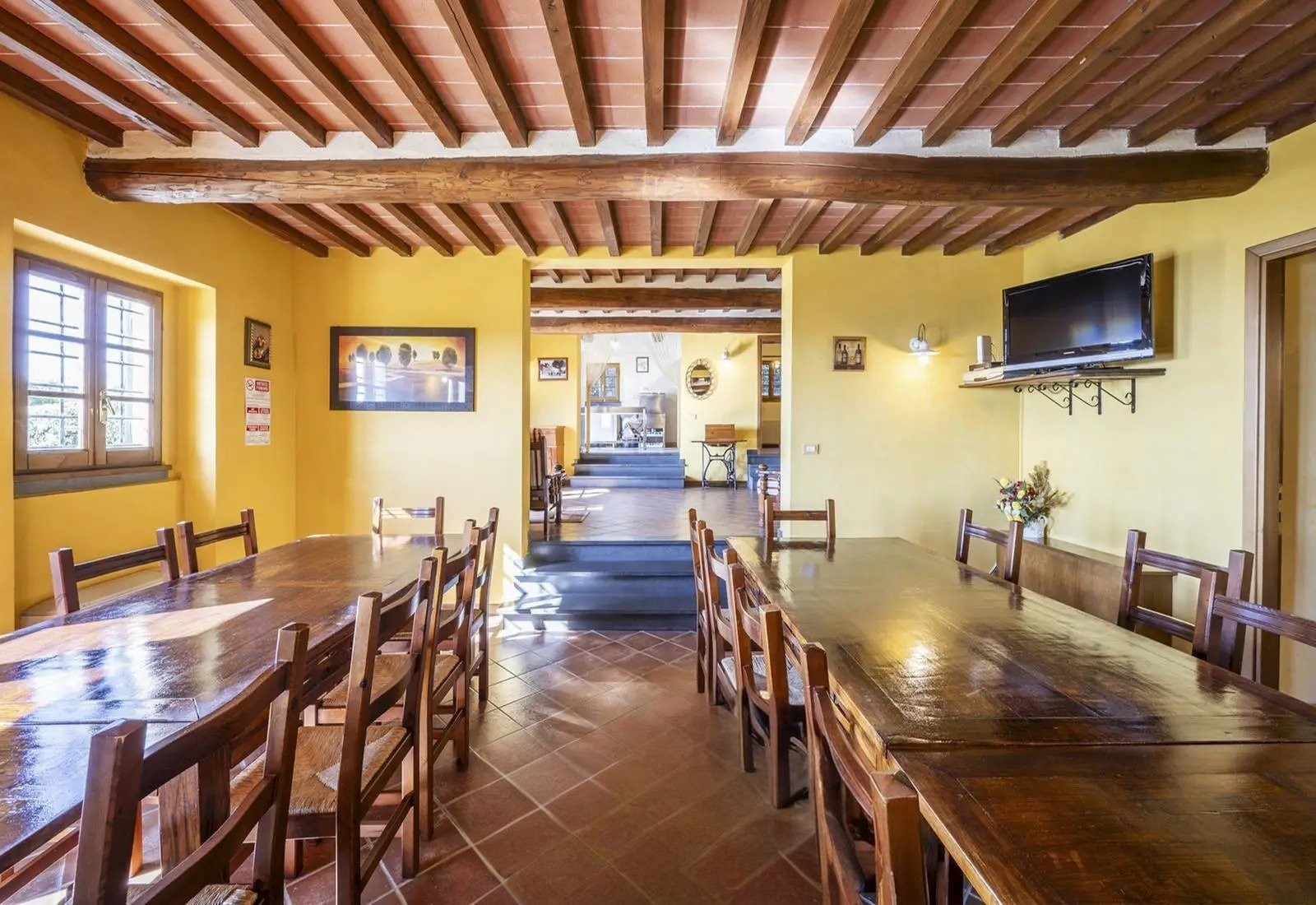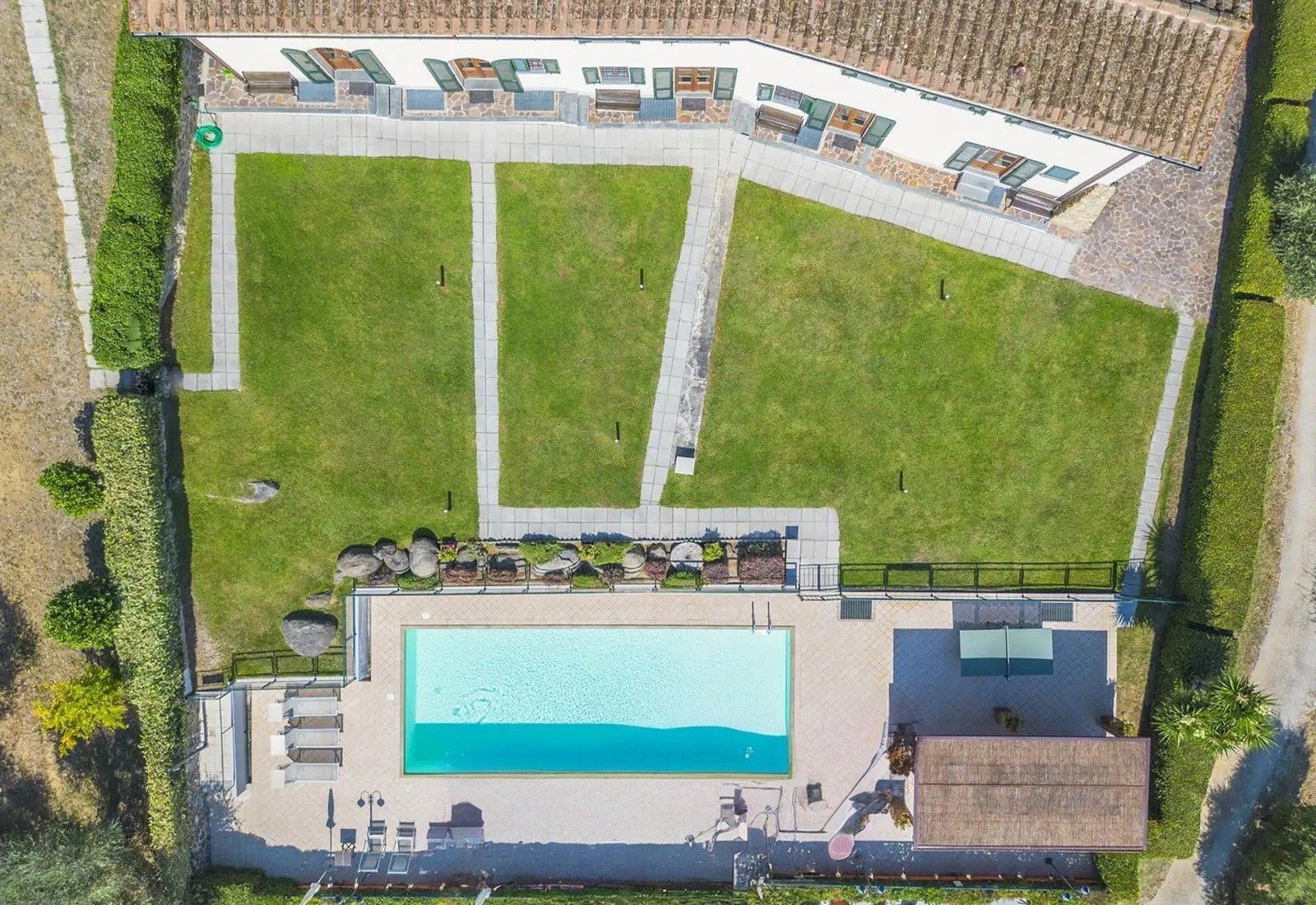El terreno mantiene un carácter agrícola funcional al mismo tiempo que ofrece infraestructura de ocio y deporte. La piscina mide 5,5 × 12 metros y dispone de una terraza-solárium con vistas al valle y a Montecatini Terme. Además, la propiedad cuenta con instalaciones deportivas para voleibol, fútbol, baloncesto y bádminton, así como un pabellón cubierto con zona de barbacoa y un área con hoguera. La disposición permite que las instalaciones recreativas funcionen de manera independiente de las zonas residenciales, beneficiándose de la orientación y elevación del terreno para una ventilación natural y vistas panorámicas.
