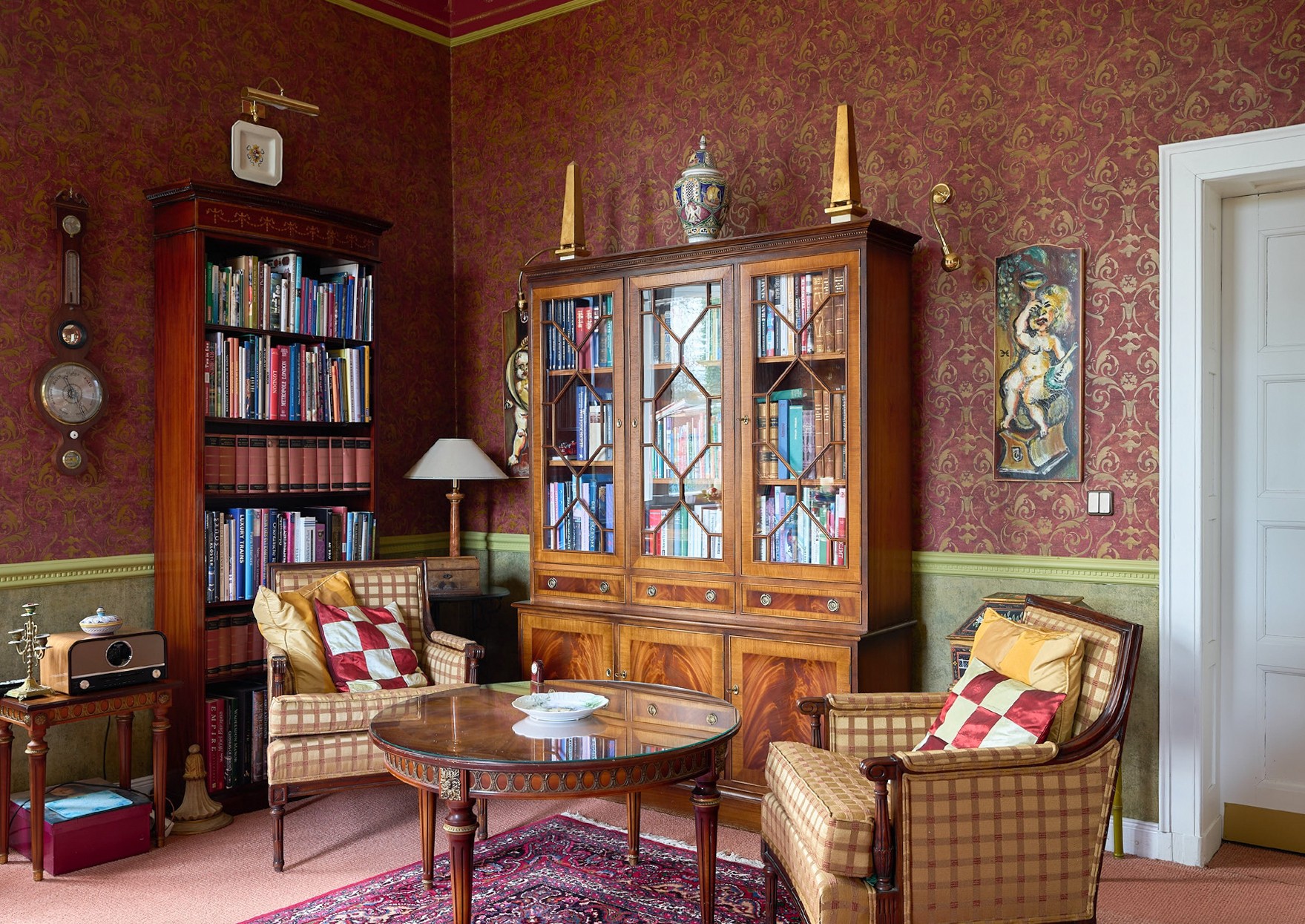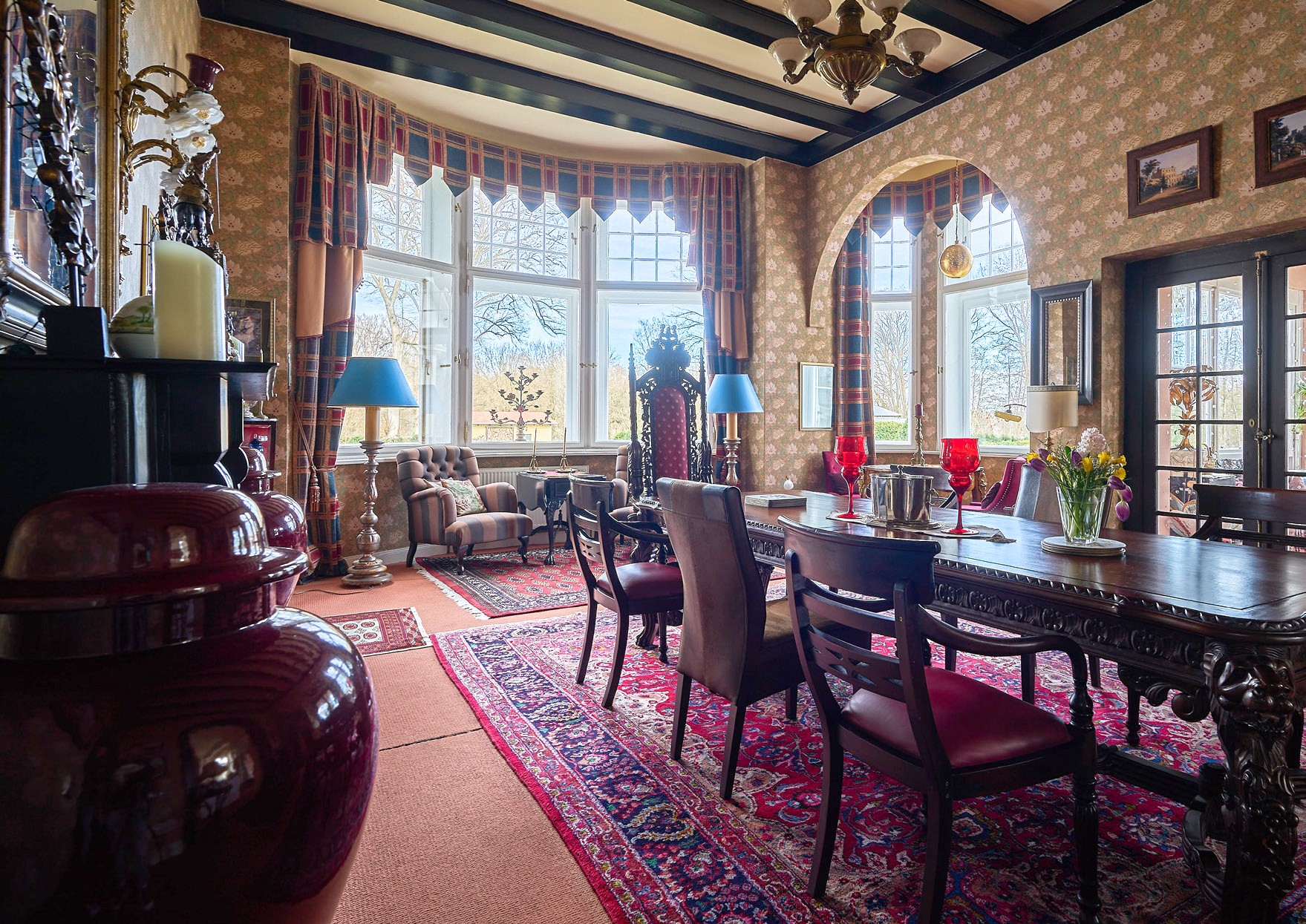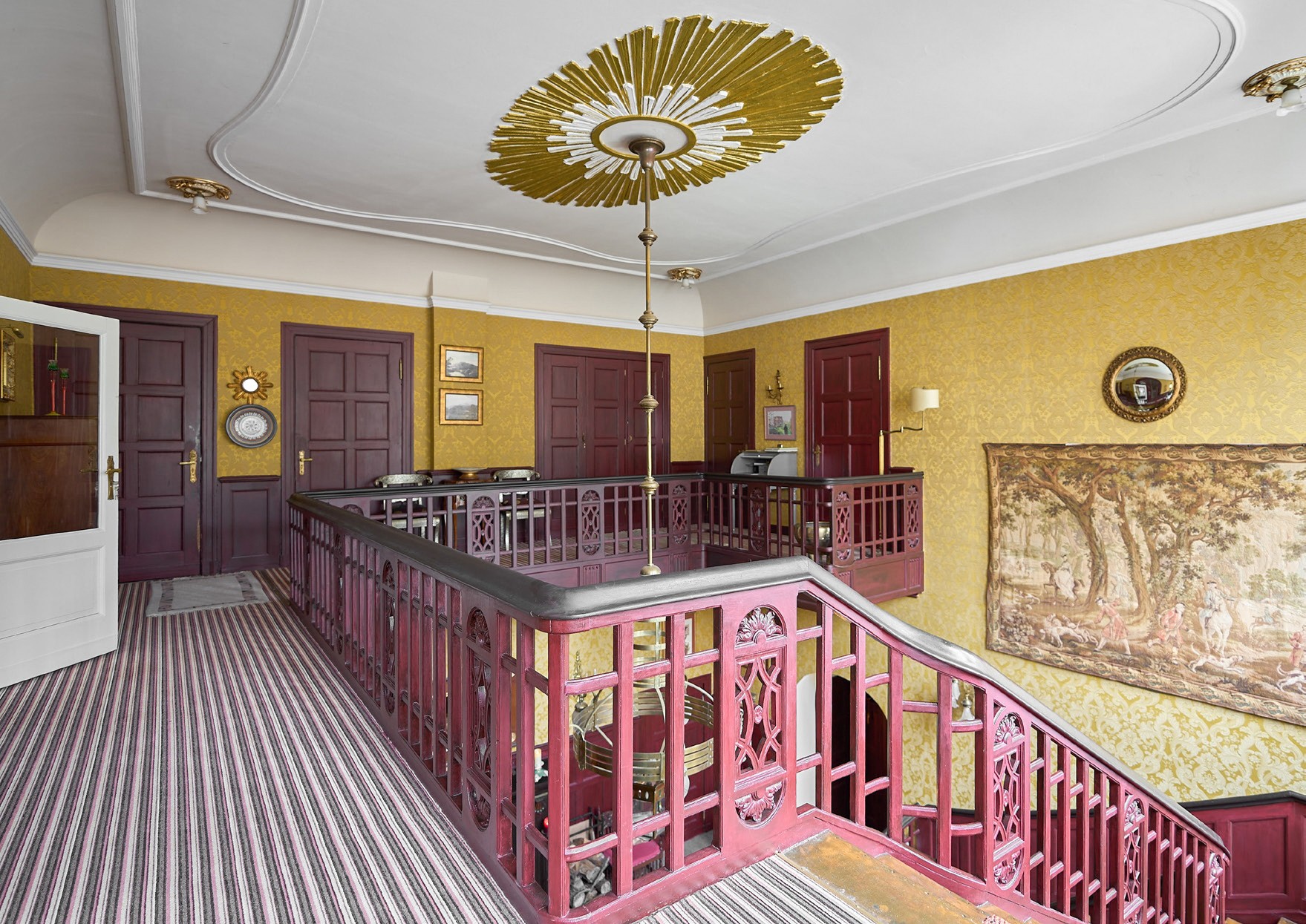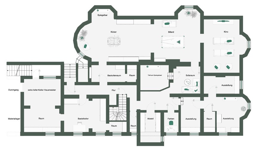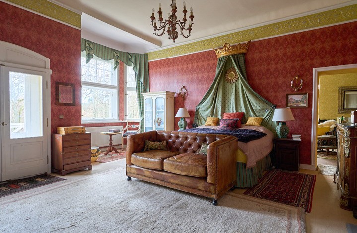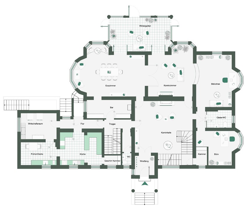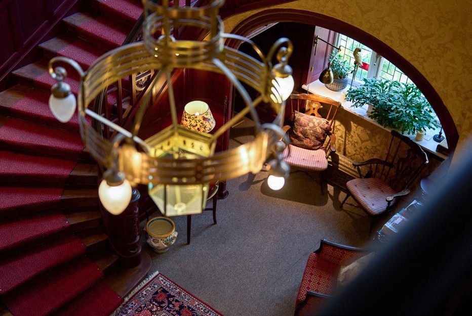 El corazón de la casa es el vestíbulo de entrada, con una altura de techo de unos 7,5 metros y una escalera representativa. Muchas de las estancias conservan detalles originales, como chimeneas, techos decorativos, paneles de madera y carpintería de alta calidad. La biblioteca, el comedor y el invernadero ofrecen vistas al jardín y al lago. Las estancias conservan su carácter histórico y, al mismo tiempo, están adaptadas a las necesidades cotidianas actuales.