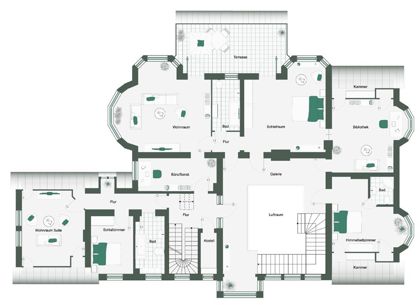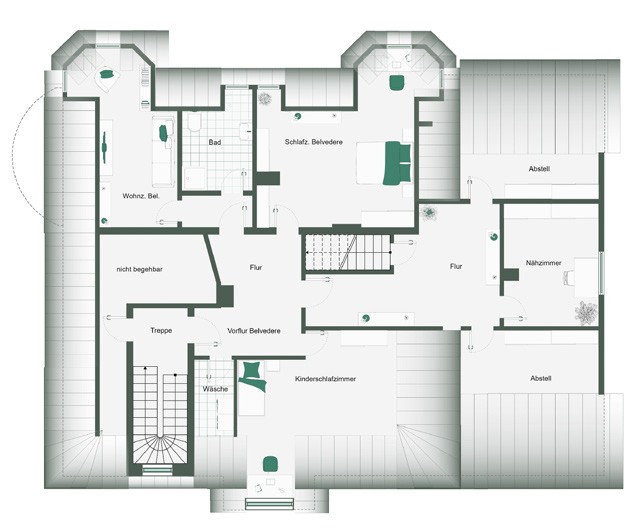 La planta superior con sus torretas constituye un elemento arquitectónico llamativo y ofrece hermosas vistas al terreno y a los alrededores.