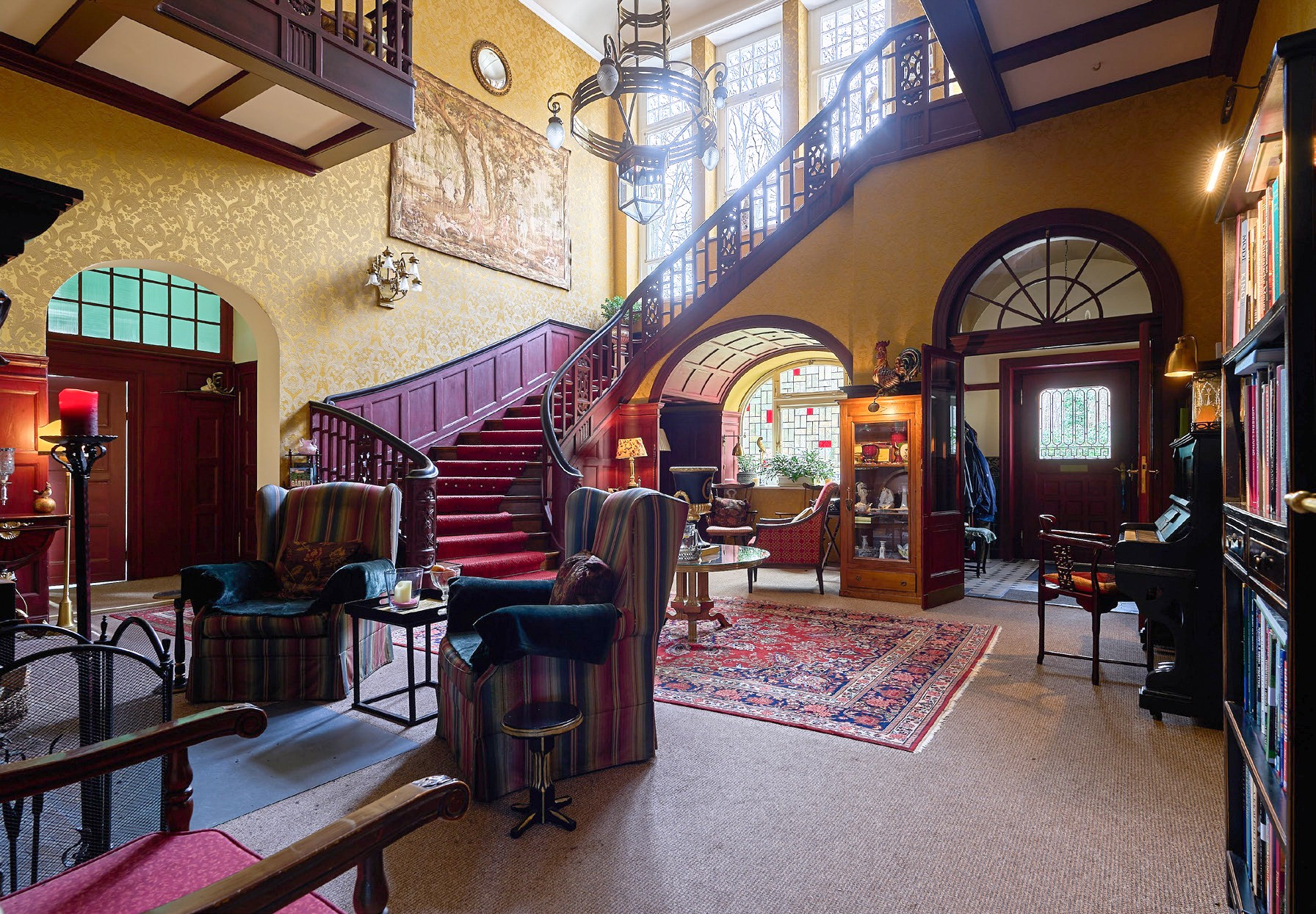 - Entrada imponente con escalera representativa hacia la galería