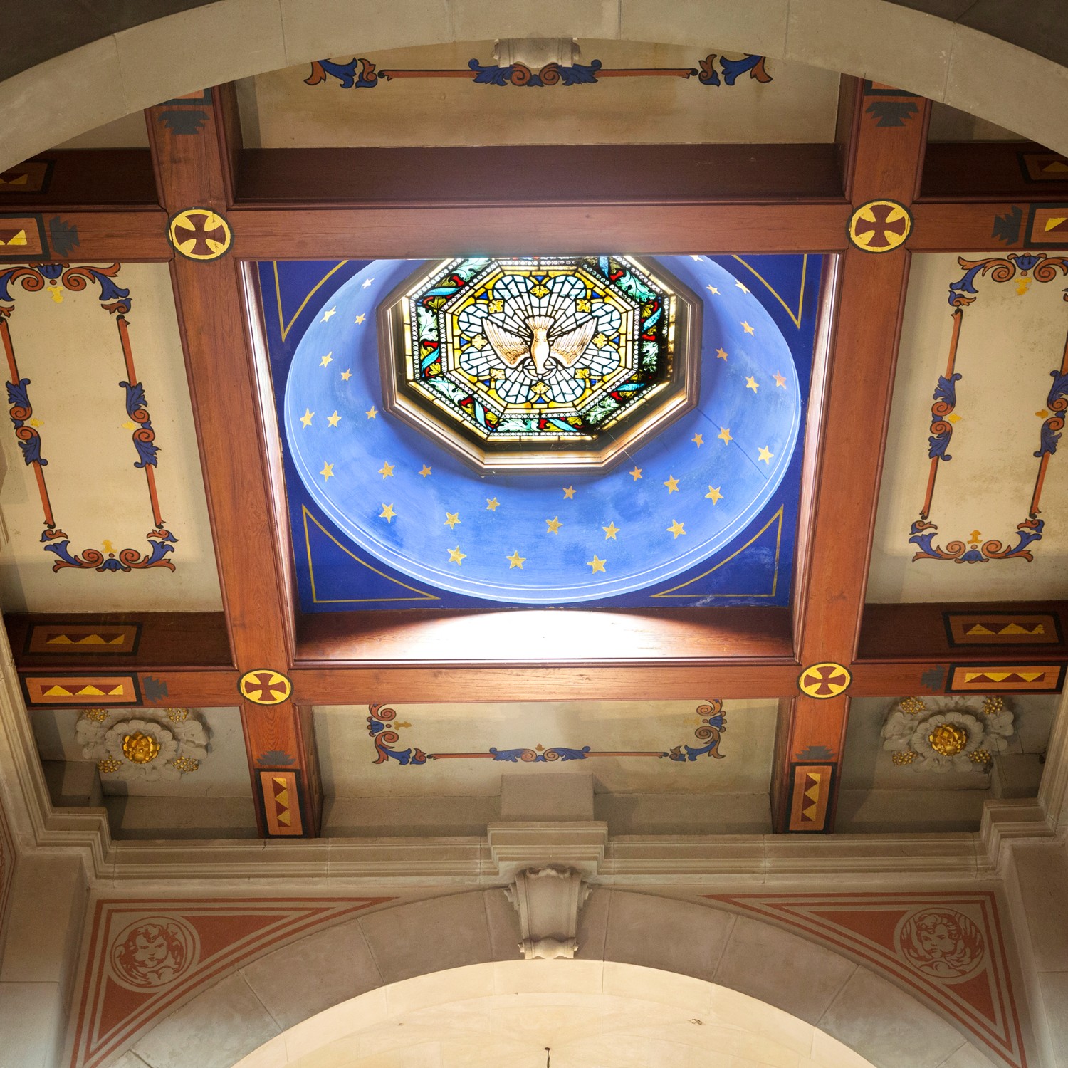 Hall de entrada Gran escalera Chimenea Estufa de azulejos Vidrieras Sala de baile Galería Balcón Luz de techo Jardín de invierno Techos altos Capilla Techos abovedados Patio