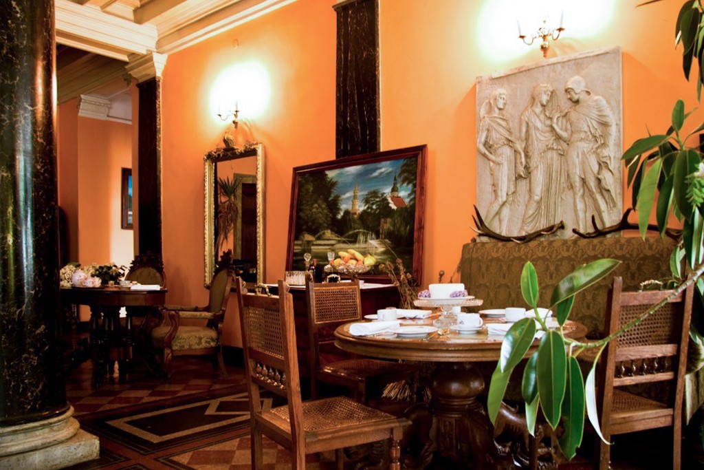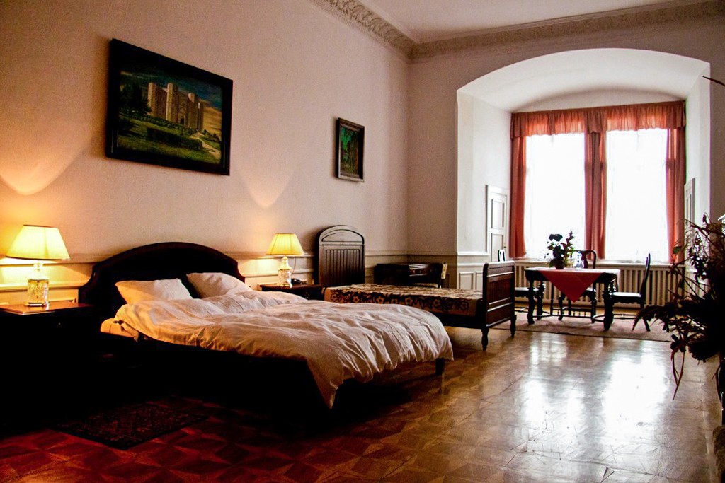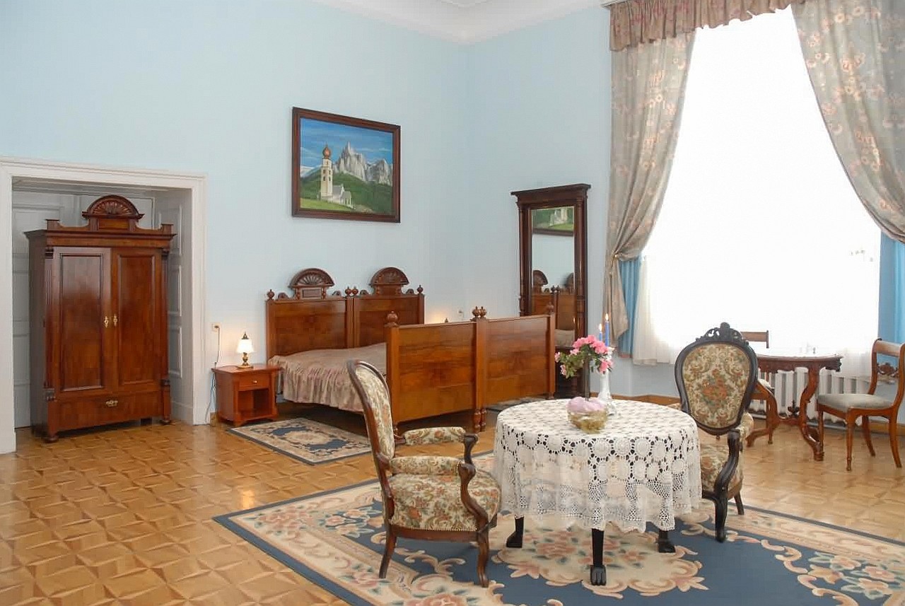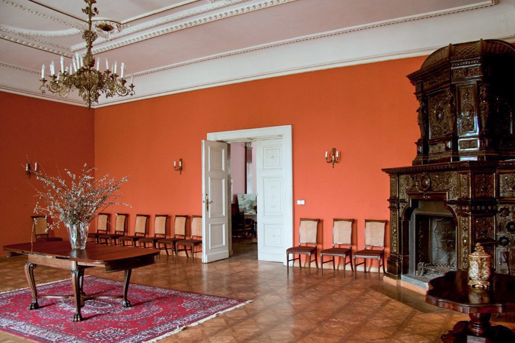 El palacio neorrenacentista, construido en piedra y ladrillo y enlucido, tiene planta rectangular, dos pisos y un alto tejado a cuatro aguas con buhardillas más nuevas. Presenta una fachada de trece ejes con tres crujías poco profundas, de las cuales la central de tres ejes, que contiene la entrada principal al palacio, tiene un porche porticado. El risalit central está decorado con pilastras y coronado por un gran frontón con volutas y escudos. La fachada del jardín corresponde al trazado de la portada. Todas las ventanas tienen marcos decorativos. El interior está dividido en dos partes, con un pasillo en el centro y un espacioso vestíbulo en el eje. El segundo piso del palacio es más alto y forma el llamado "piano nobile". Los interiores conservan suelos de mosaico, techos artesonados con decoración de estuco, columnas corintias de mármol y estufas decorativas de azulejos.
