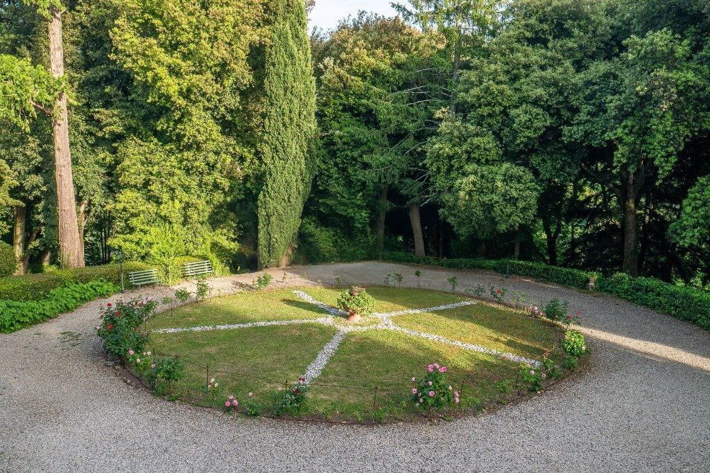 El jardín inglés paisajístico, con árboles centenarios y especies raras, incluye senderos, escaleras, grutas y fuentes. Una limonaia independiente de unos 150 m² muestra influencias arquitectónicas de la tradición Buontalenti-Del-Moro.
