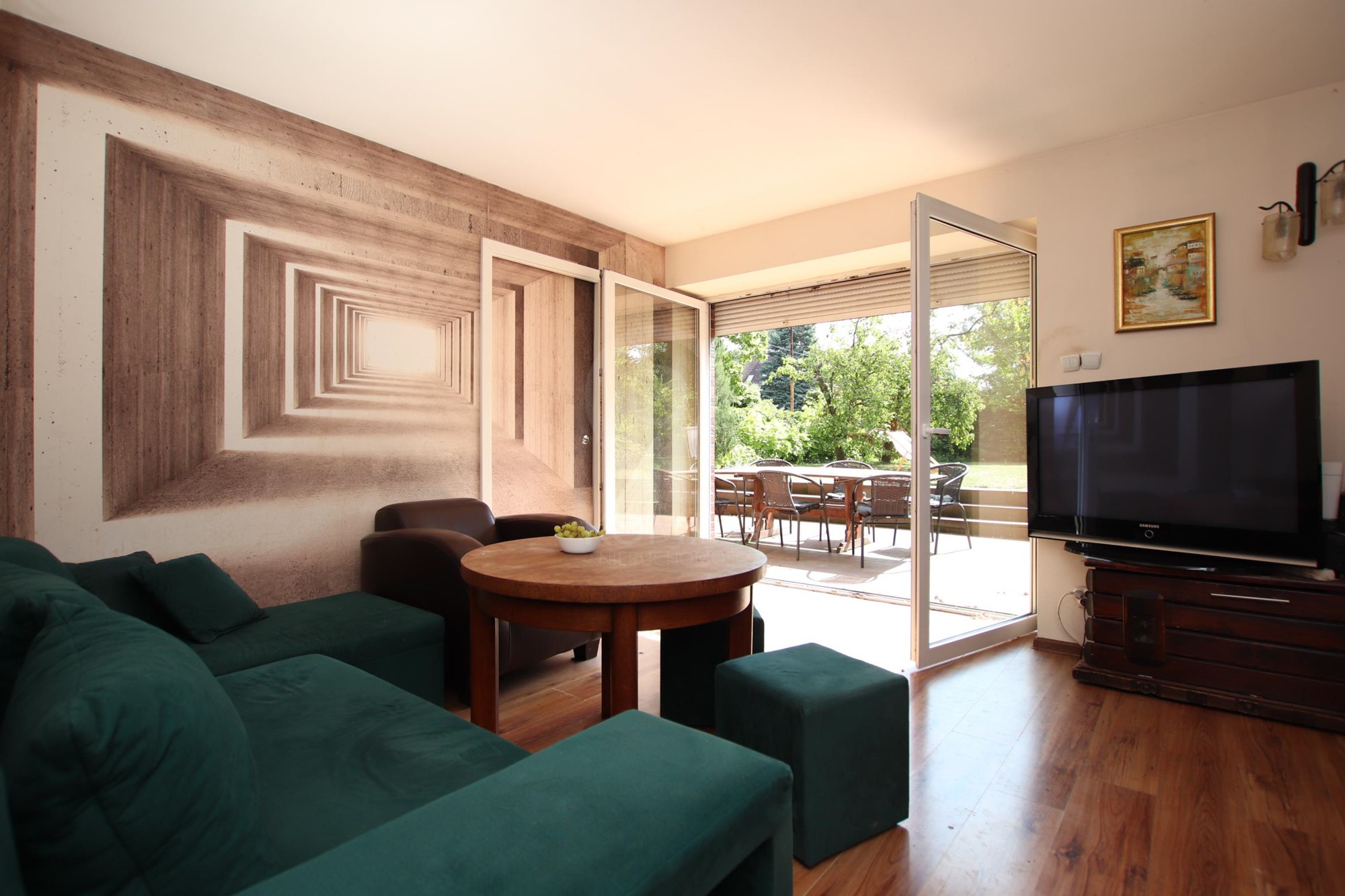 El jardín ofrece espacio amplio y rincones acogedores para relajarse. Se puede acceder a él tanto desde la veranda de la planta baja elevada como desde la sala de estar en el sótano.