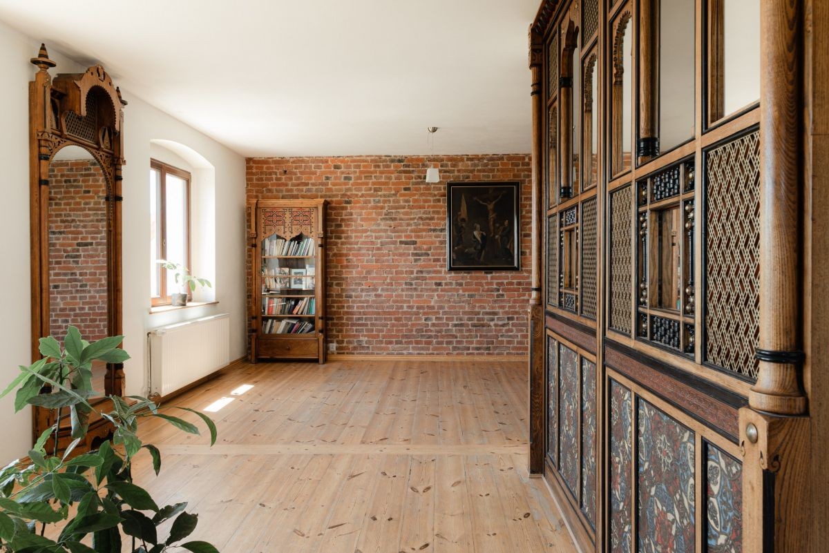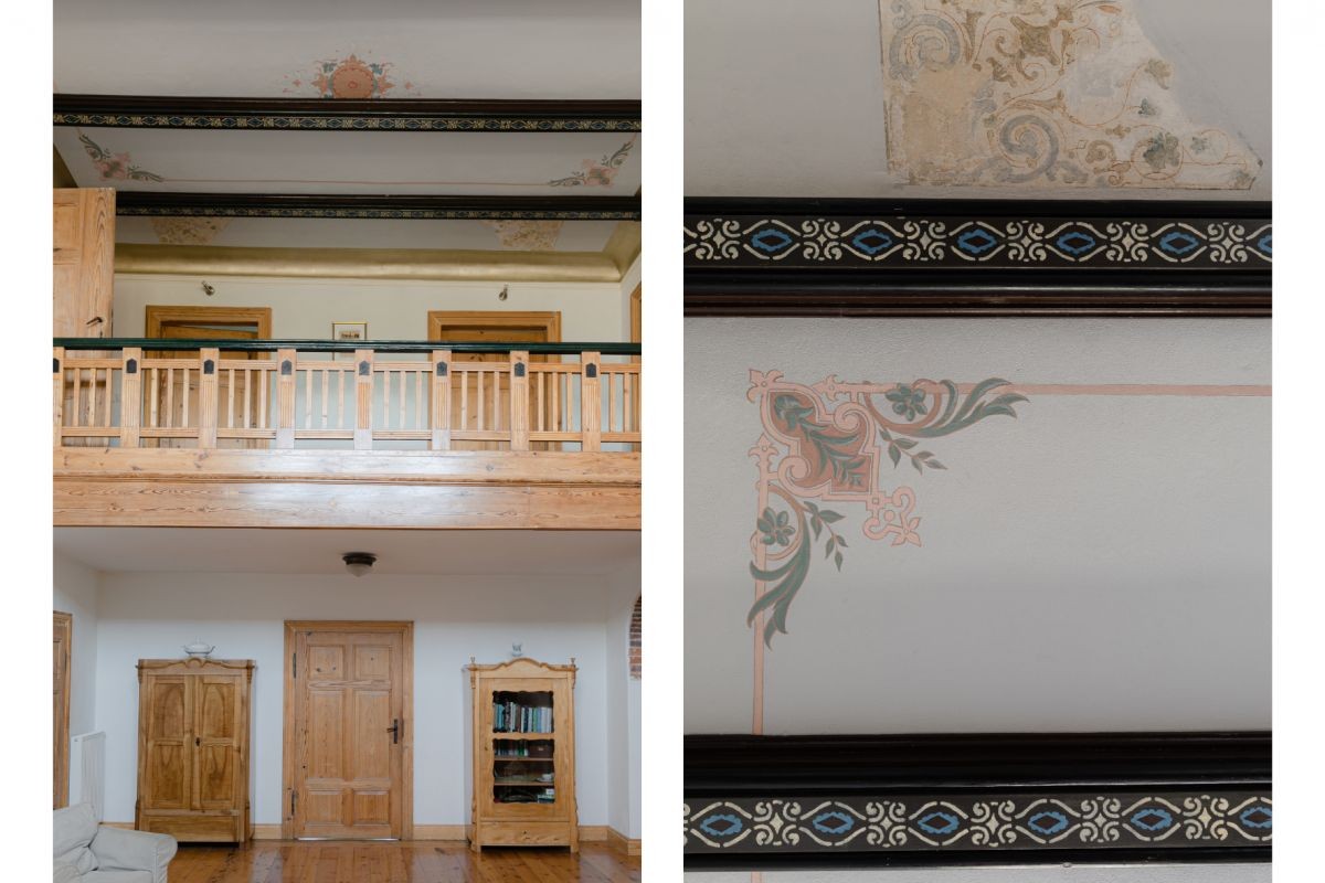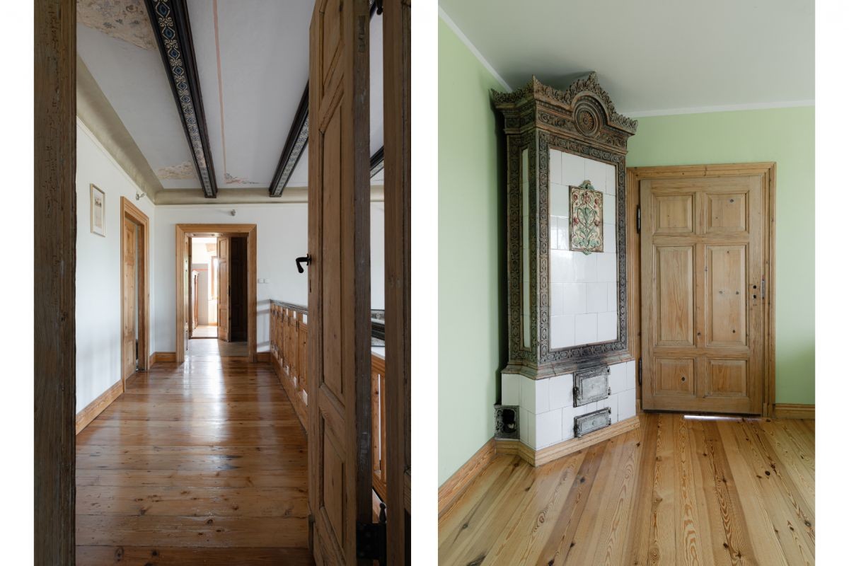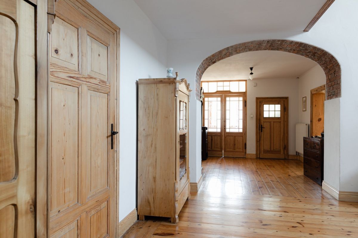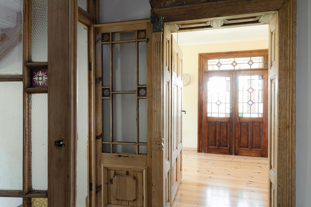 En la casa hay un total de 15 habitaciones con una superficie total de 482 metros cuadrados. El corazón de la villa es un hall de entrada representativo, con casi 6 metros de altura, con frescos restaurados del siglo XIX y motivos florales. El techo también está decorado con vigas de madera decorativas. Los pisos están revestidos con anchos tablones de pino originales y parquet de roble. Se han restaurado los trabajos de carpintería originales de las puertas. Una característica especial de la propiedad es la fachada original reconstruida a mano y las elaboradas tallas de madera con motivos florales.