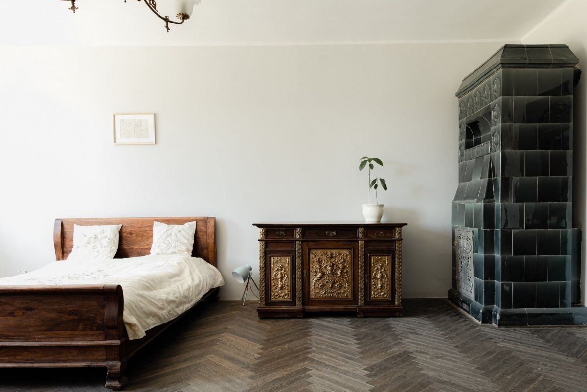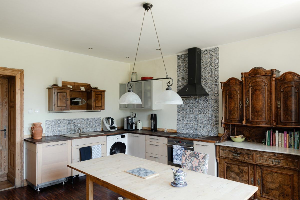 - Nueva instalación eléctrica y de calefacción central de cobre Calefacción: Estufa de carbón de guisantes ecológica / en preparación para calefacción de pellets o bomba de calor Paneles fotovoltaicos (totalmente negros) con una capacidad de 6,52 kWp Ventanas - ventanas de triple acristalamiento eficientes energéticamente (principalmente de madera de meranti, algunas de PVC) Nuevos revestimientos de cal y arena / yeso El edificio está conectado a una planta de tratamiento de aguas residuales de tres cámaras Marcos de puertas originales renovados Pisos: tablones de pino anchos originales y parquet de roble o tablones de pino nuevos Azulejos originales de Villeroy & Boch en los pasillos conservados El progreso de las obras de renovación es del 70%