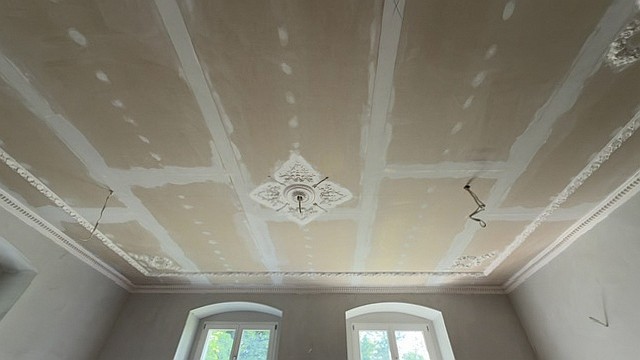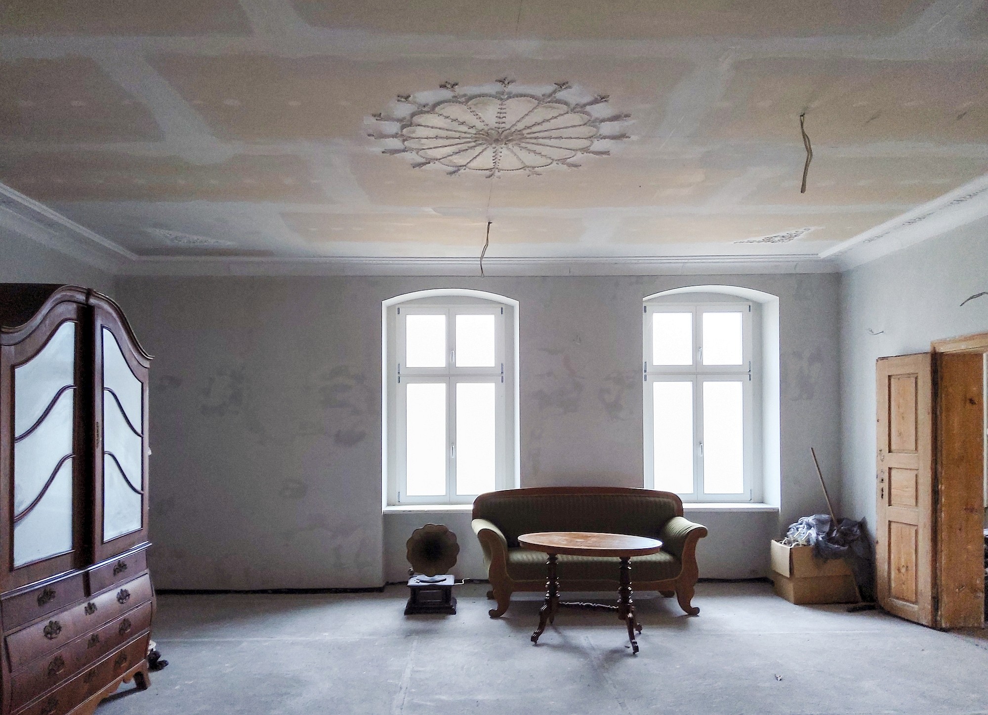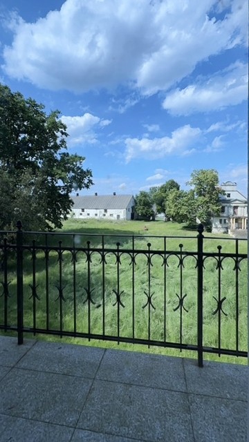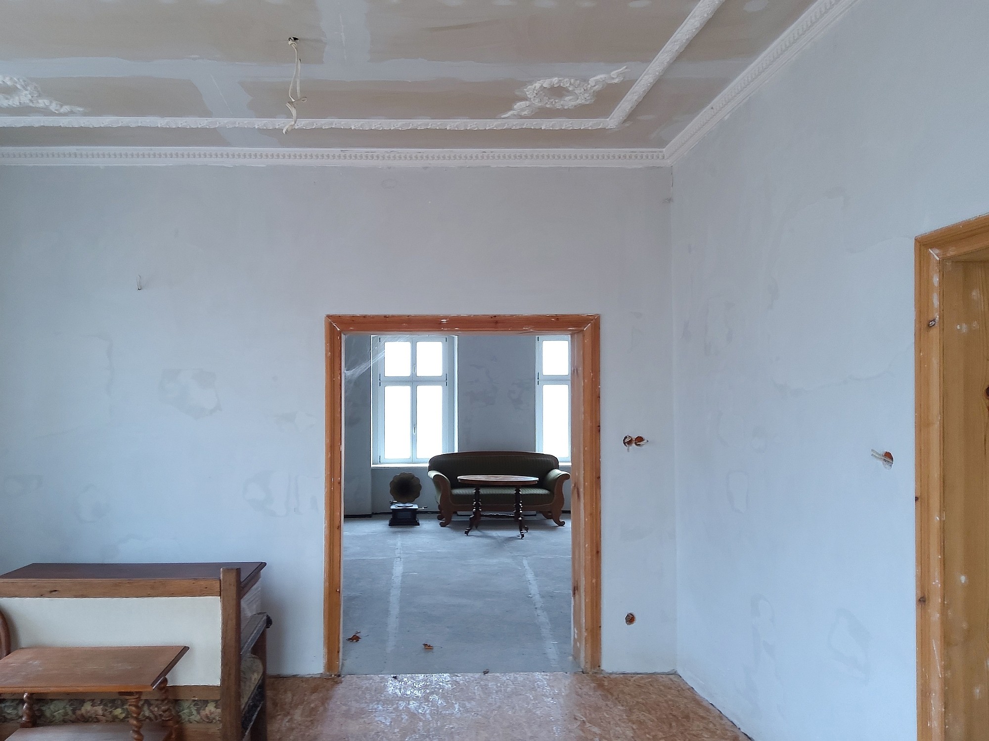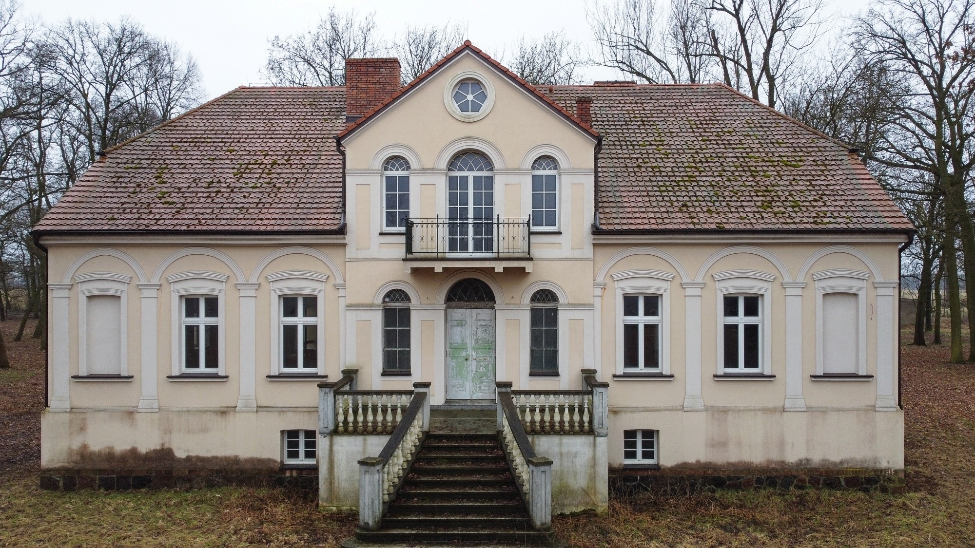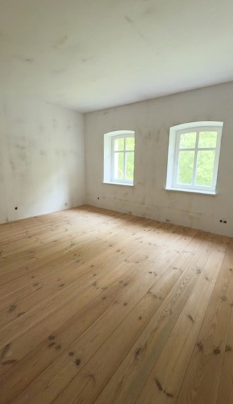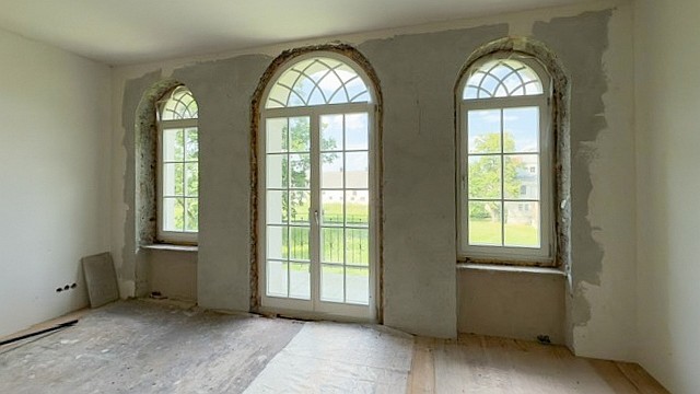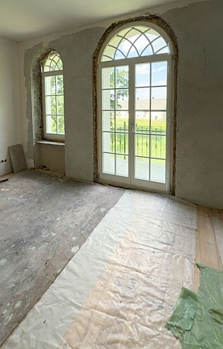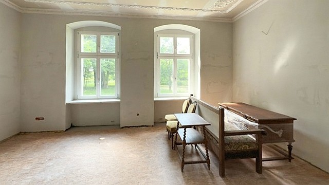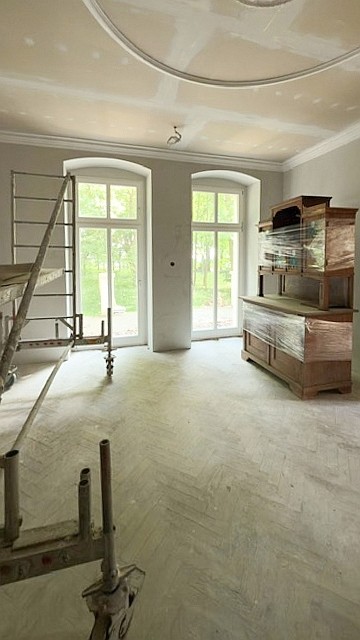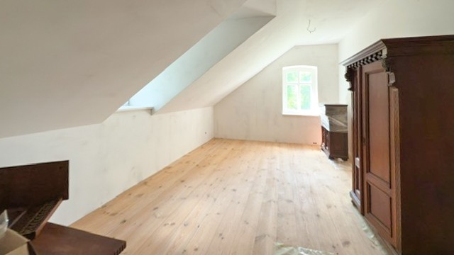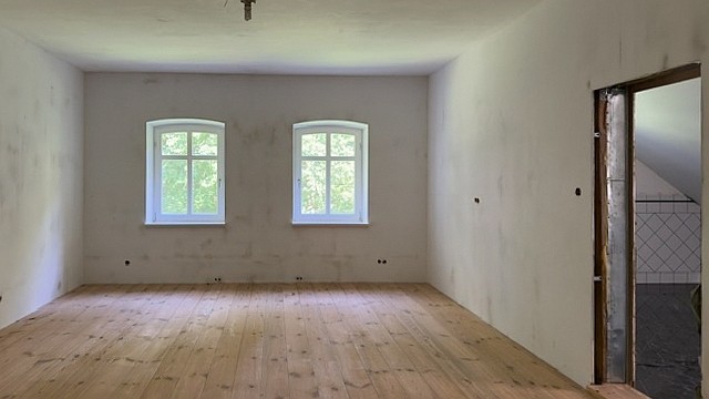Edificio principal sobre un sótano alto con tejado a cuatro aguas. Fachada principal con risalit central saliente, balcón y escalera exterior. La casa ha sido en gran parte renovada, incluyendo una nueva estructura de techo de madera con cubierta, trabajos de enlucido en interior y exterior, nuevas ventanas de madera históricamente fieles, y baños e instalaciones sanitarias modernas. Solo quedan pendientes trabajos menores de acabado.