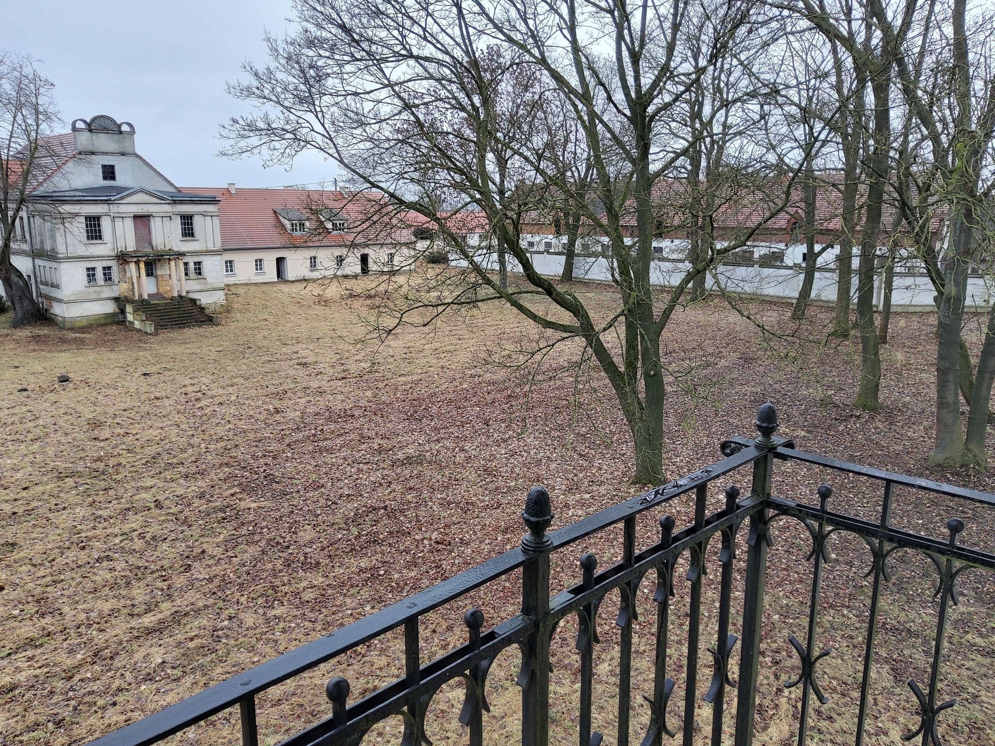 Destaca un gran edificio anexo (Ofycyna) de estilo señorial situado en la entrada. Otras construcciones incluyen una herrería y varios establos.