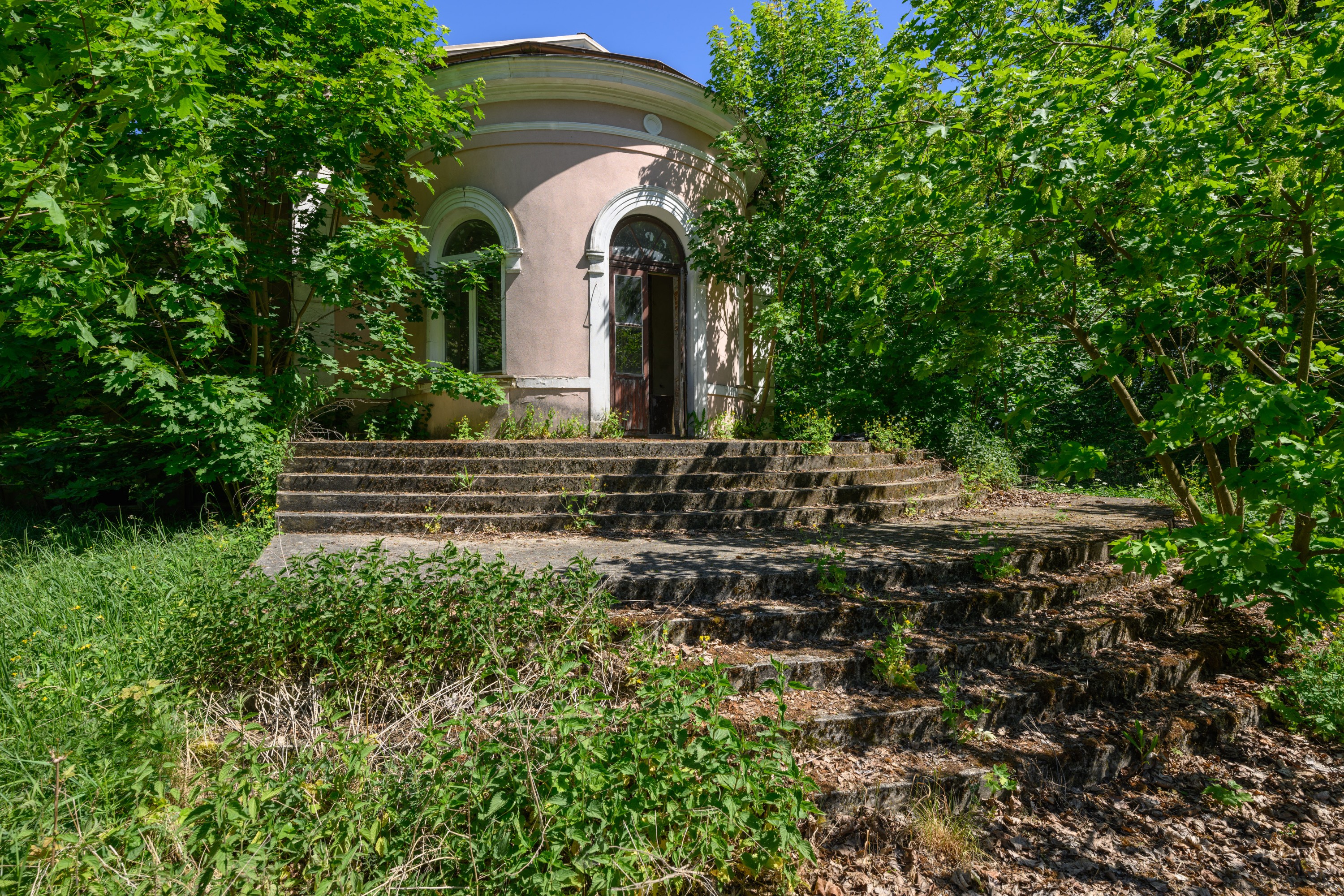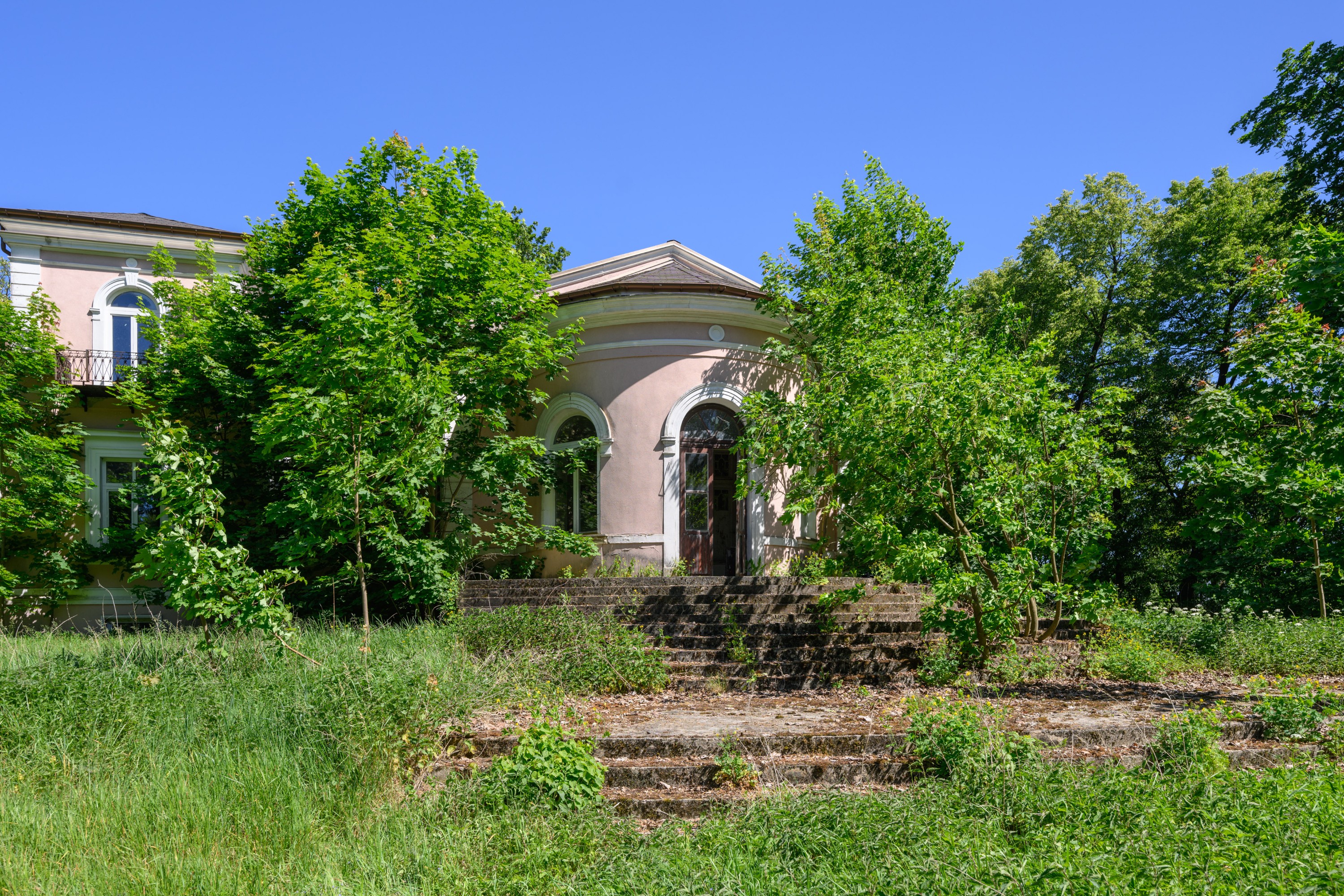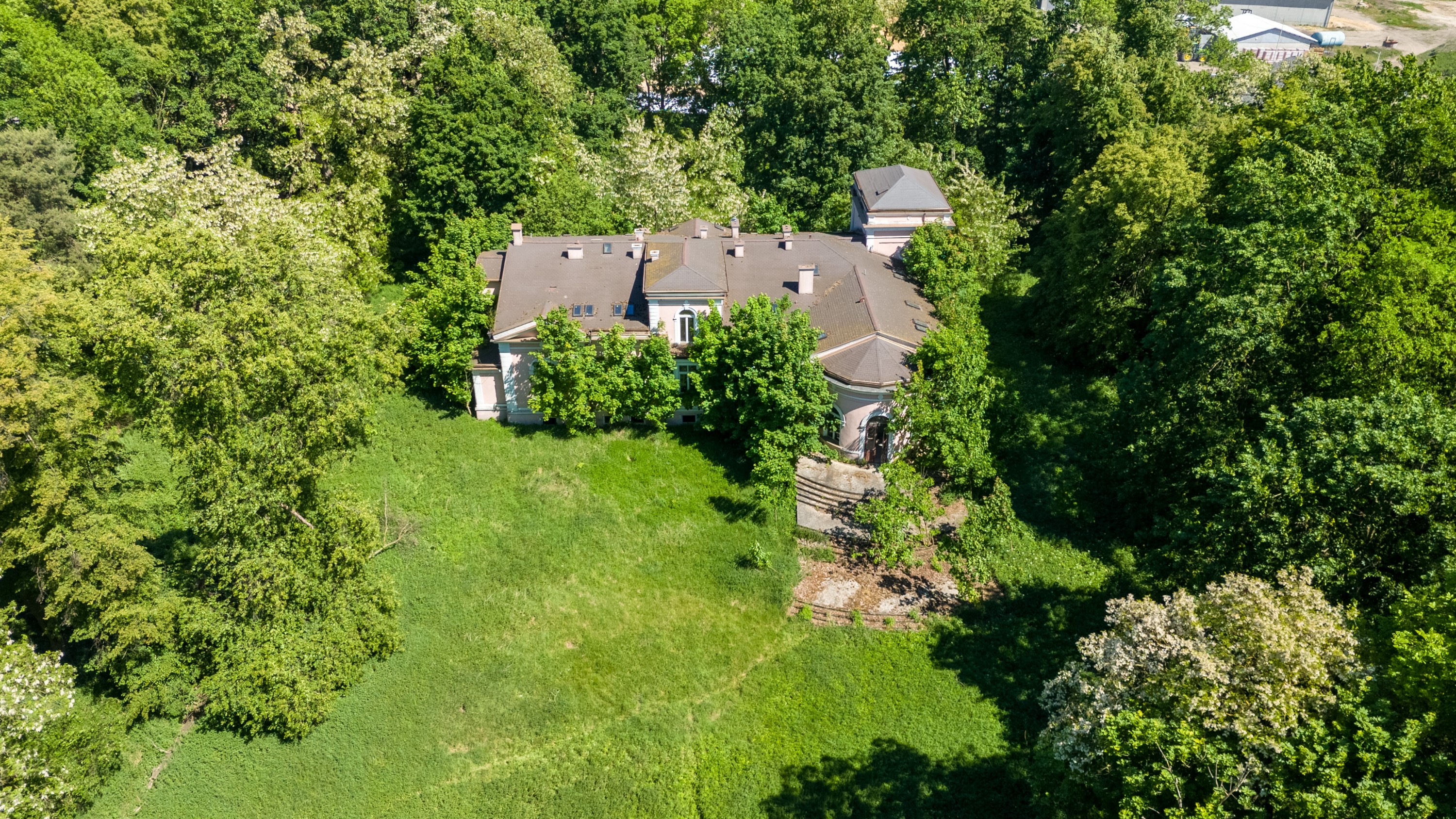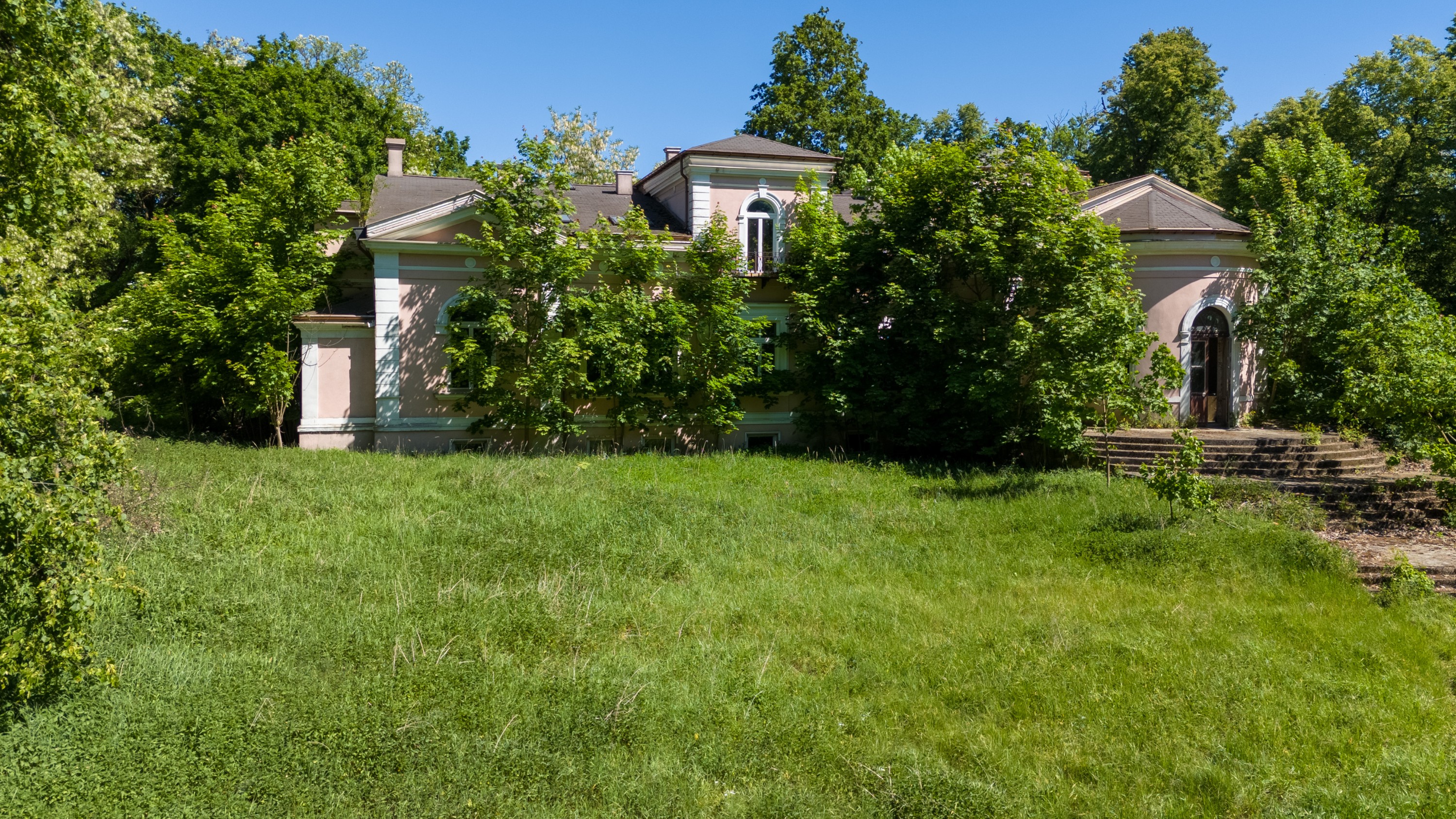 La propiedad está rodeada de un gran parque paisajístico natural. Desde el edificio se puede ver hacia el sur un estanque rodeado de árboles antiguos, principalmente tilos, arces y carpes. Frente al estanque, un paseo de castaños atraviesa perpendicularmente el eje del parque.