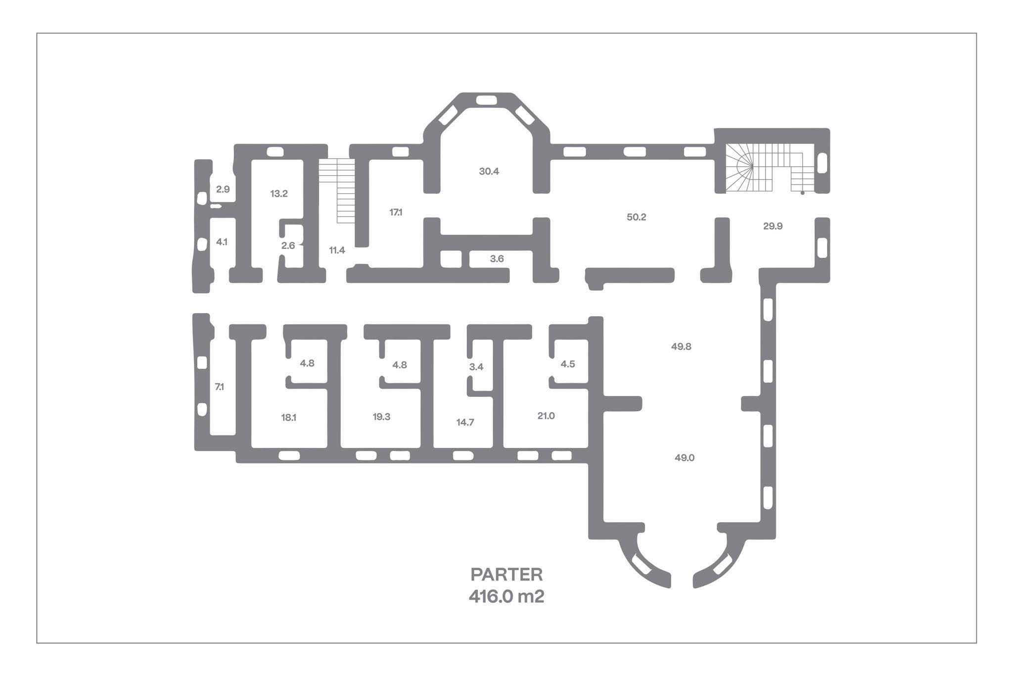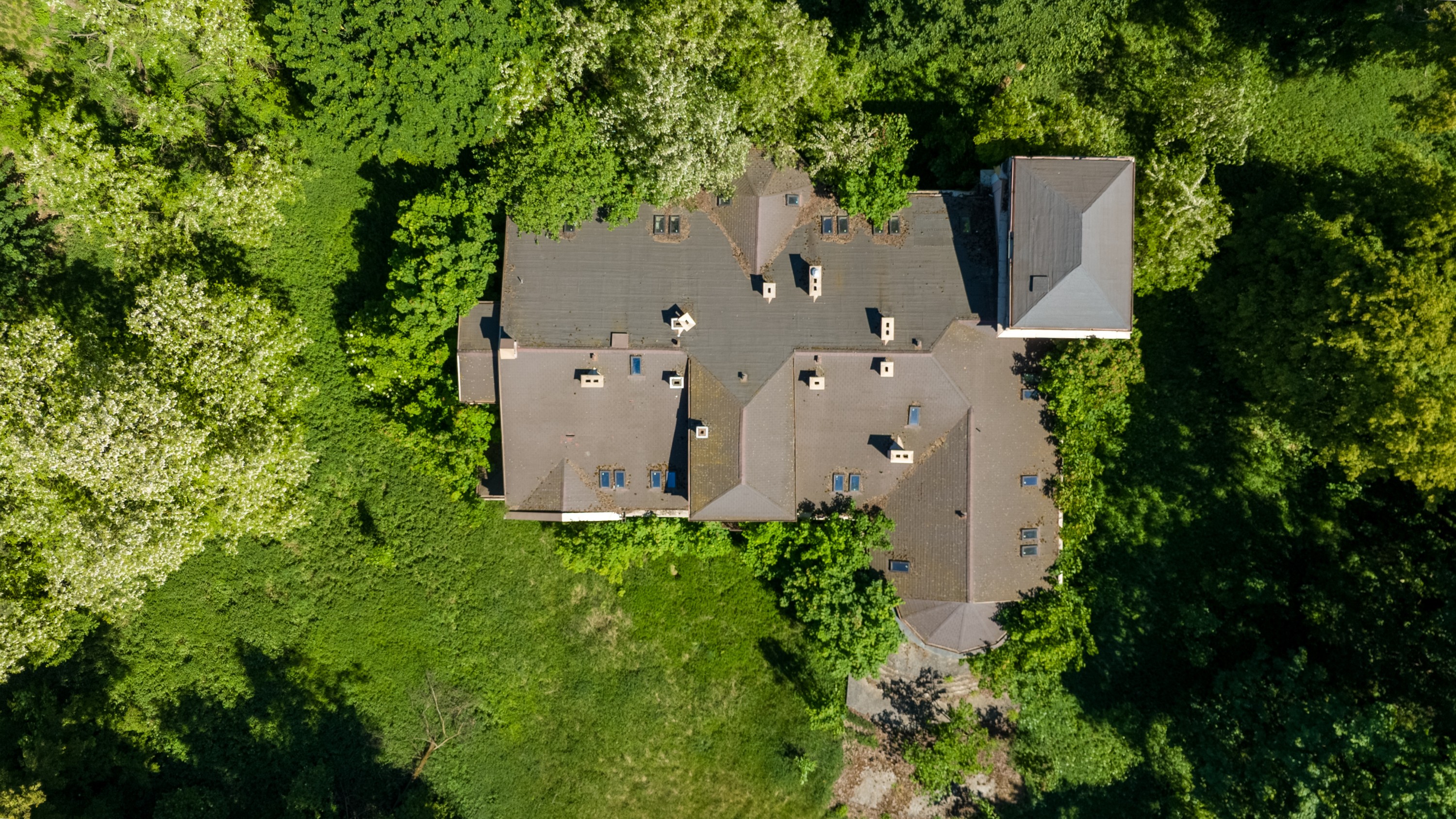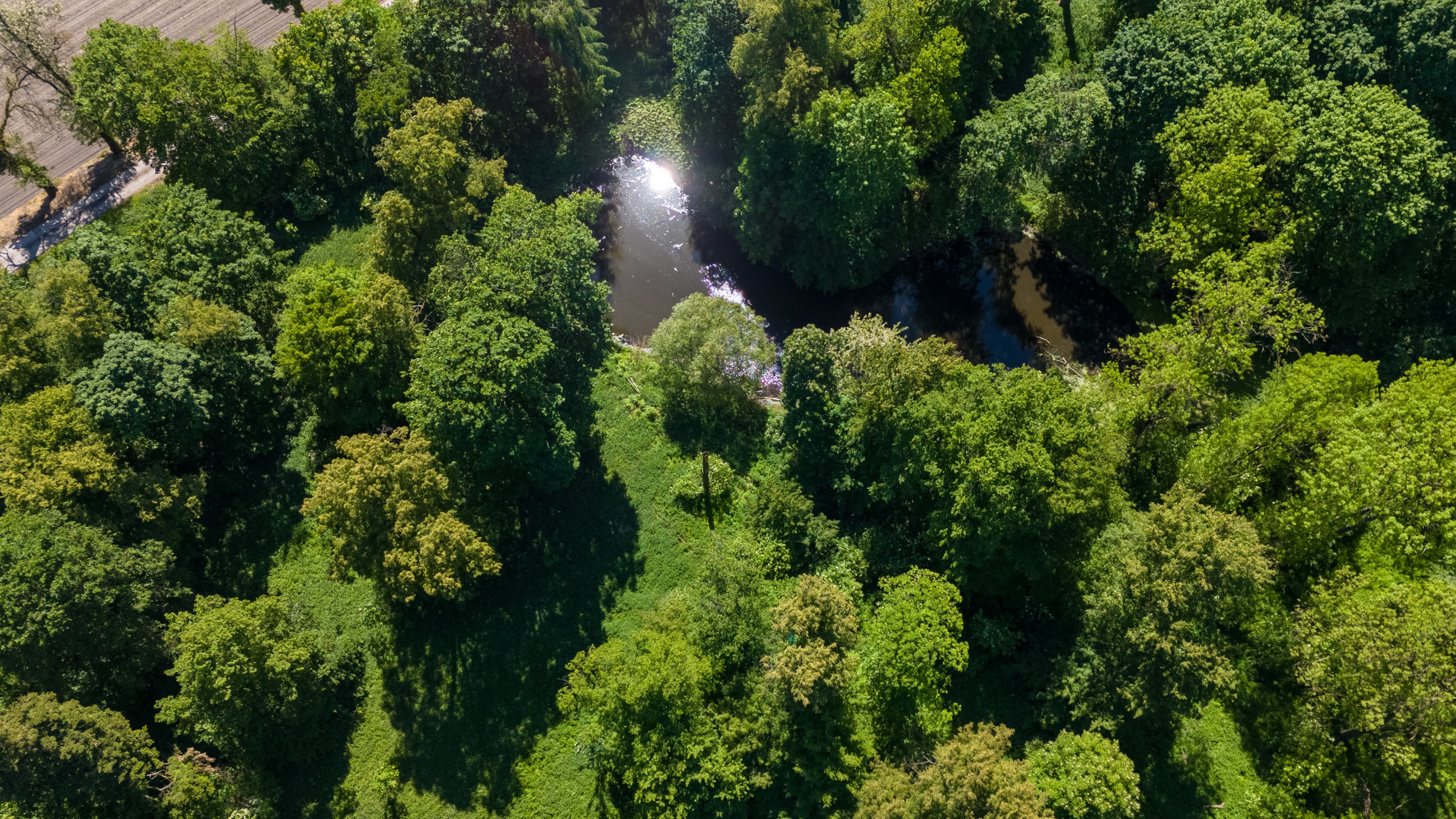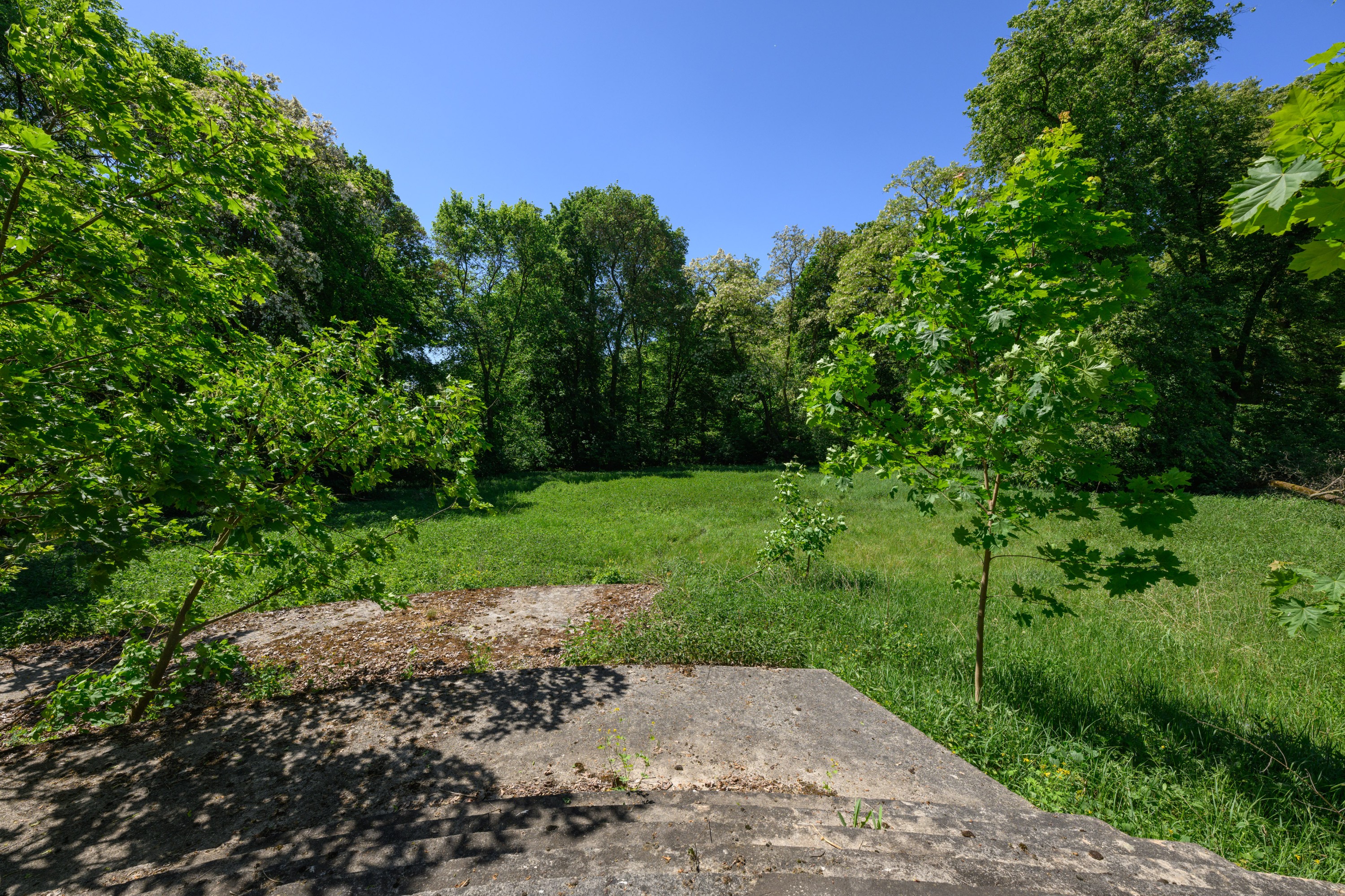 La propiedad está rodeada de un gran parque paisajístico natural. Desde el edificio se puede ver hacia el sur un estanque rodeado de árboles antiguos, principalmente tilos, arces y carpes. Frente al estanque, un paseo de castaños atraviesa perpendicularmente el eje del parque.