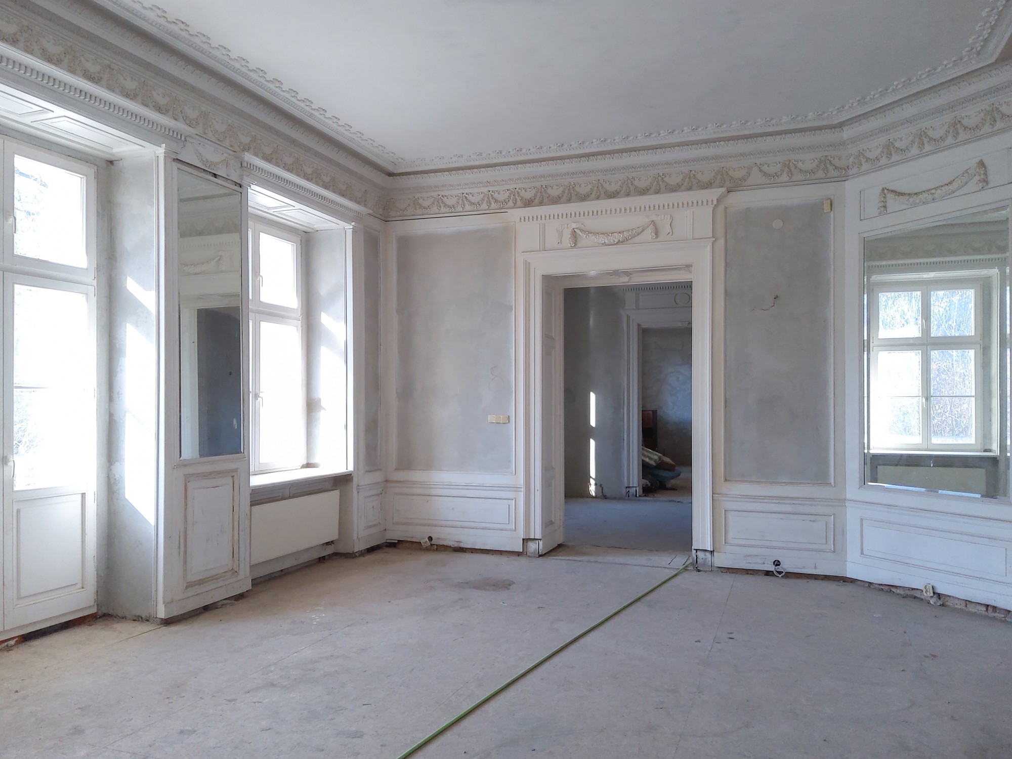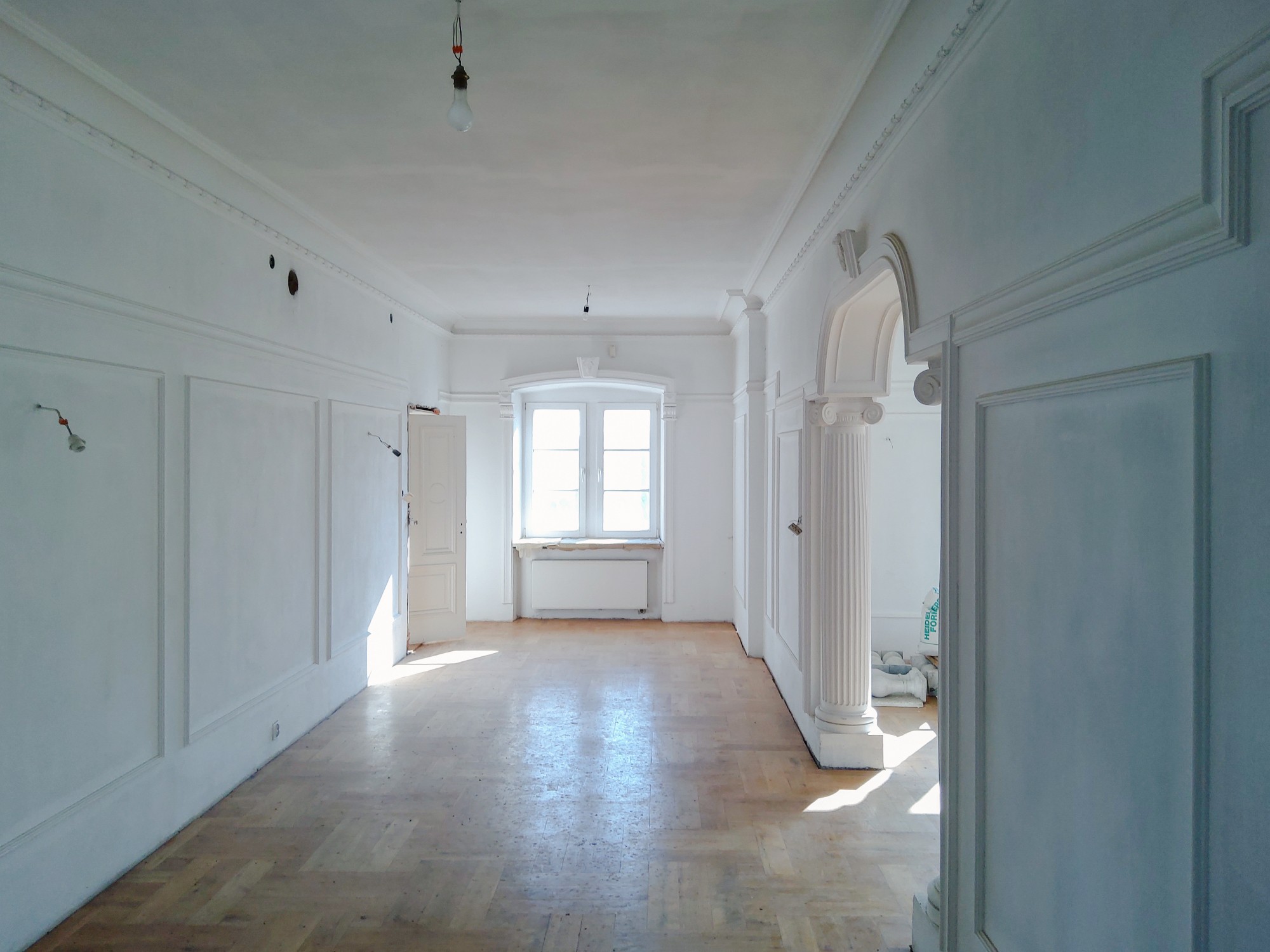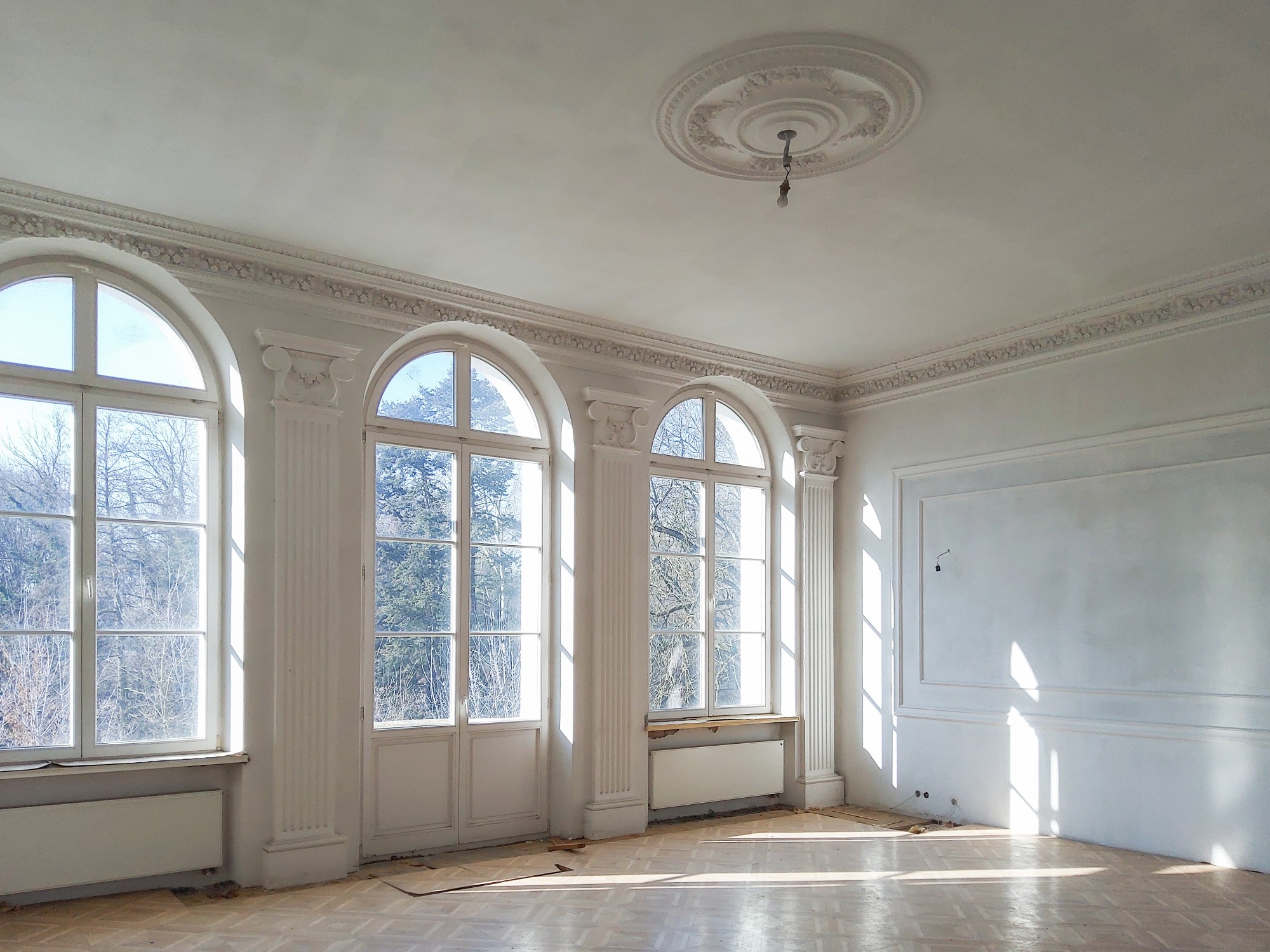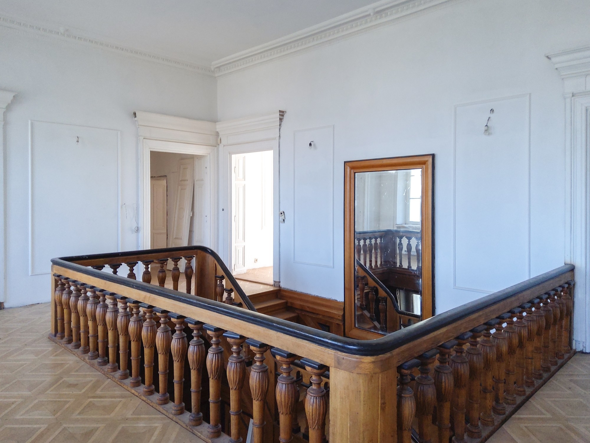 El palacio ha sido renovado de forma integral: la fachada ha sido restaurada, las ventanas y puertas han sido reemplazadas, y todas las instalaciones técnicas se han renovado. En la planta baja se encuentran grandes estancias que pueden utilizarse para actividades de restauración o conferencias, incluyendo un salón de baile ricamente decorado y una biblioteca restaurada. Las paredes y techos están adornados con estucos restaurados con esmero. Una escalera decorativa conduce al primer piso, donde se encuentran seis suites elegantemente diseñadas. Desde la habitación en la torre, se tiene una vista incomparable del lago.