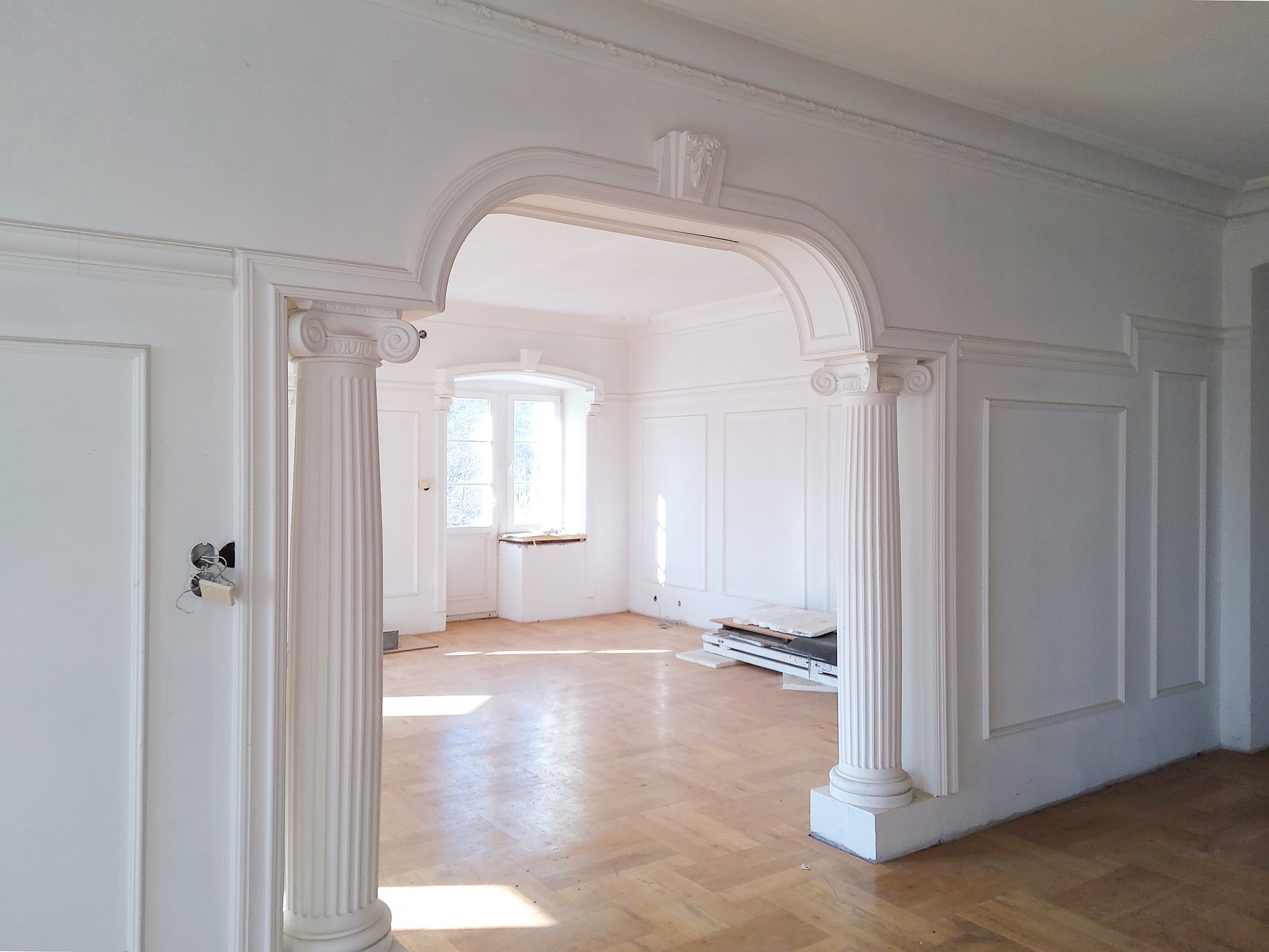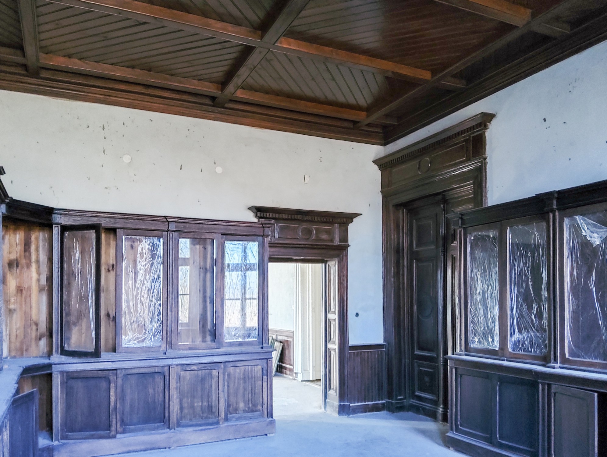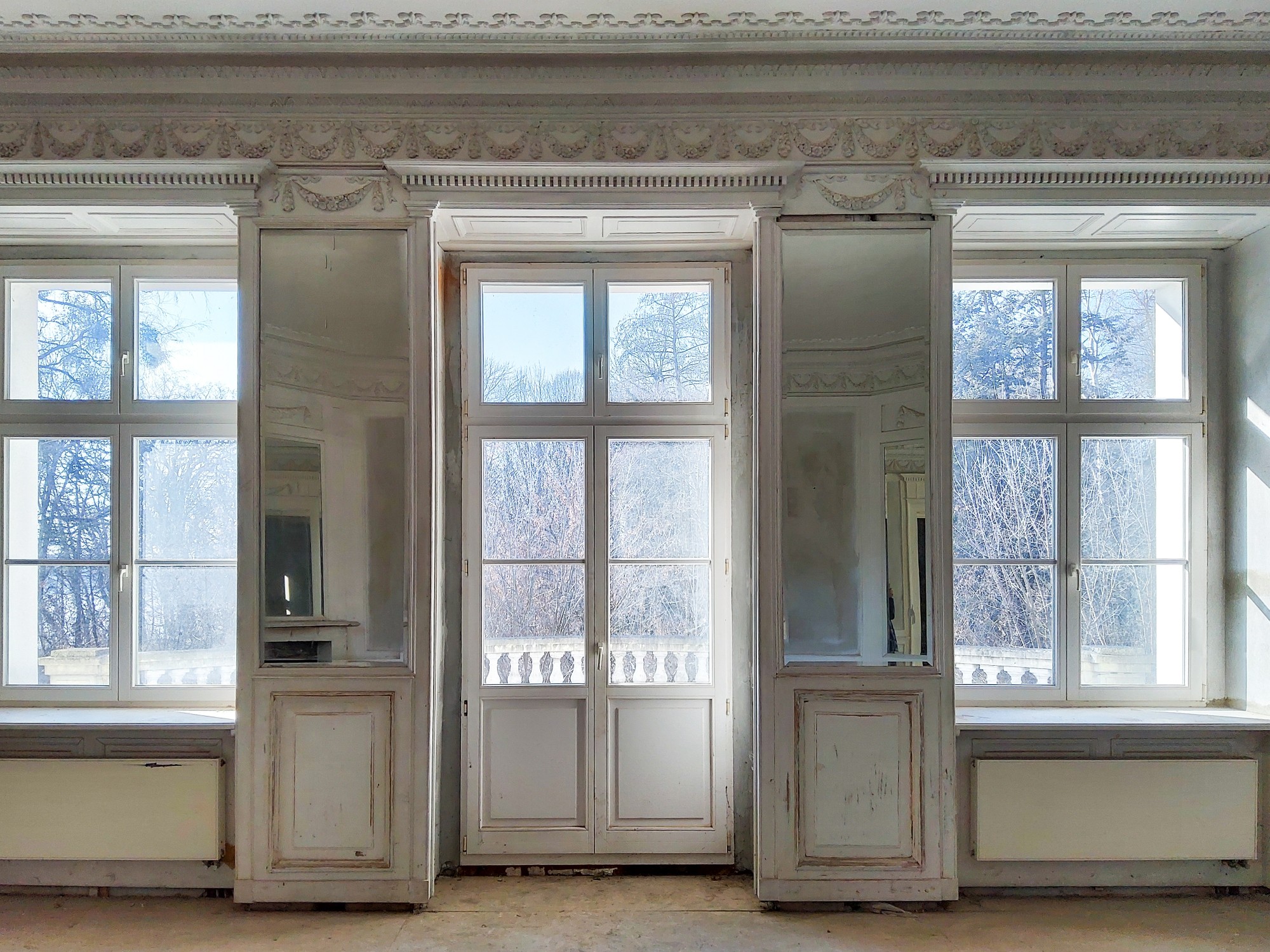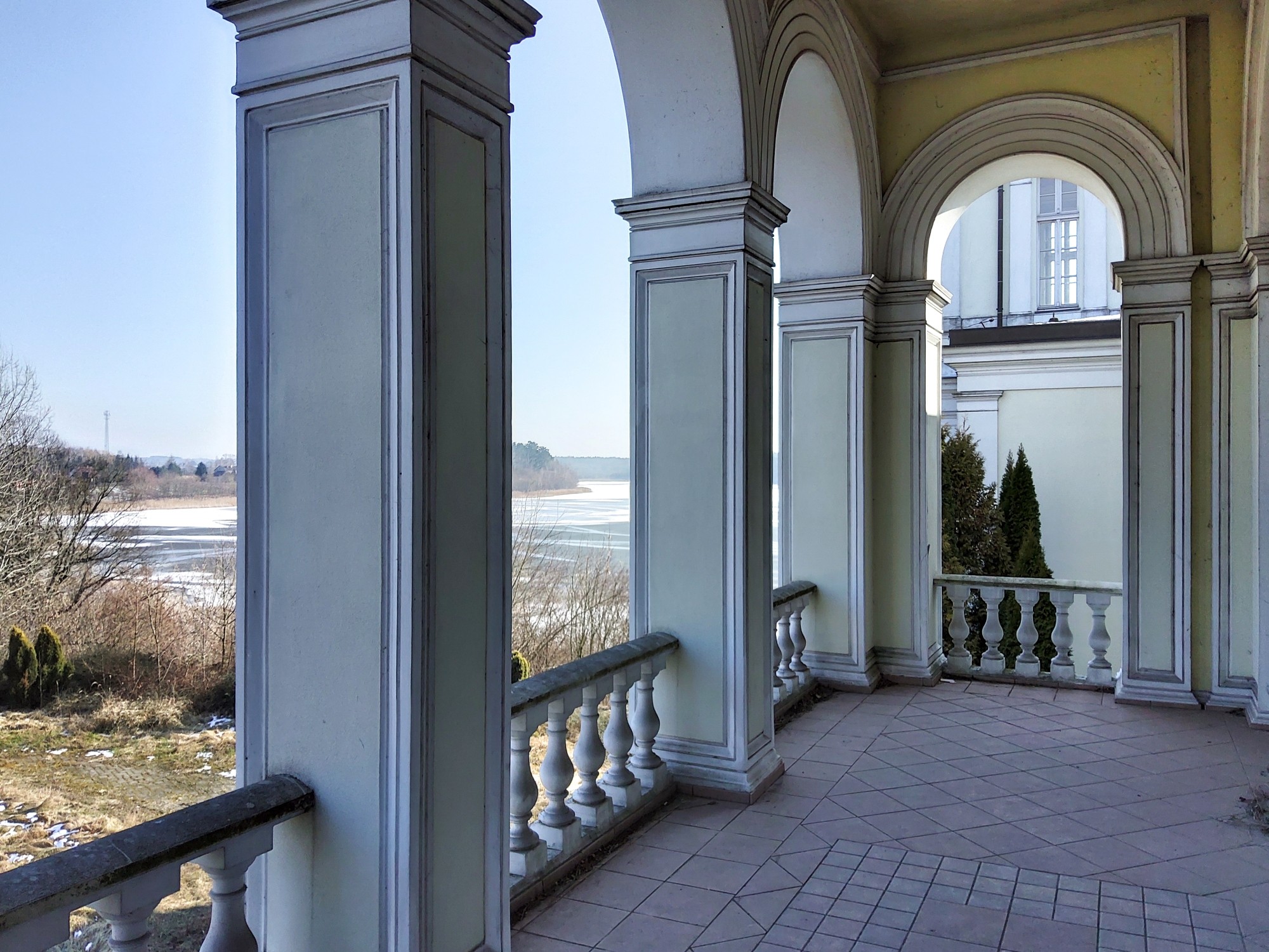El palacio ha sido renovado de forma integral: la fachada ha sido restaurada, las ventanas y puertas han sido reemplazadas, y todas las instalaciones técnicas se han renovado. En la planta baja se encuentran grandes estancias que pueden utilizarse para actividades de restauración o conferencias, incluyendo un salón de baile ricamente decorado y una biblioteca restaurada. Las paredes y techos están adornados con estucos restaurados con esmero. Una escalera decorativa conduce al primer piso, donde se encuentran seis suites elegantemente diseñadas. Desde la habitación en la torre, se tiene una vista incomparable del lago.