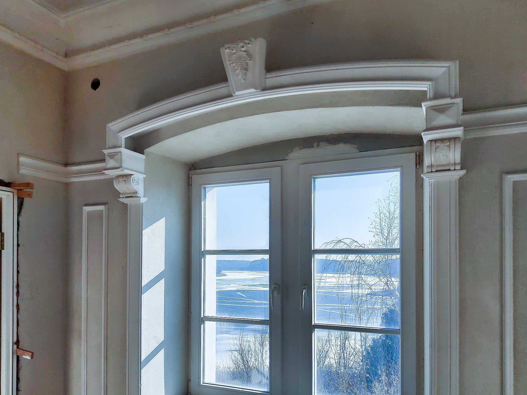Los interiores están decorados con techos de estuco con motivos florales. Las paredes están adornadas con frisos y guirnaldas talladas en madera. La superficie total del edificio es de aproximadamente 2000 m², mientras que la superficie del parque y el lago es de unos 4 hectáreas. El inventario de árboles en el parque ha sido completamente documentado con fines de conservación.