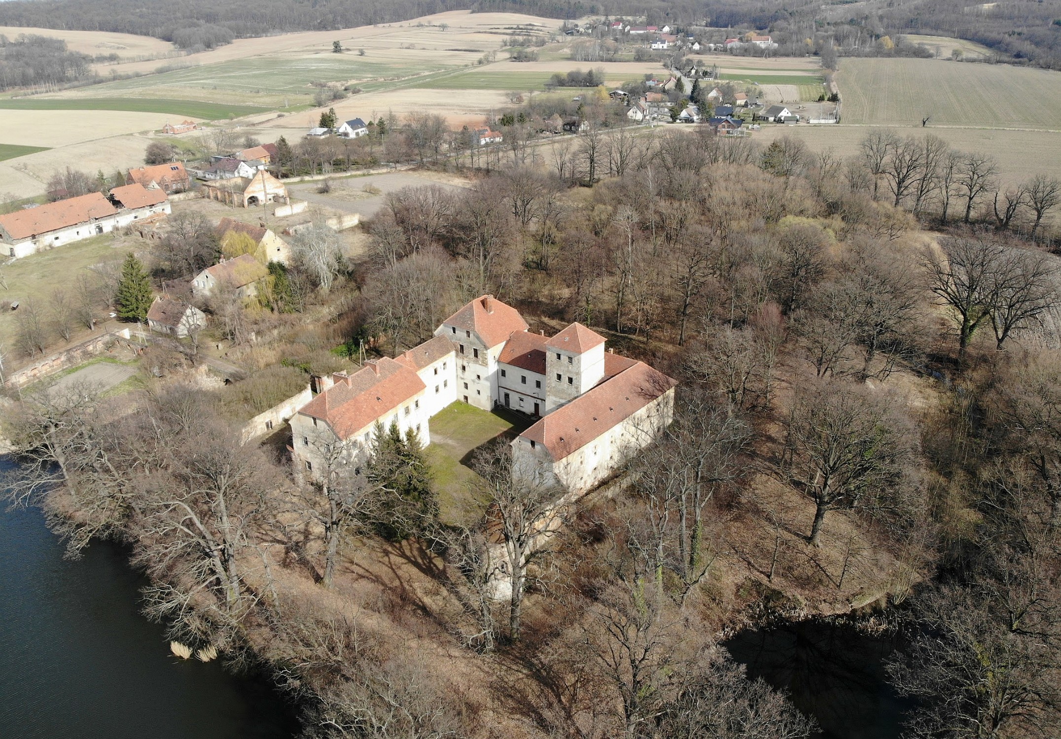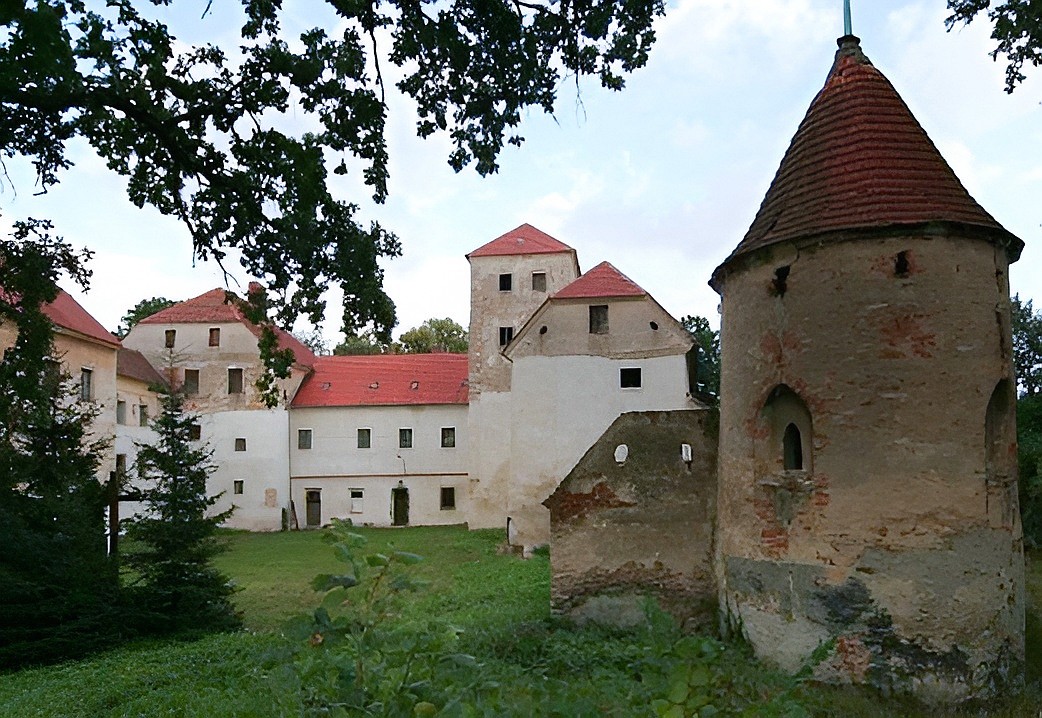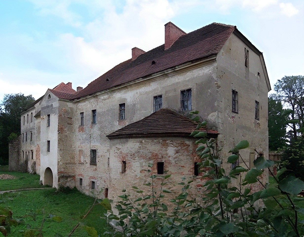 El castillo fue construido a mediados del siglo XIV en el sitio de una fortaleza más antigua. En los siglos XVI y XVII fue reconstruido en el estilo renacentista que aún se conserva. En el patio del castillo se encuentra una torre cuadrada, mientras que en el patio del conjunto señorial hay una antigua herrería de estilo barroco. Un puente de piedra reemplazó al puente levadizo original y conecta los dos patios en la actualidad.