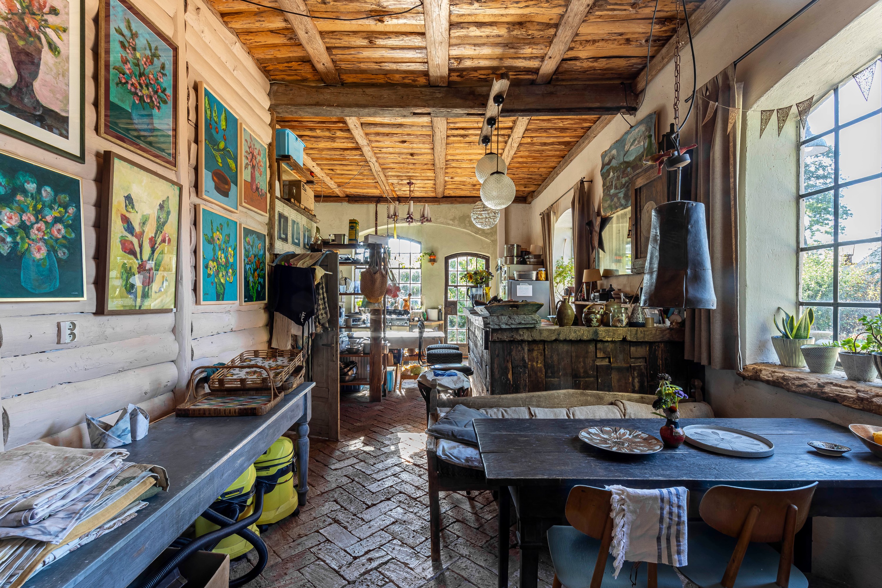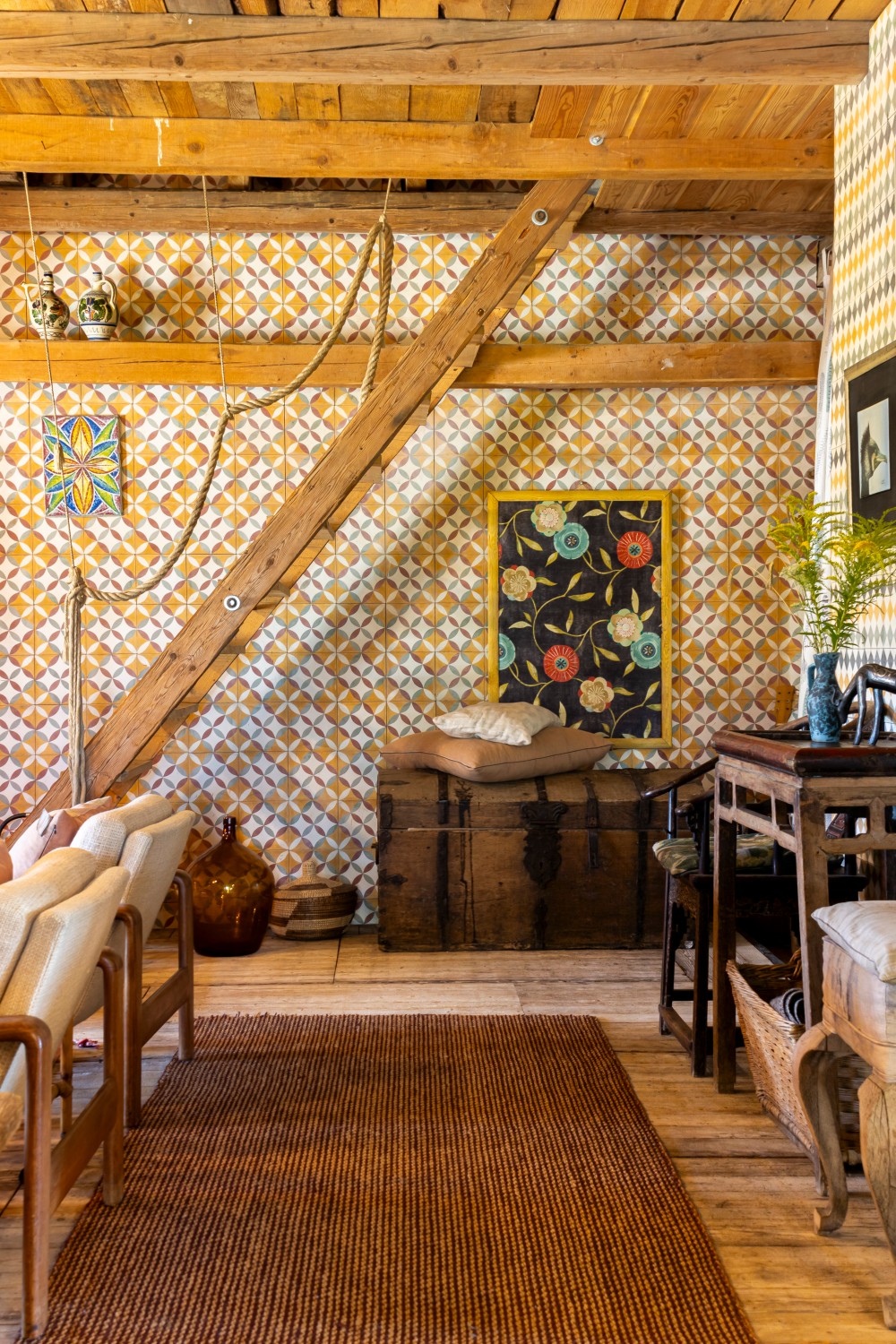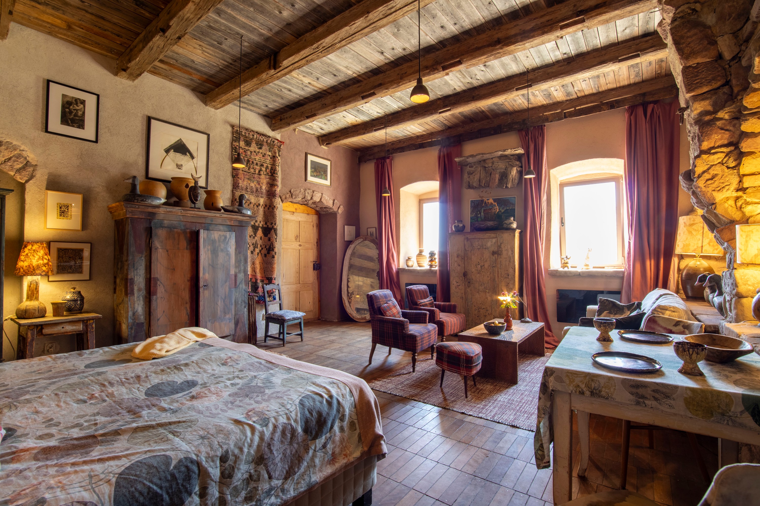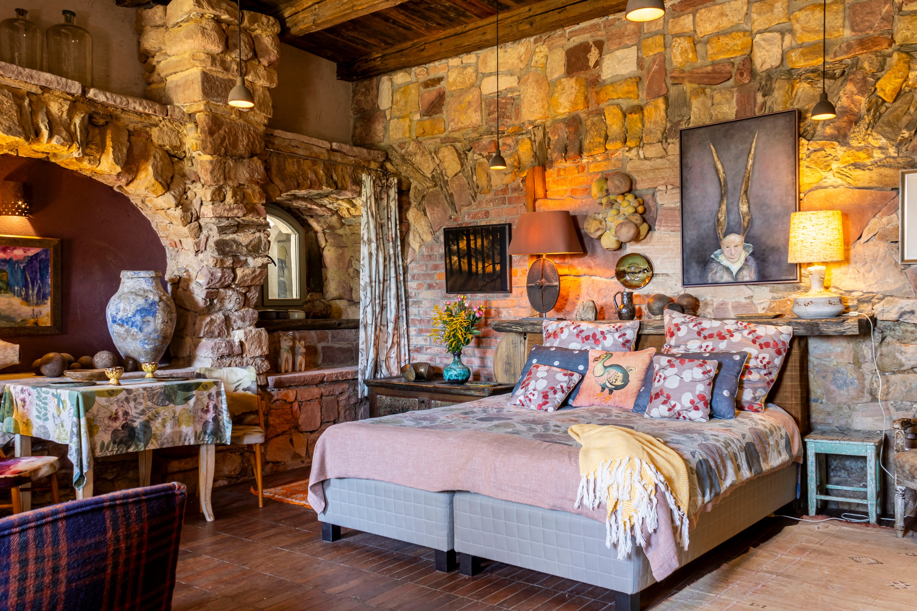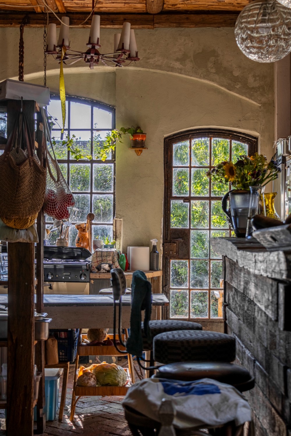 El escenógrafo y artista neerlandés Urian Hopman no dejó nada al azar. Casi todo en este lugar ha sido concebido y fabricado a mano por él mismo: ventanas, muebles, tejidos y muros cuentan una historia estética única. El resultado es un espacio vital cuidadosamente orquestado, en el que cada rincón, cada detalle y cada línea han sido pensados con esmero. Más de veinte años de trabajo constante han dado lugar a una obra ahora terminada.