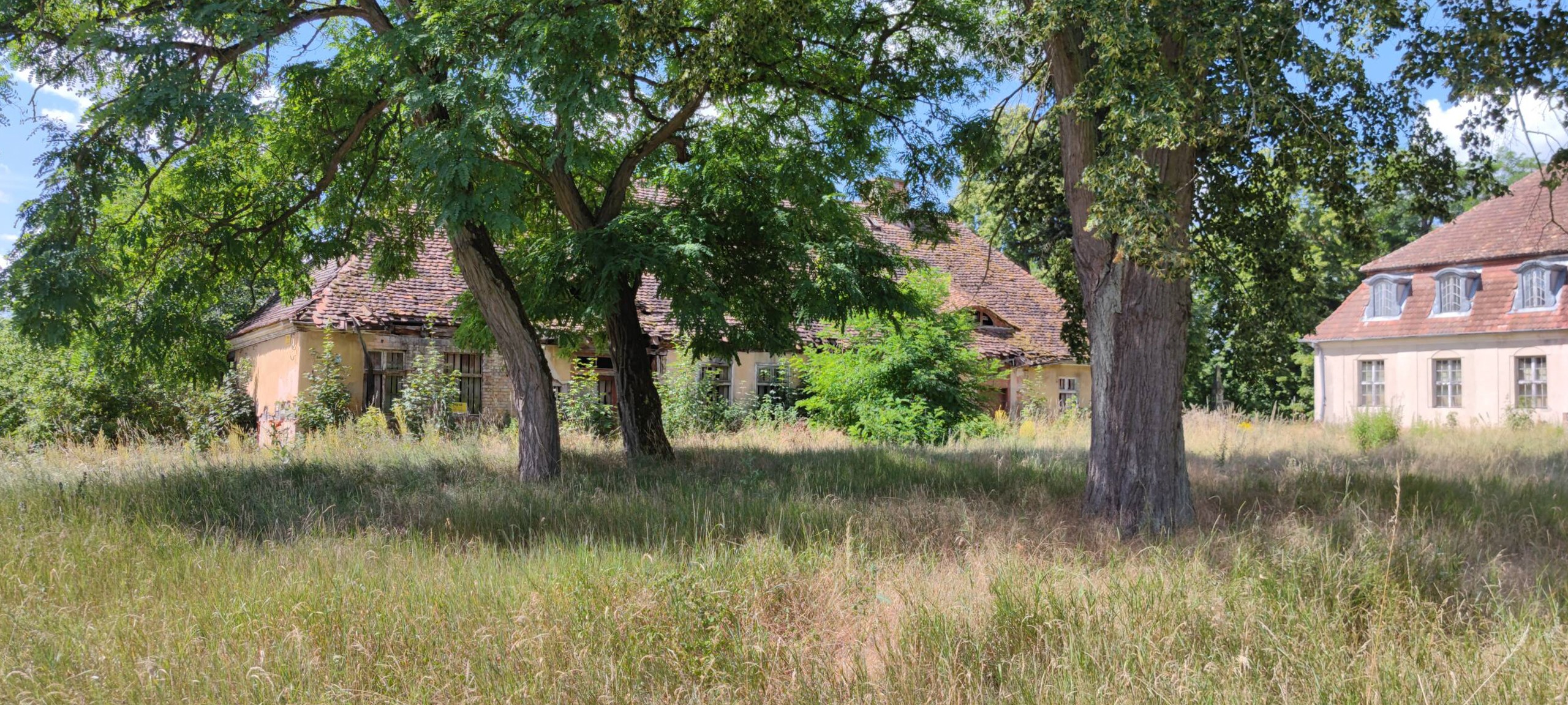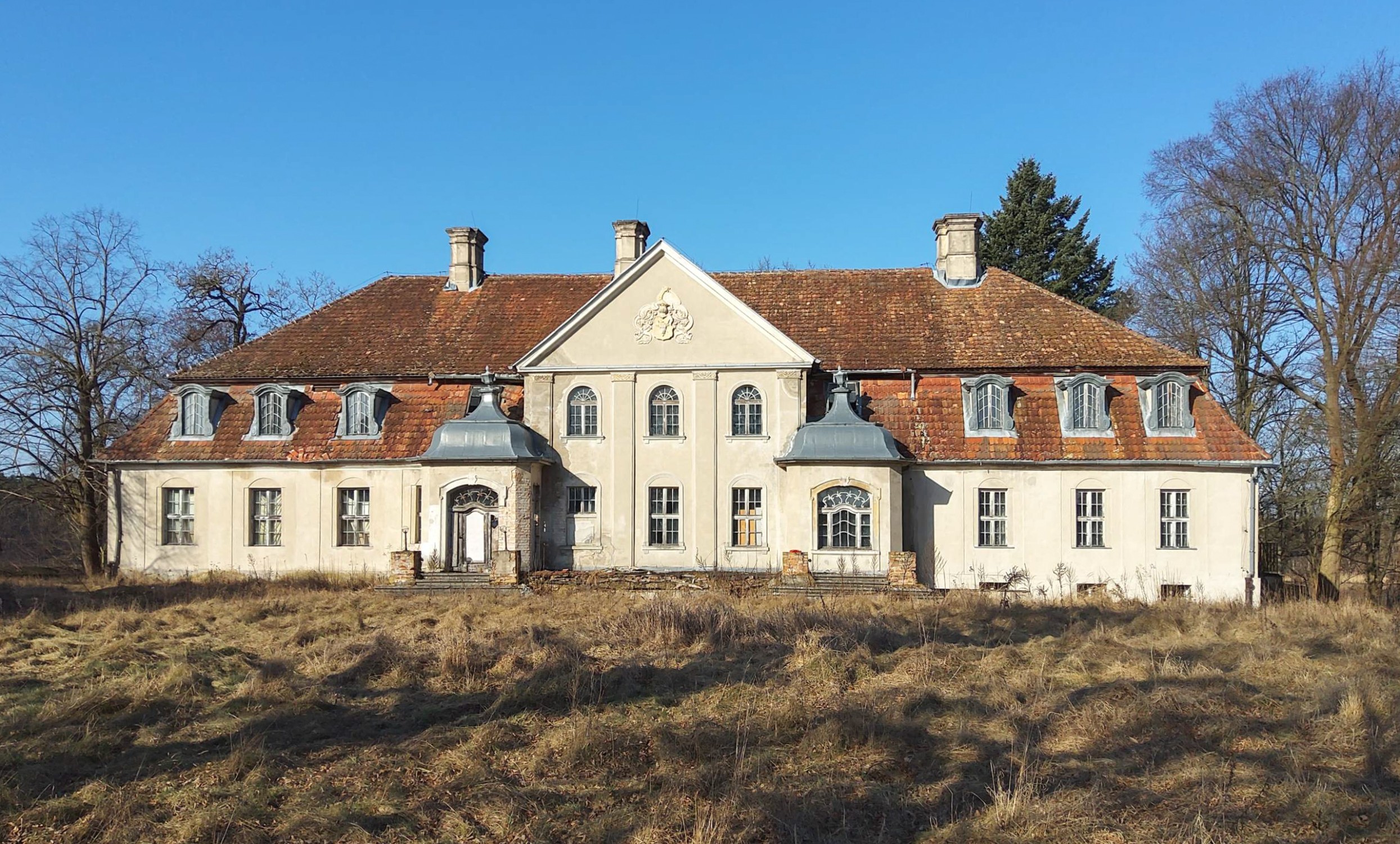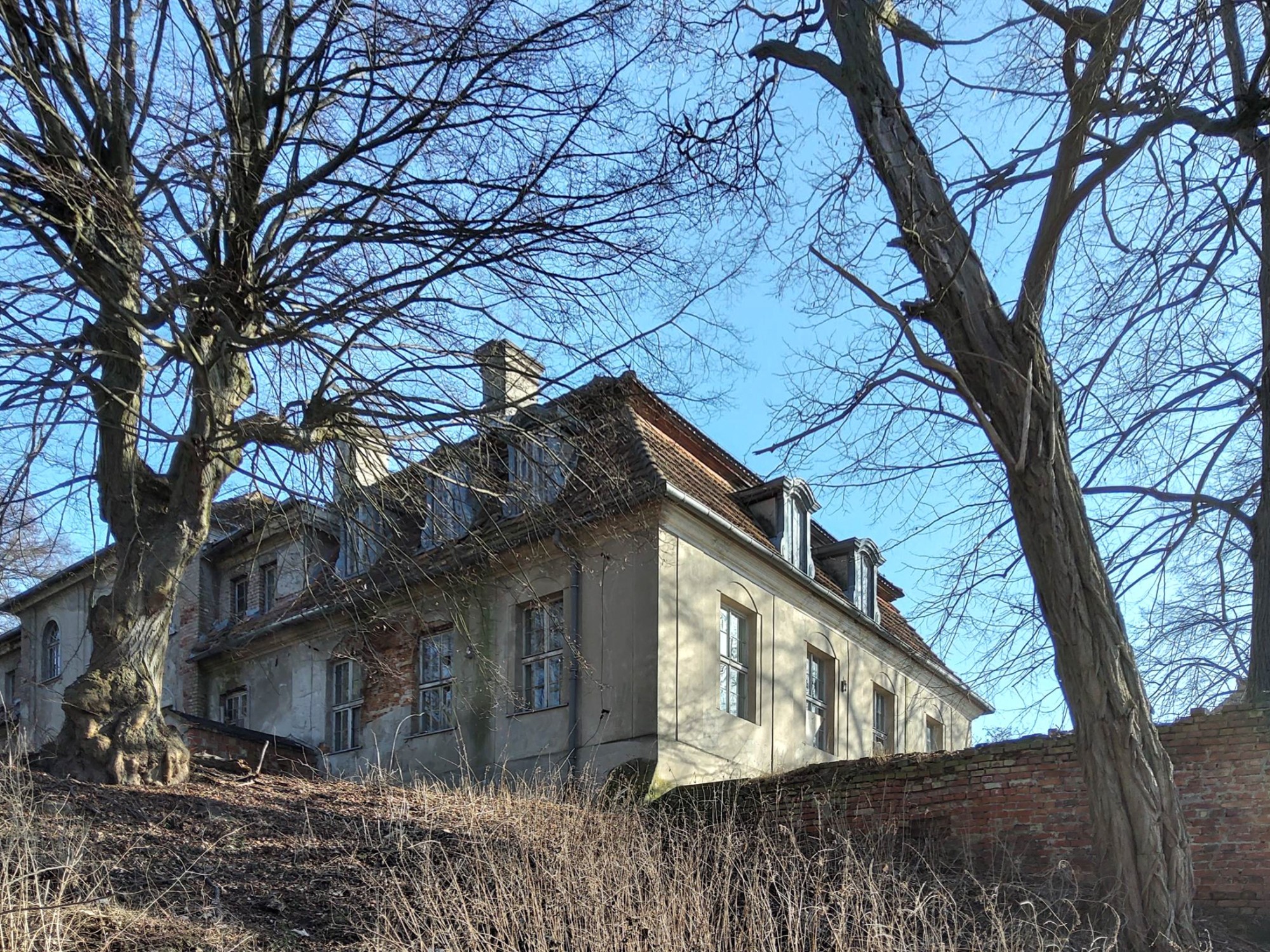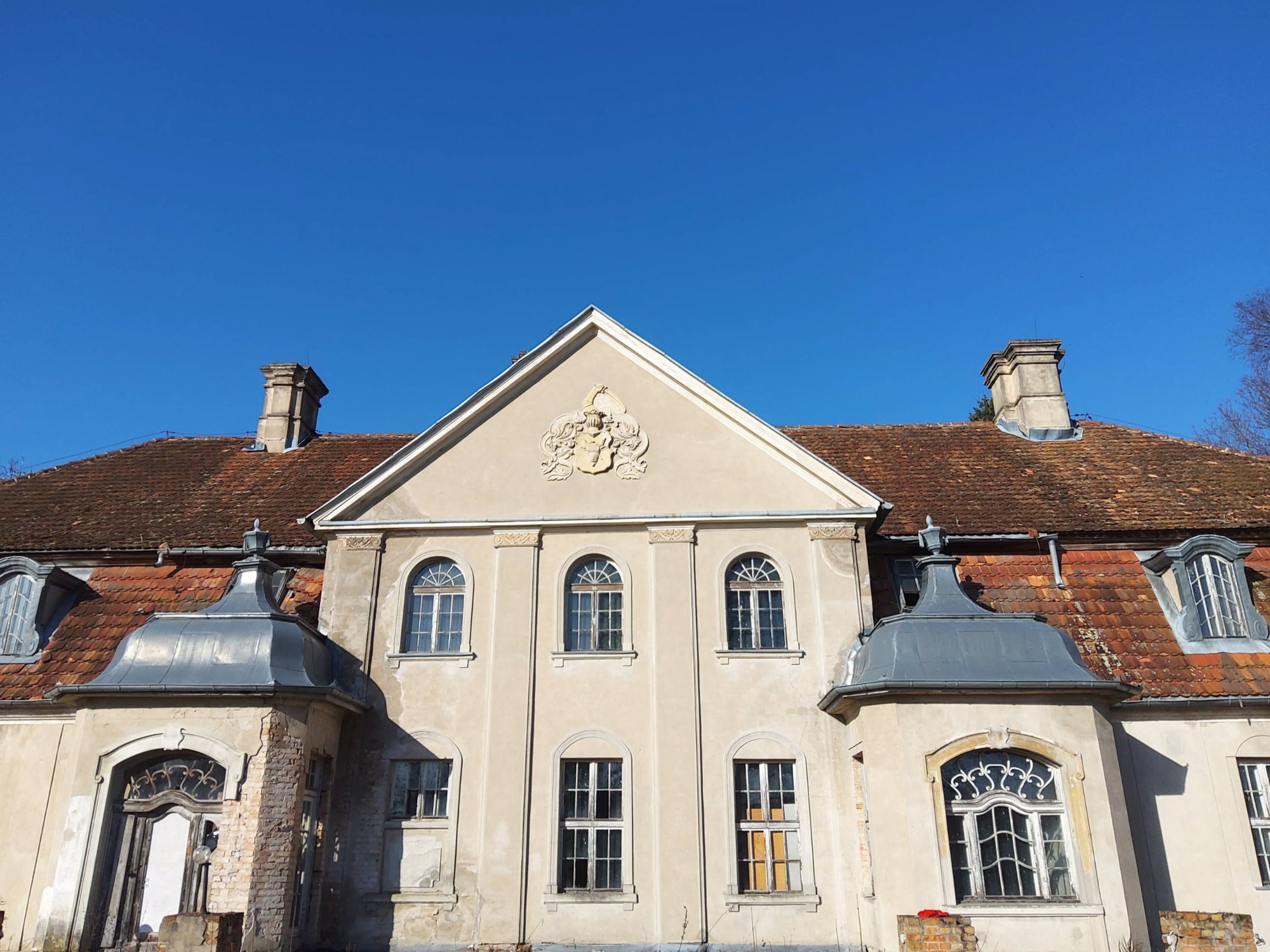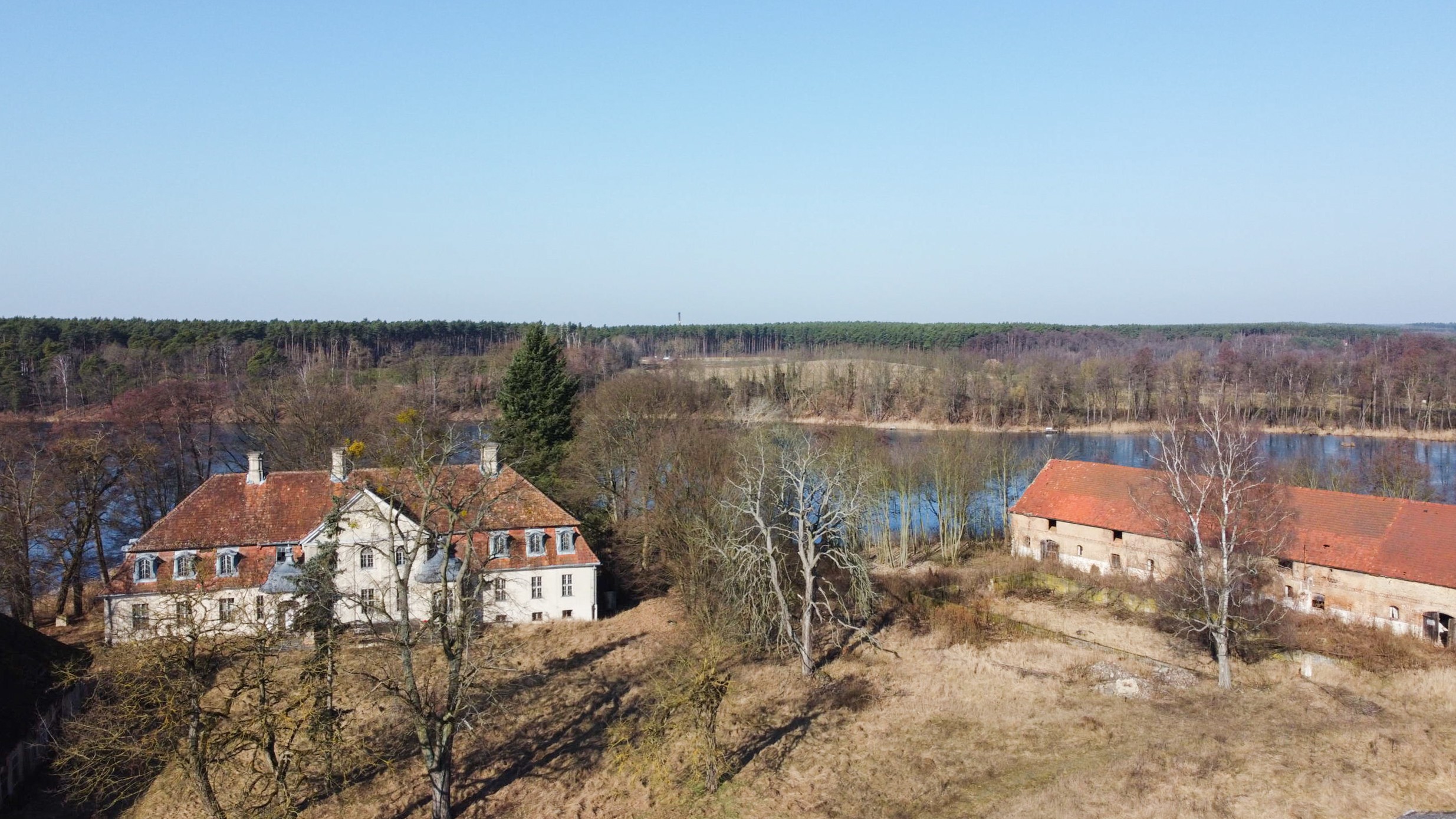 La propiedad se sitúa en una península privada de aproximadamente 30.000 m² en el voivodato de Lubusz, a orillas de un lago y rodeada por un parque histórico con robles y hayas centenarias. Los orígenes de la finca se remontan al siglo XIII, conservando elementos de diversas épocas como bóvedas góticas y un portal barroco. En la década de 1980, se llevó a cabo una consolidación estructural que incluyó la renovación de forjados y escaleras en hormigón. Desde entonces, los interiores se mantienen en bruto, preparados para su acondicionamiento final.