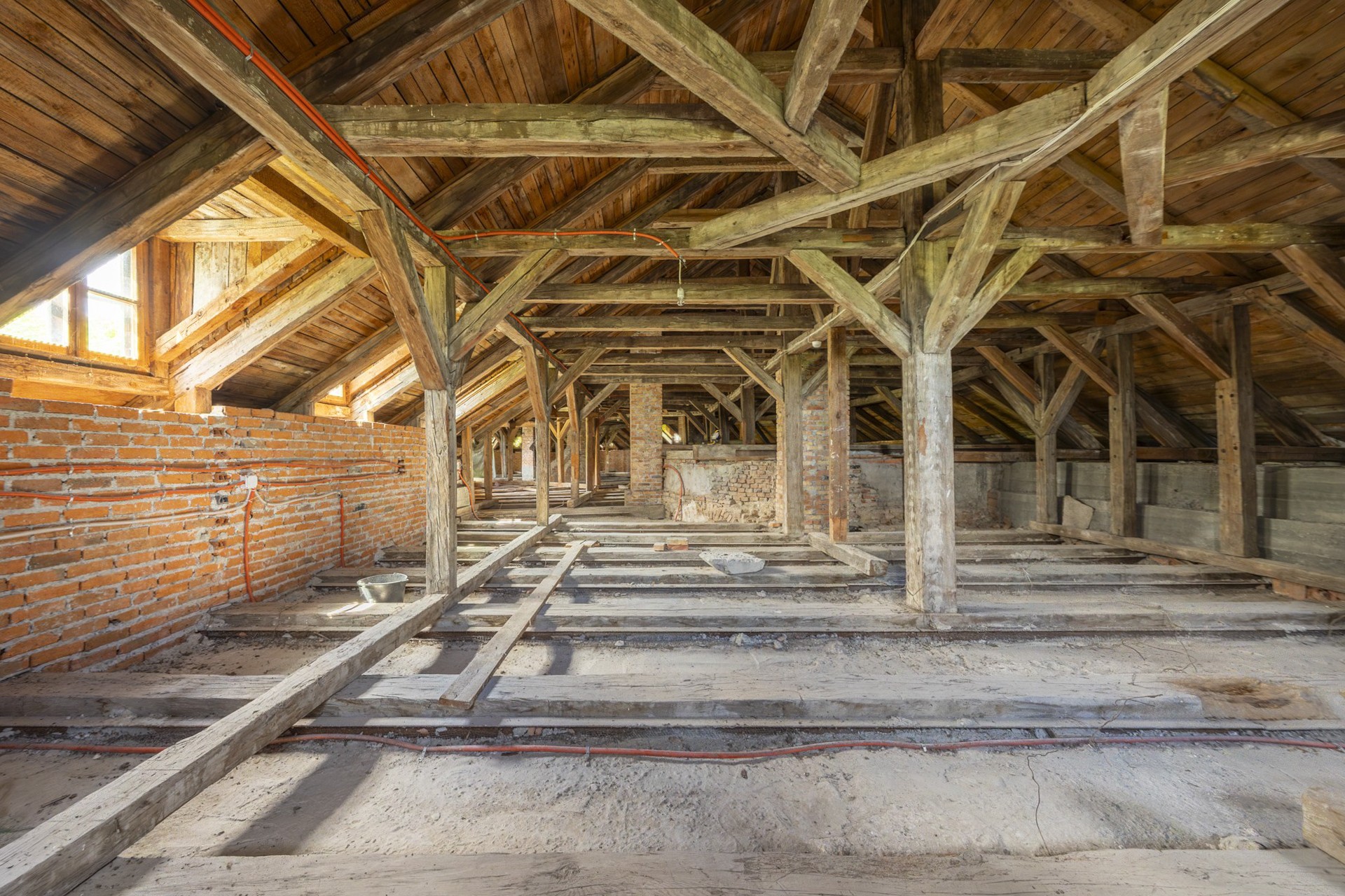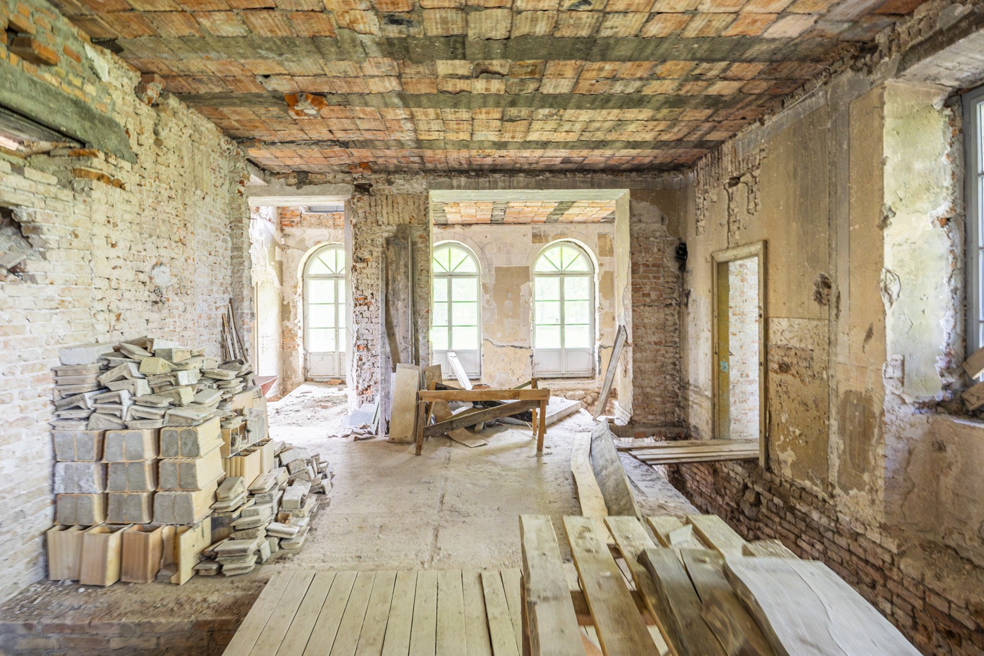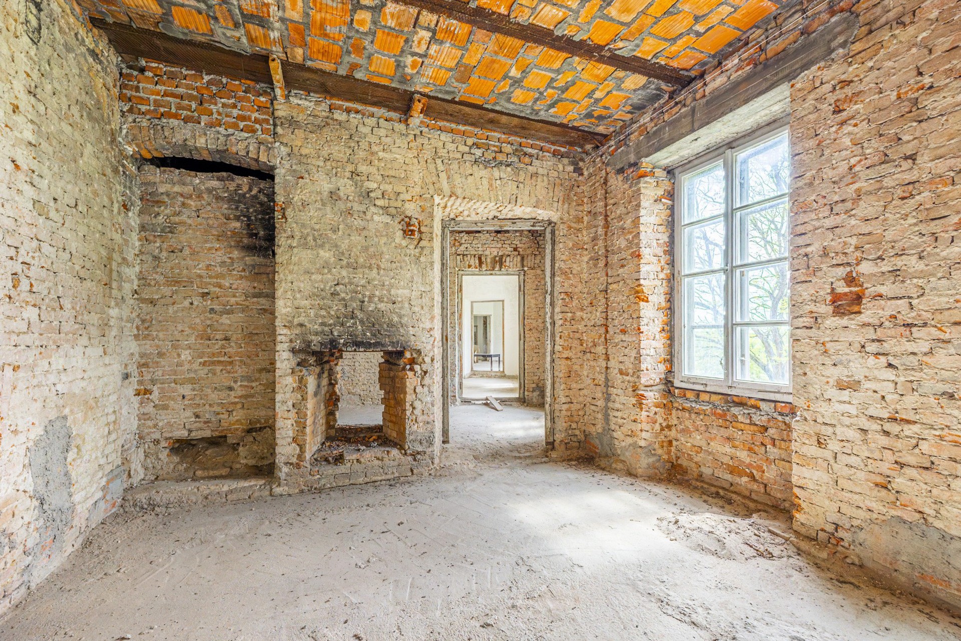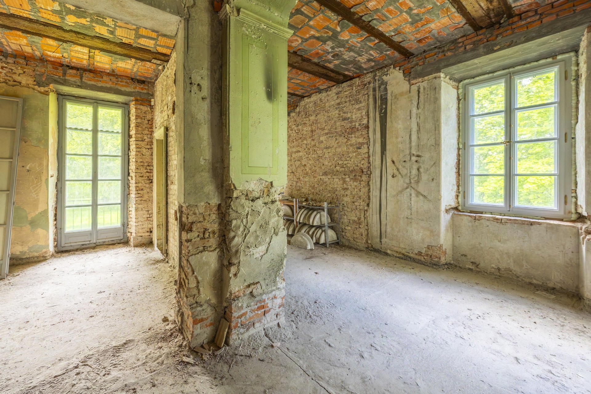 La estructura está en condiciones estables, ofreciendo una base sólida para las reformas previstas. Los techos originales de vigas de madera fueron sustituidos por losas modernas de hormigón, y diez ventanas fueron restauradas cuidadosamente con la aprobación de las autoridades de patrimonio. El techo ha sido reparado y conservado. Además, ya cuenta con conexión eléctrica y suministro propio de agua a través de un pozo privado.
