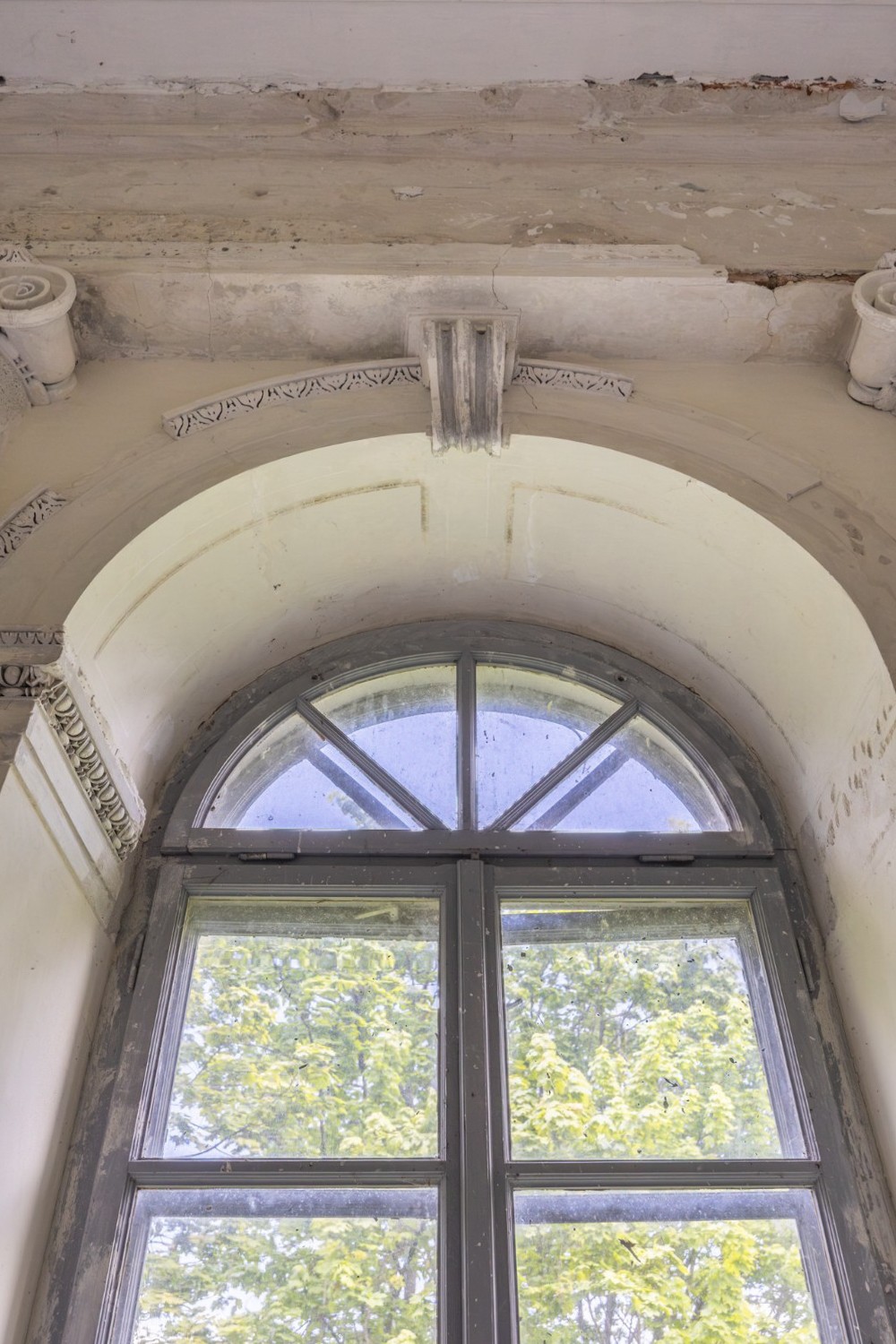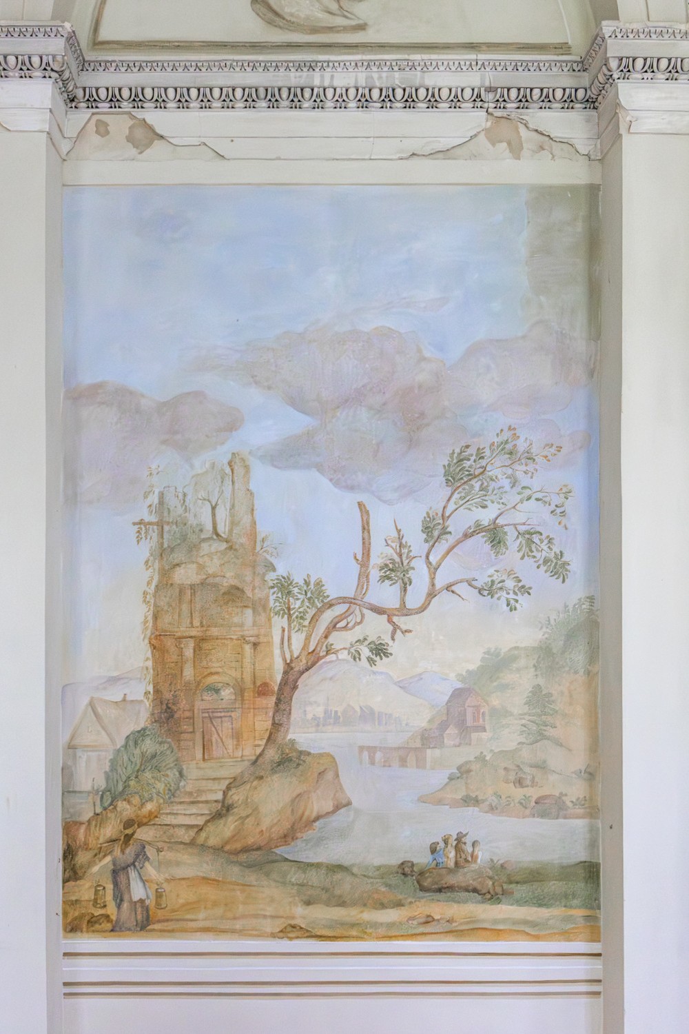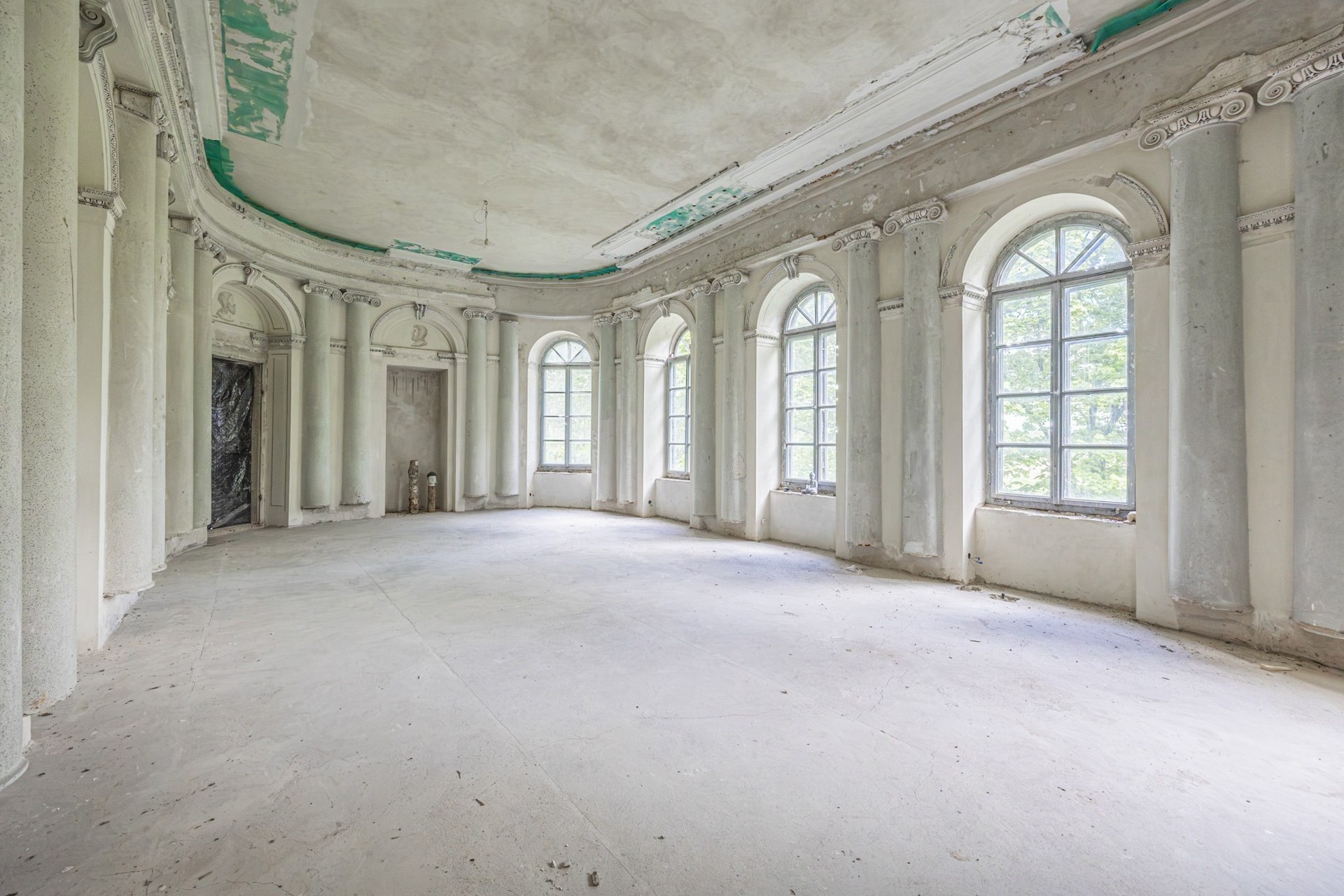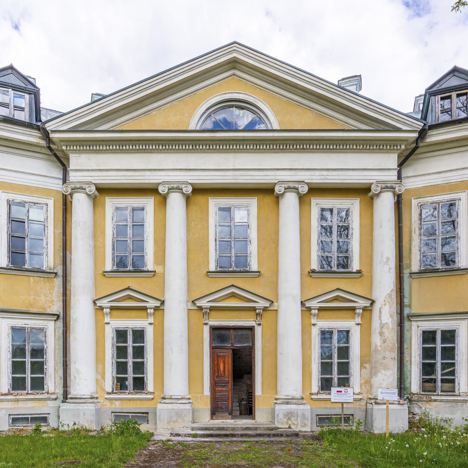 El área de entrada conduce a un amplio conjunto de estancias. En la planta baja se encuentran las habitaciones principales y un comedor decorado con frescos al fresco que muestran vistas del parque Łazienki de Varsovia y un monumento al rey Juan III Sobieski. Estos frescos aún son visibles pero de forma tenue y podrían ser restaurados por especialistas en conservación artística.