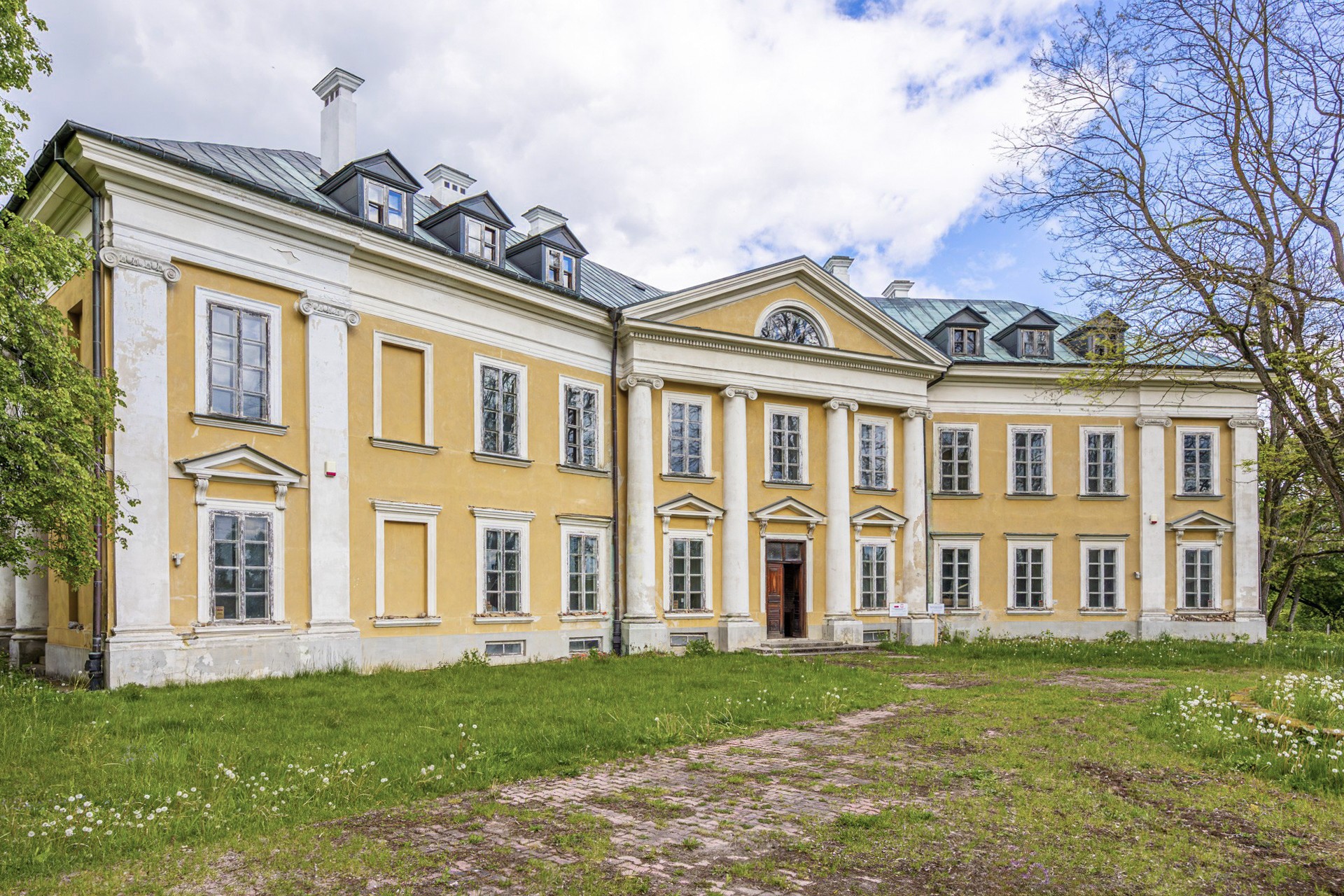 El edificio consta de dos alas rectangulares dispuestas en un ángulo obtuso. La sección central, con tres vanos de ventana, está destacada por un pórtico jónico con cuatro columnas. La fachada del jardín presenta un diseño irregular, con un pórtico que sostiene un balcón y una logia en la esquina del edificio. Esta disposición rompe deliberadamente con los patrones típicos del barroco-neoclasicismo. El parque se extiende al oeste del palacio, mientras que al norte y este limita con un área protegida con un pequeño arroyo.