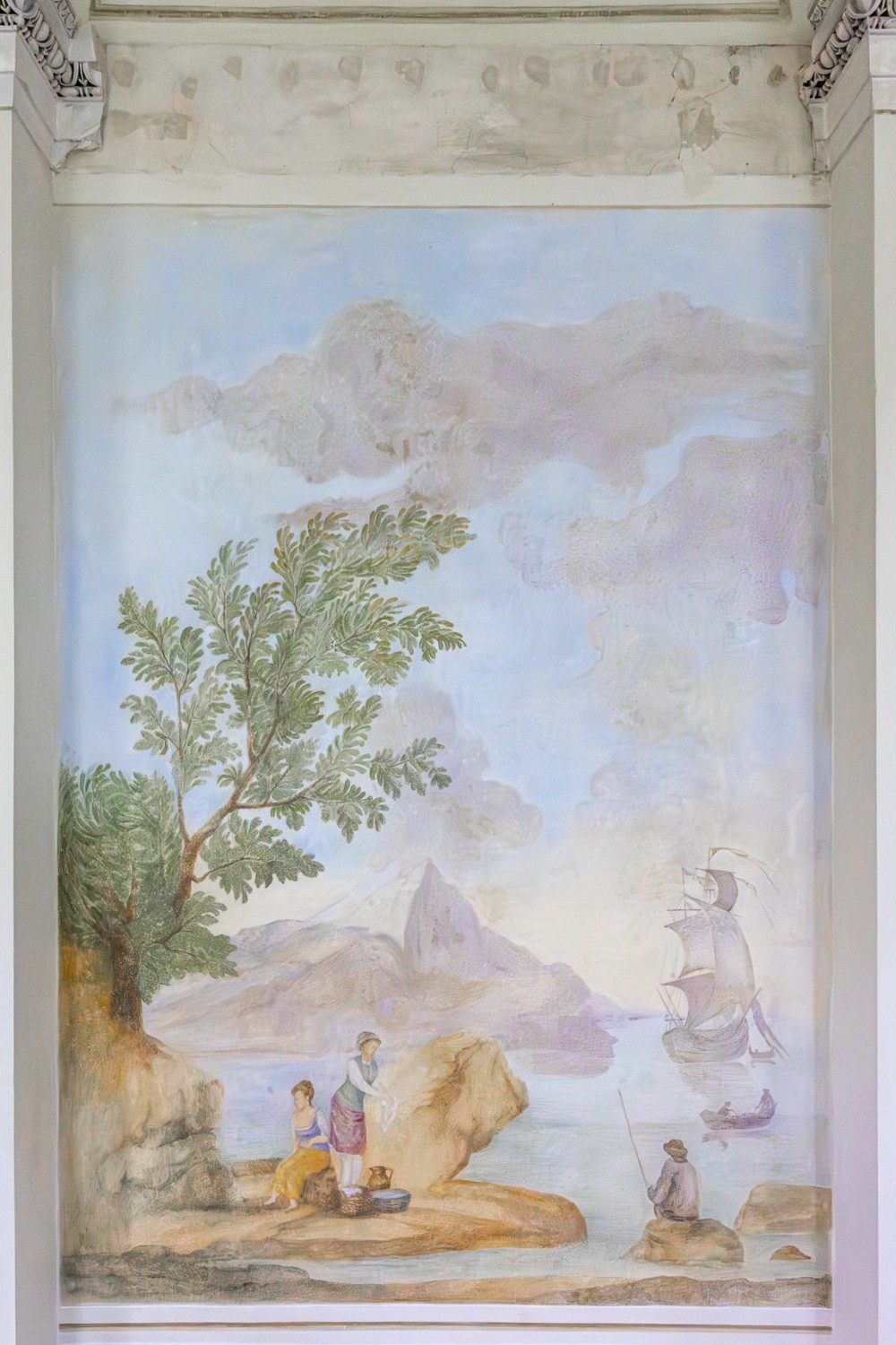 En la planta superior estaban las estancias representativas, incluyendo un gran comedor y un salón de baile con columnas semicirculares de mosaico. El salón de baile ha sido parcialmente restaurado, con pinturas murales renovadas y ventanas nuevas.