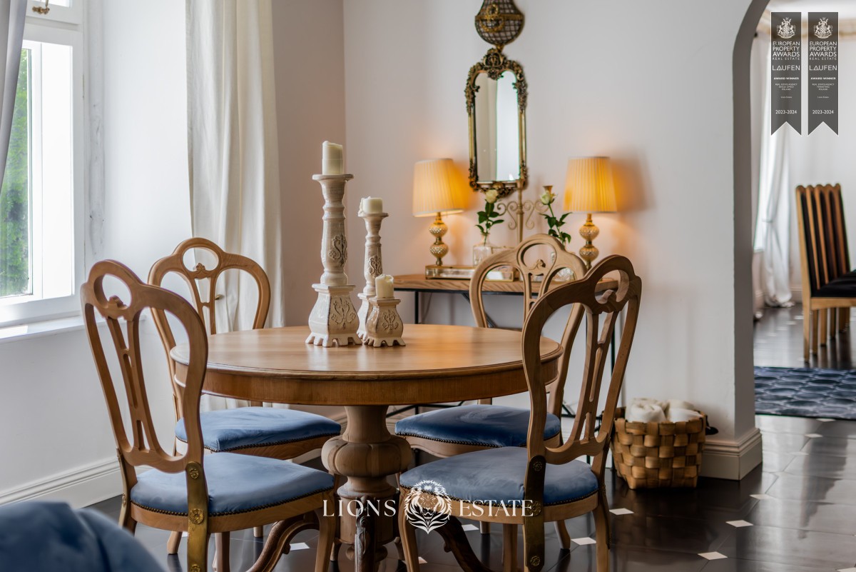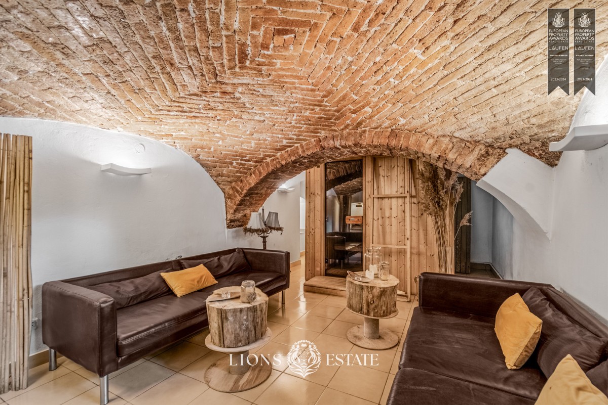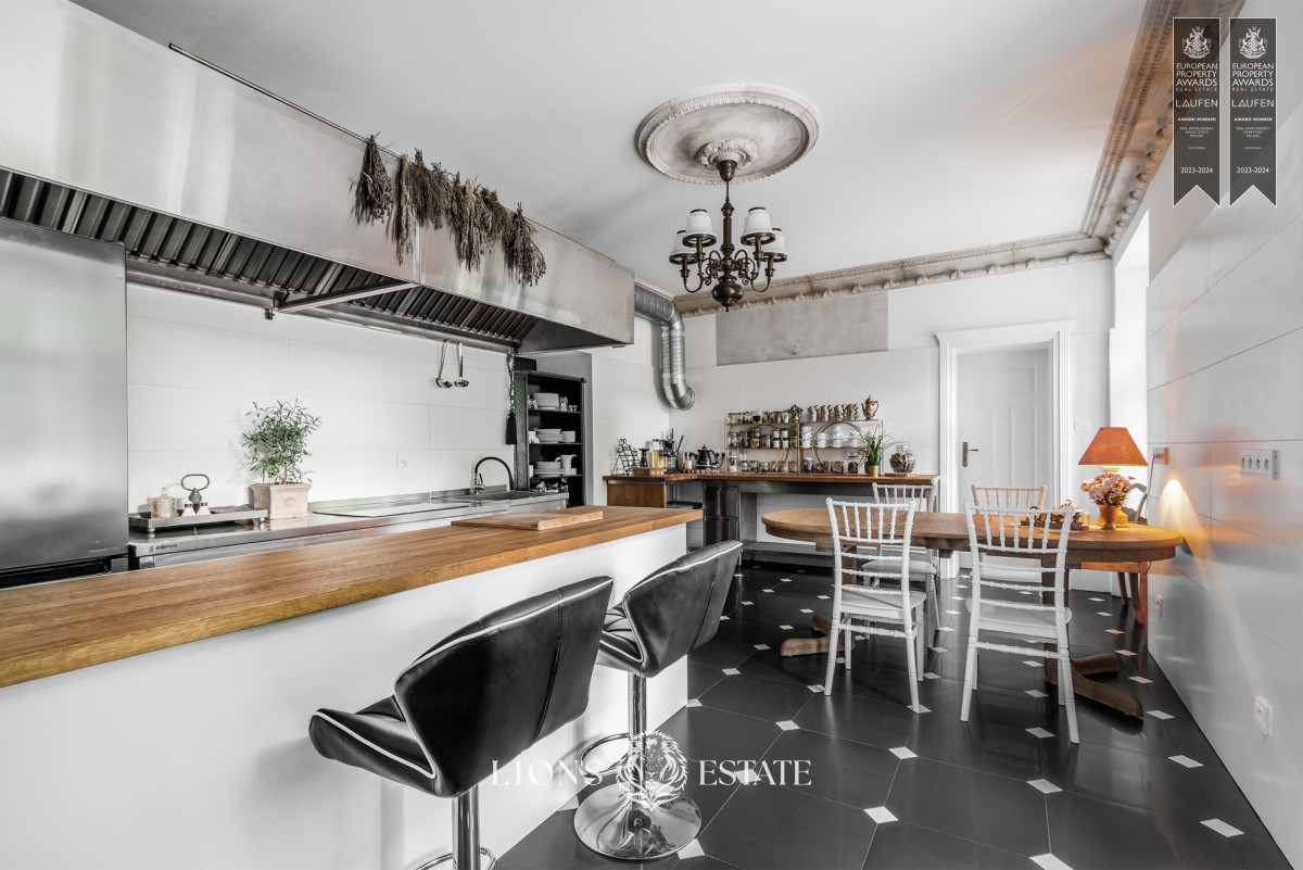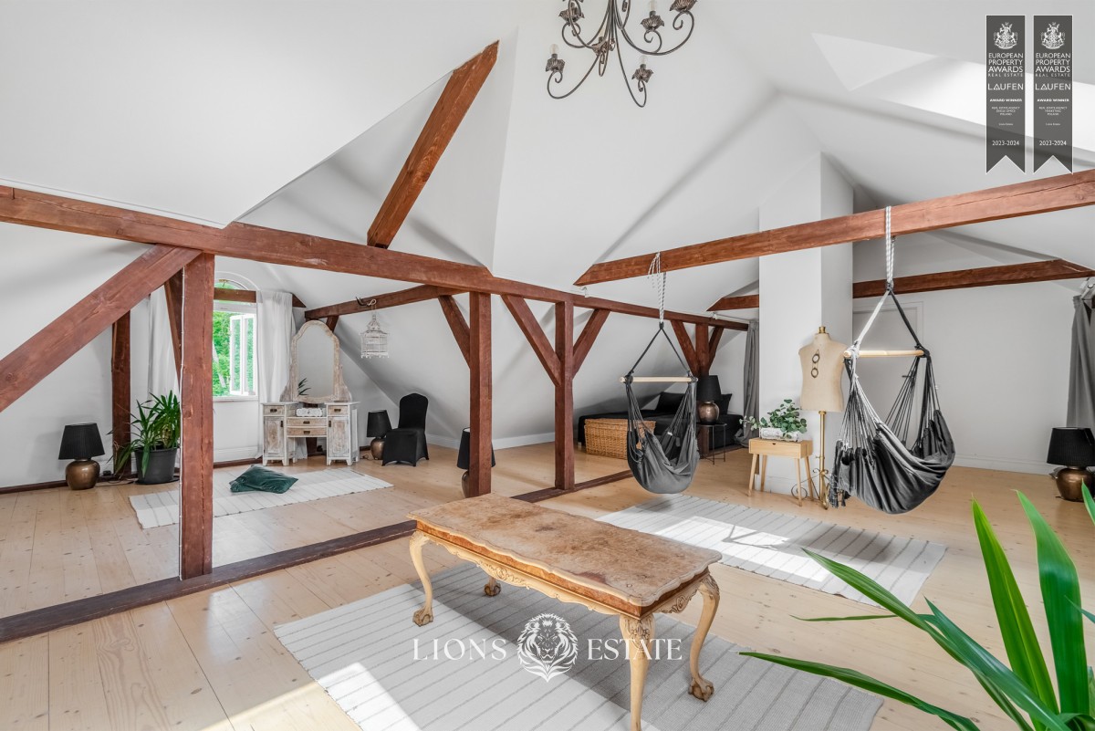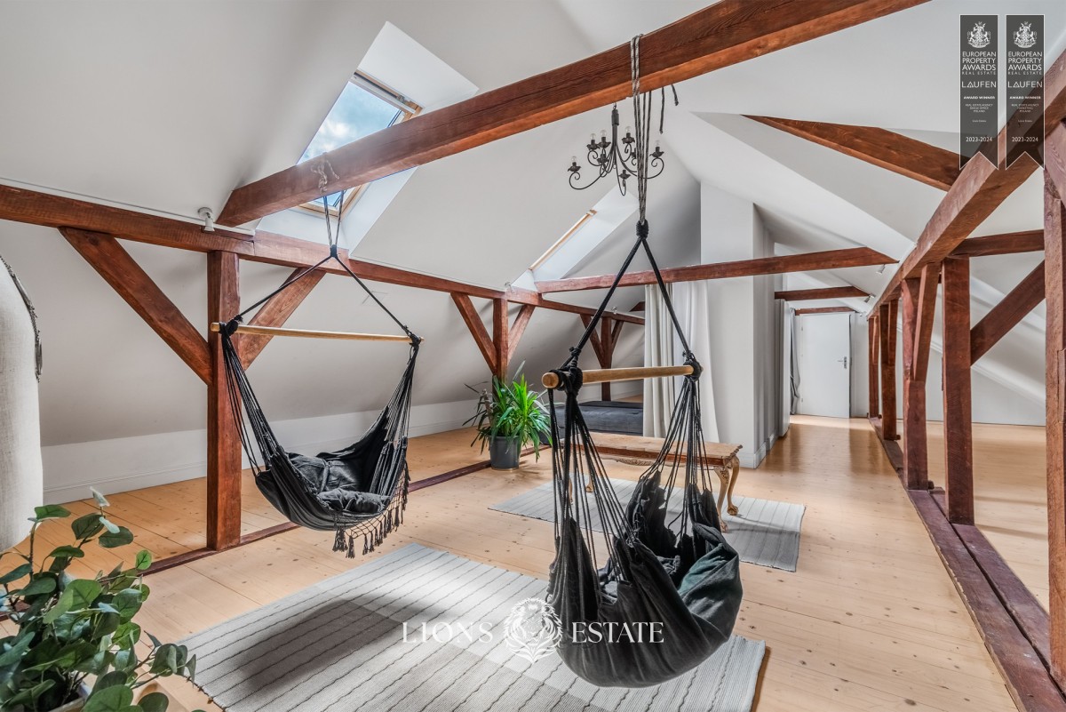 El inmueble se extiende por cuatro niveles: un sótano utilizable, la planta baja, el primer piso y un espacioso desván abierto, ofreciendo una impresionante superficie habitable de 1.000 m². Cuenta con un total de 7 habitaciones, 4 baños, un aseo para invitados, dos salones (uno de los cuales se puede adaptar a gustos personales), dos cocinas totalmente equipadas y un elegante comedor. Entre las comodidades adicionales se incluyen una sauna seca, una gran mesa para ocasiones festivas en el sótano restaurado, y una acogedora chimenea.