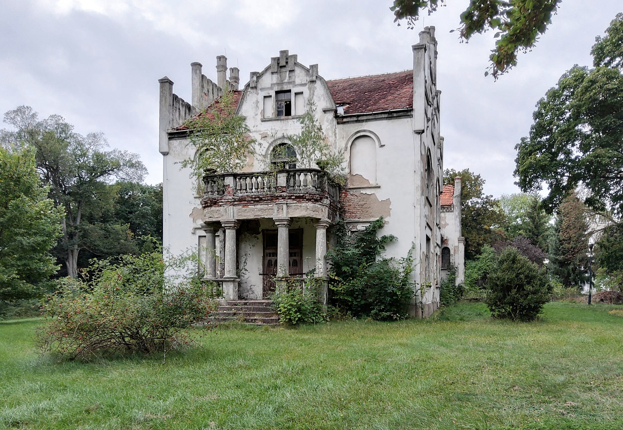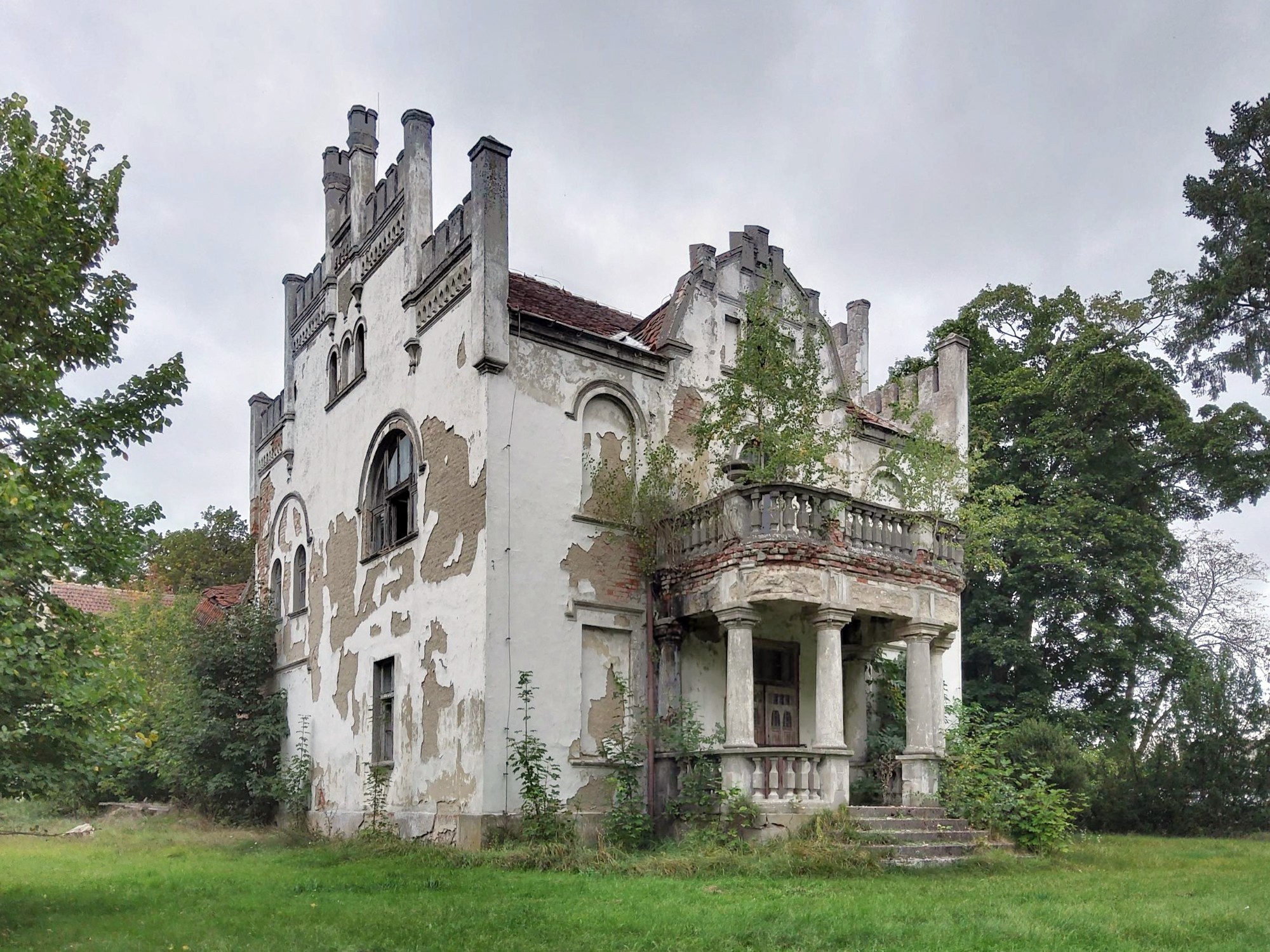 La antigua casa señorial se encuentra en el municipio de Piotrowo, a 33 km de Poznań y a 6 km de Śrem. La casa data de principios del siglo XIX y fue ampliada posteriormente en estilos ecléctico y neogótico. El estado actual requiere una renovación completa. Todo el conjunto está protegido como patrimonio histórico.