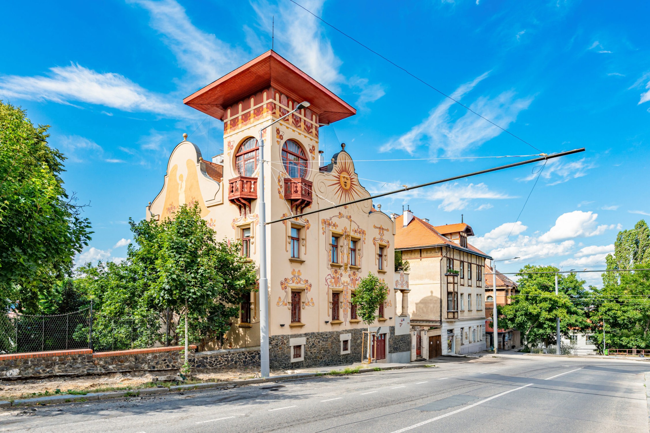 La fachada fue diseñada y decorada por el destacado pintor académico František Kobliha. Su ornamentación incluye frescos, detalles decorativos, una figura de ángel y un reloj solar, todo en la estética más pura del Art Nouveau.