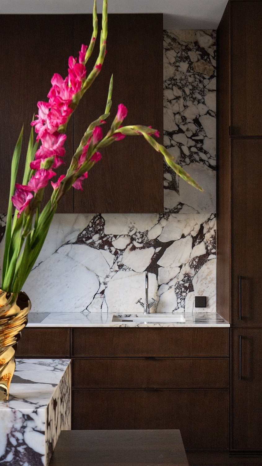 El salón se divide en zona de estar y zona de comedor-cocina con mesa para cuatro a seis personas. La cocina está equipada con mobiliario oscuro y encimera de piedra; electrodomésticos: placa de inducción, lavavajillas, frigorífico-congelador, horno y campana extractora. Desde el salón se accede a la terraza acristalada orientada al sol.