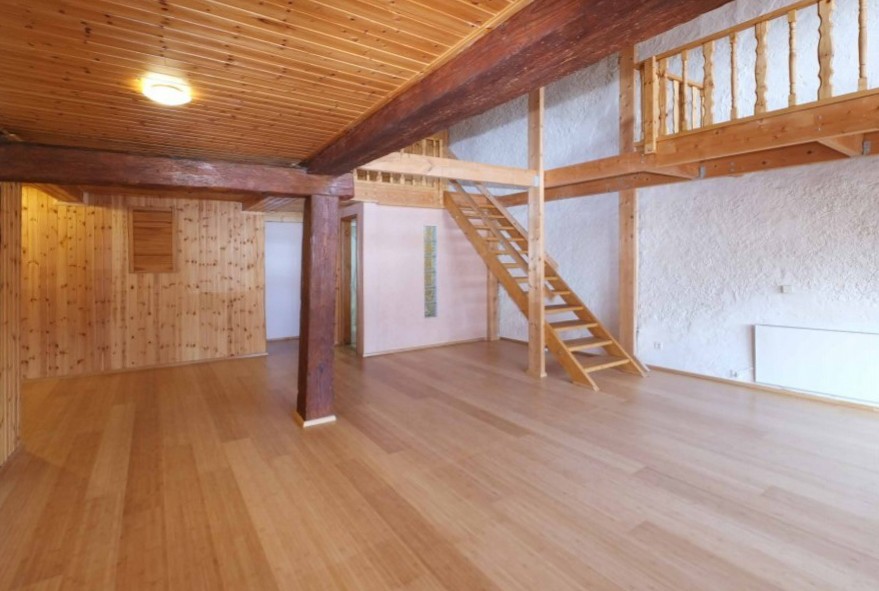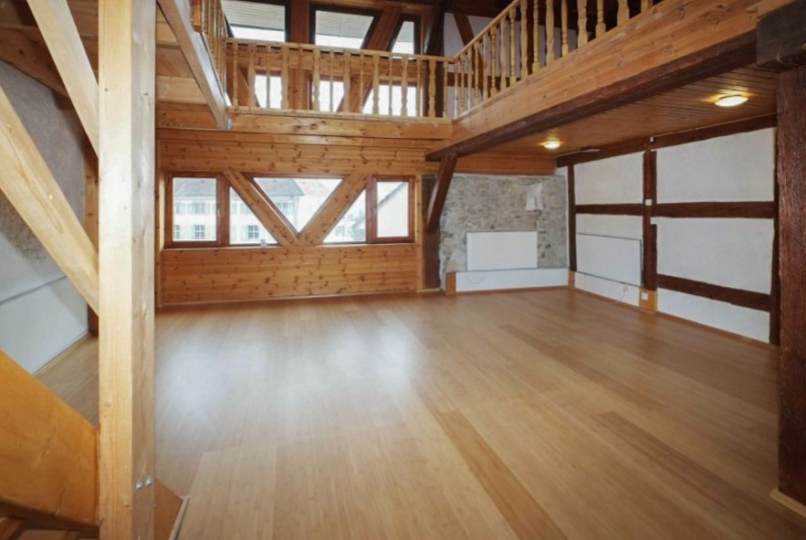 La ubicación ofrece un equilibrio poco común: tranquila pero céntrica, a pocos pasos de tiendas, estación de tren, paradas de autobús, escuelas y jardines de infancia. La salida cercana a la autopista A3 permite desplazamientos rápidos a Basilea y Zúrich. El antiguo establo impresiona con techos de cuatro metros de altura, creando un ambiente abierto y sorprendente. Además, cuenta con un pequeño jardín de fácil mantenimiento y un balcón orientado al oeste que recibe el sol de la tarde. El inmueble dispone de aparcamiento para tres vehículos: dos bajo cubierta y uno descubierto para invitados.