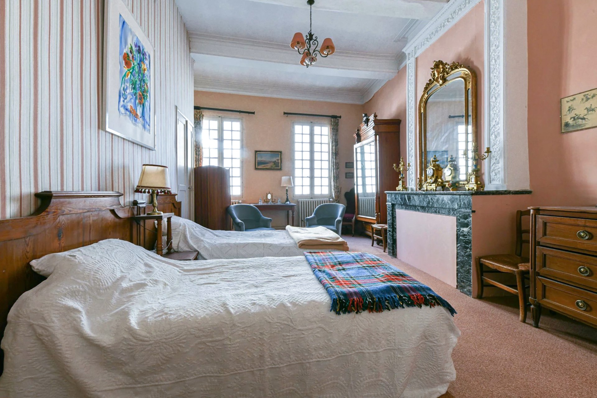 La primera planta cuenta con biblioteca, comedor y cocina conectados a través del rellano de la escalera. En el lado opuesto hay un salón con chimenea y dos dormitorios (18 y 25 metros cuadrados), cada uno con su propio baño.