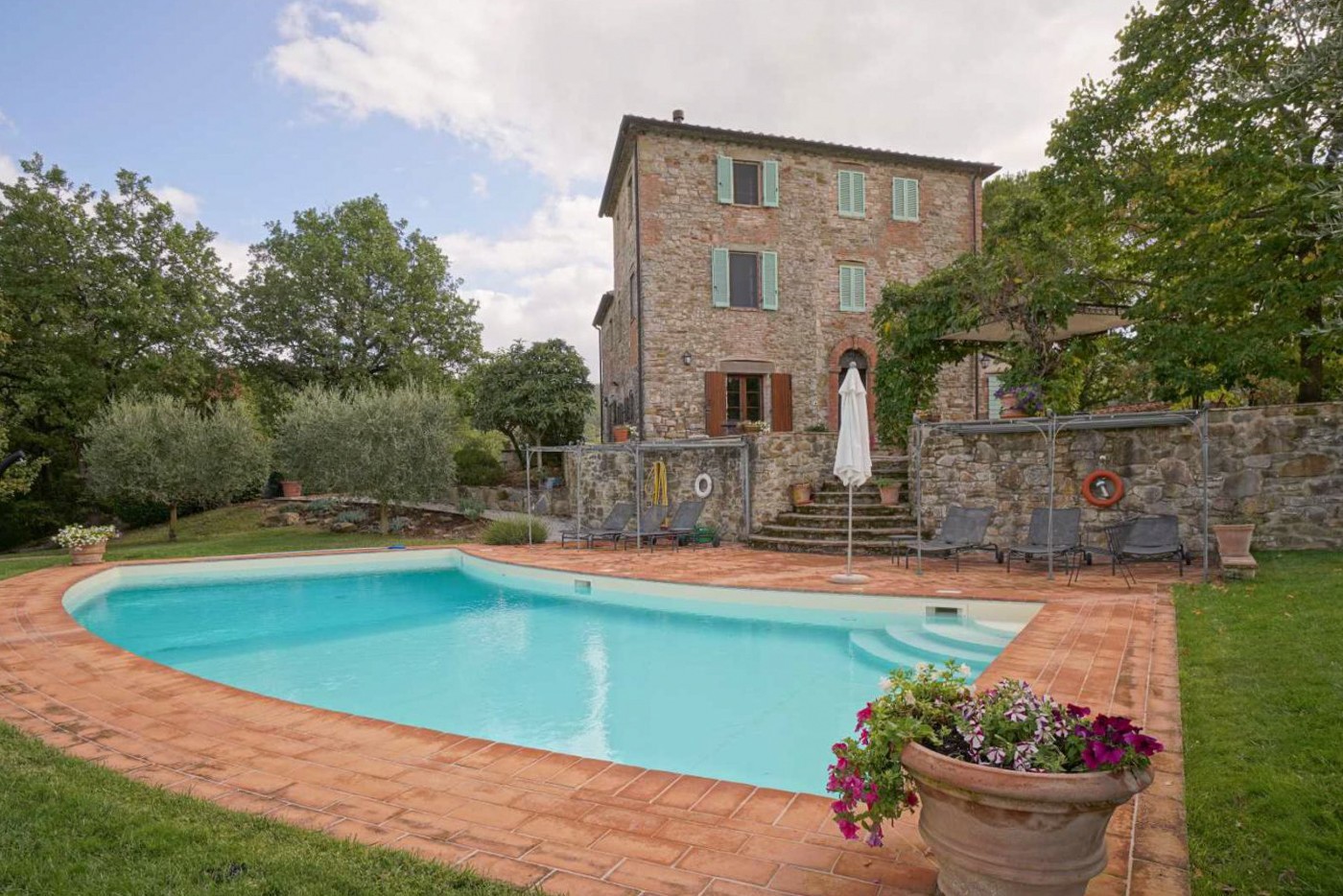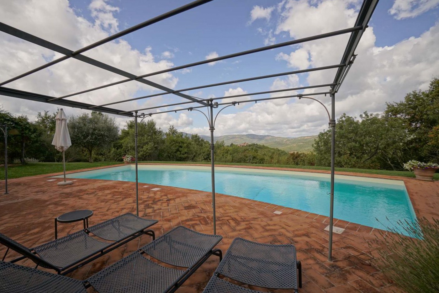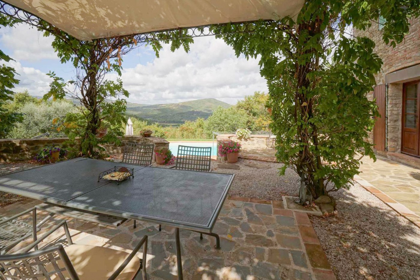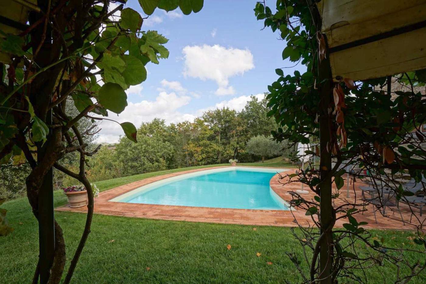 Desde el comedor se accede al patio trasero, donde una piscina de forma curva ofrece una hermosa vista panorámica del valle de Niccone. Los azulejos alrededor de la piscina han sido renovados y ampliados, creando un espacio adicional para el relax.