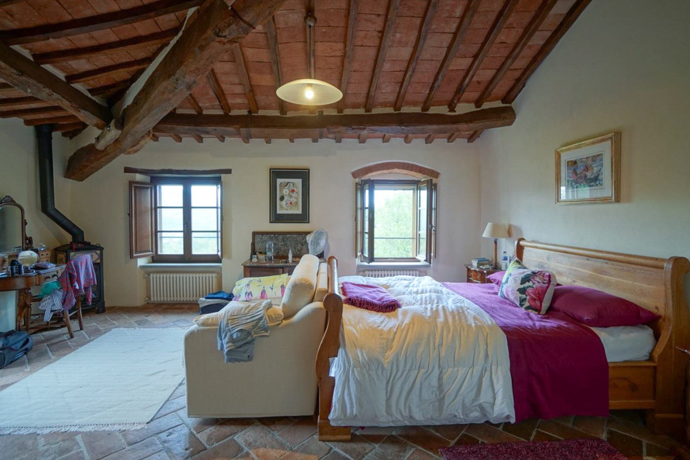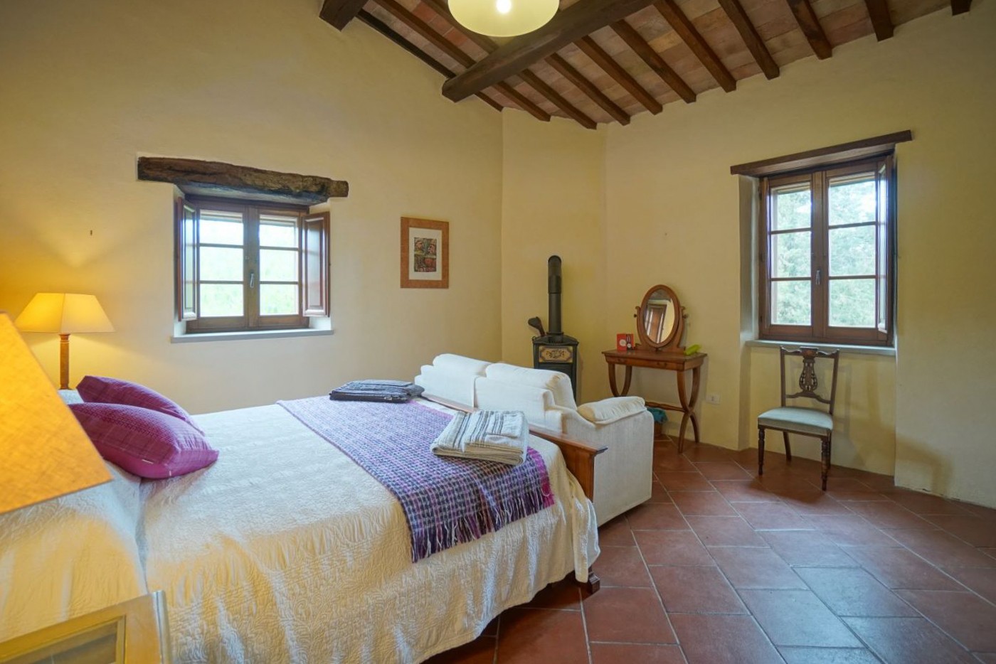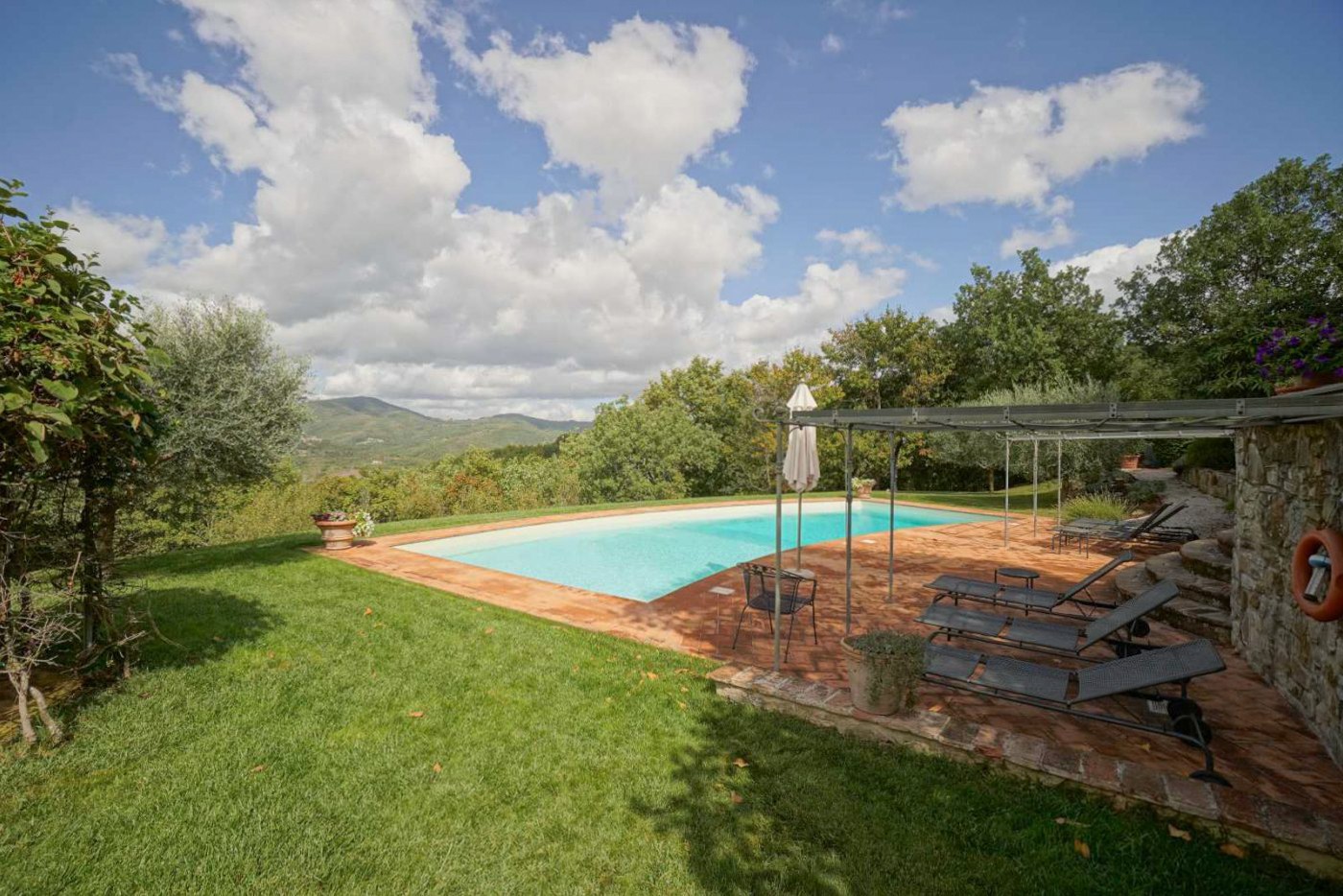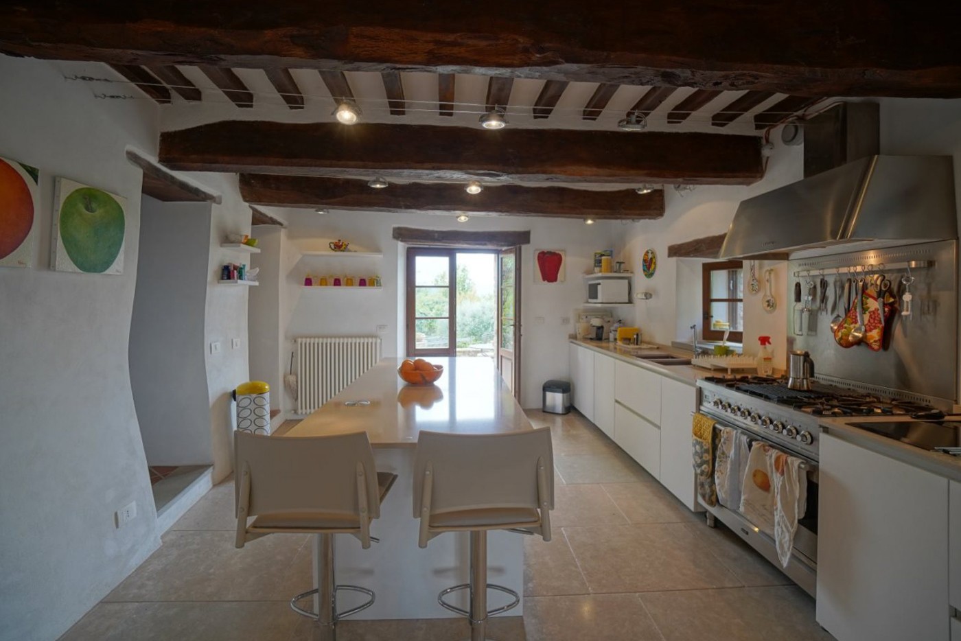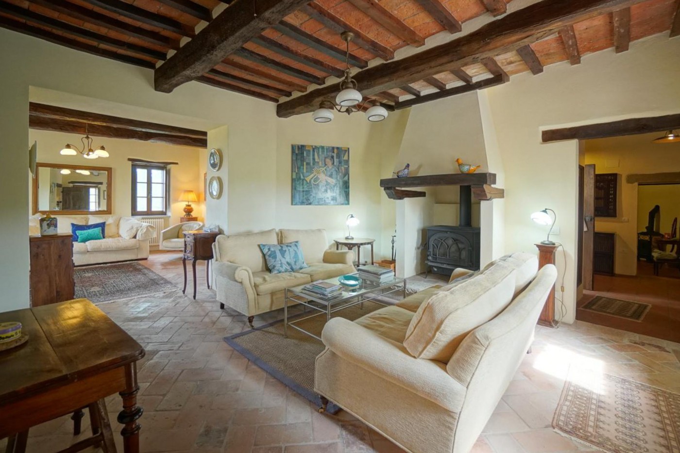 Desde el comedor se accede al patio trasero, donde una piscina de forma curva ofrece una hermosa vista panorámica del valle de Niccone. Los azulejos alrededor de la piscina han sido renovados y ampliados, creando un espacio adicional para el relax.