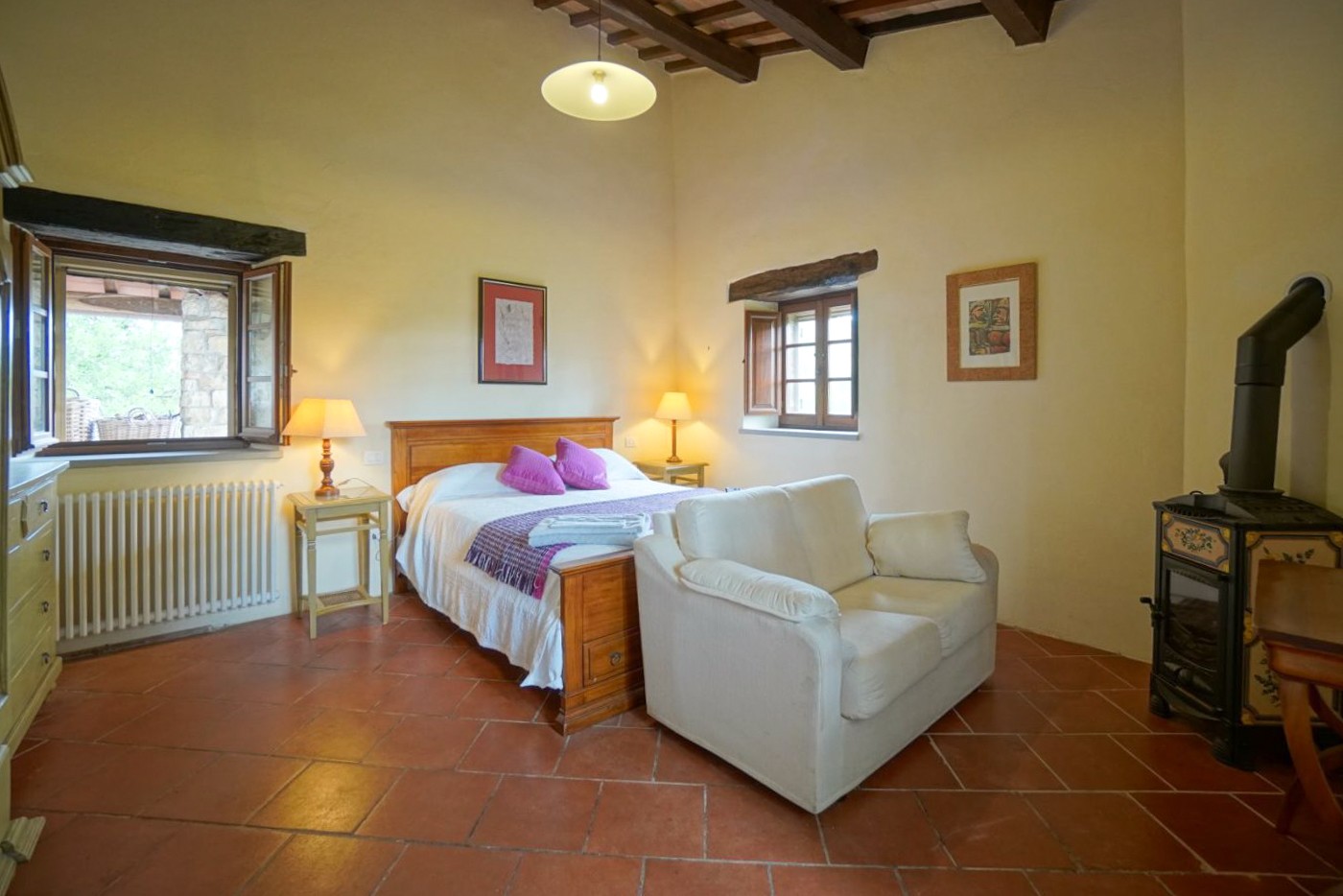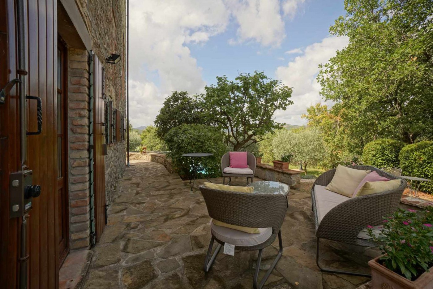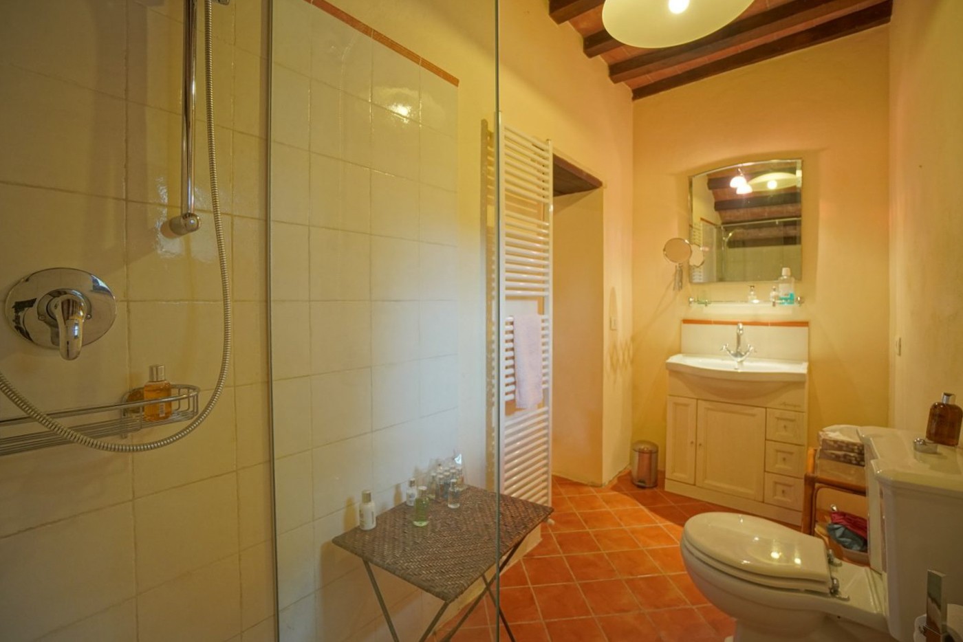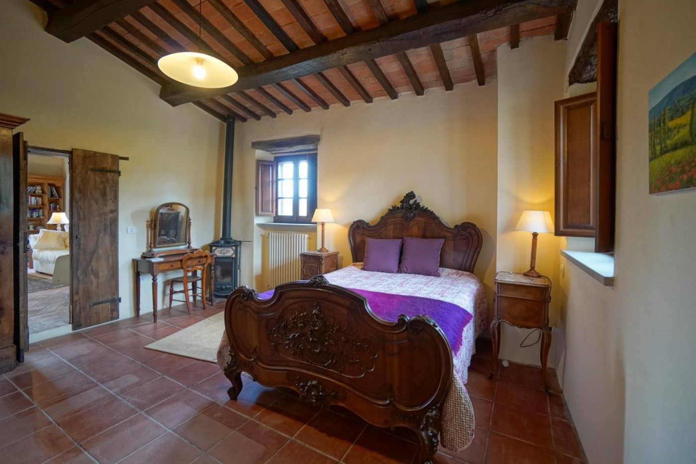 Desde el comedor se accede al patio trasero, donde una piscina de forma curva ofrece una hermosa vista panorámica del valle de Niccone. Los azulejos alrededor de la piscina han sido renovados y ampliados, creando un espacio adicional para el relax.